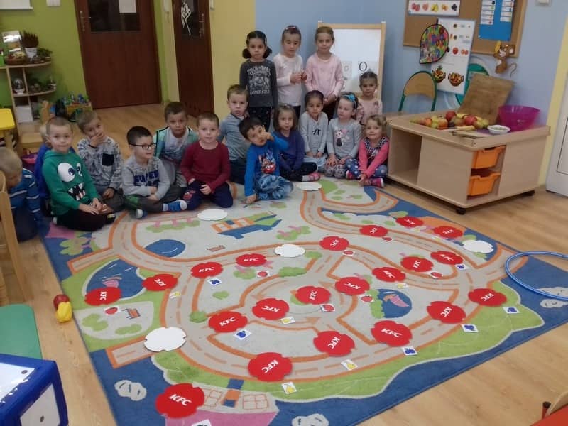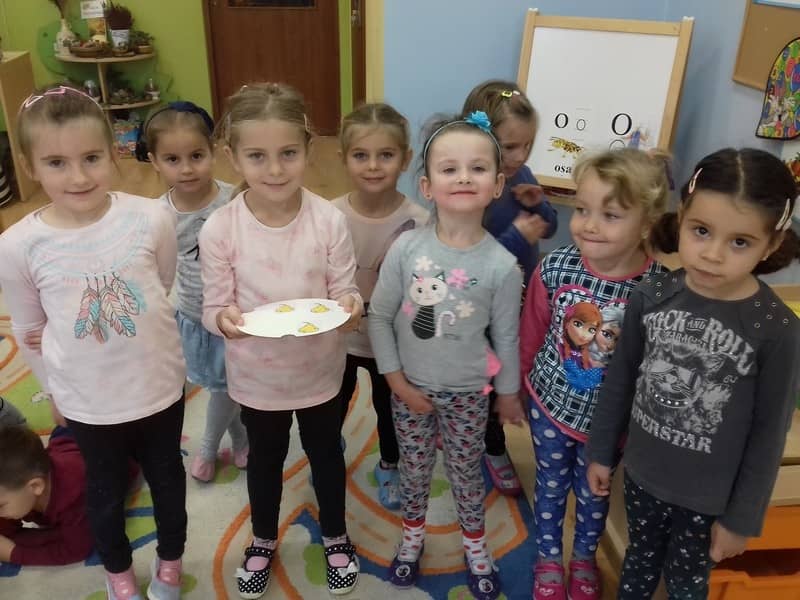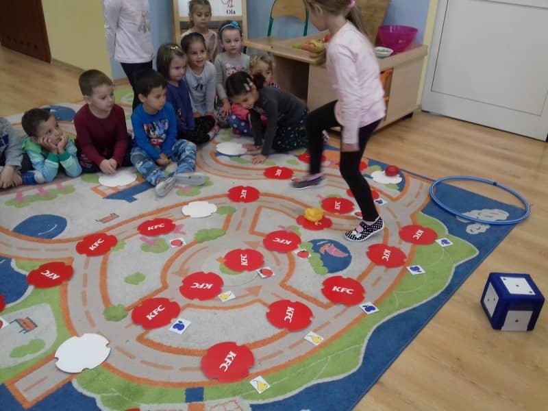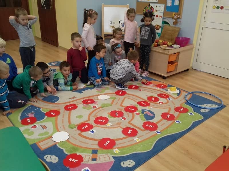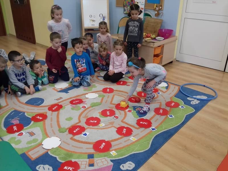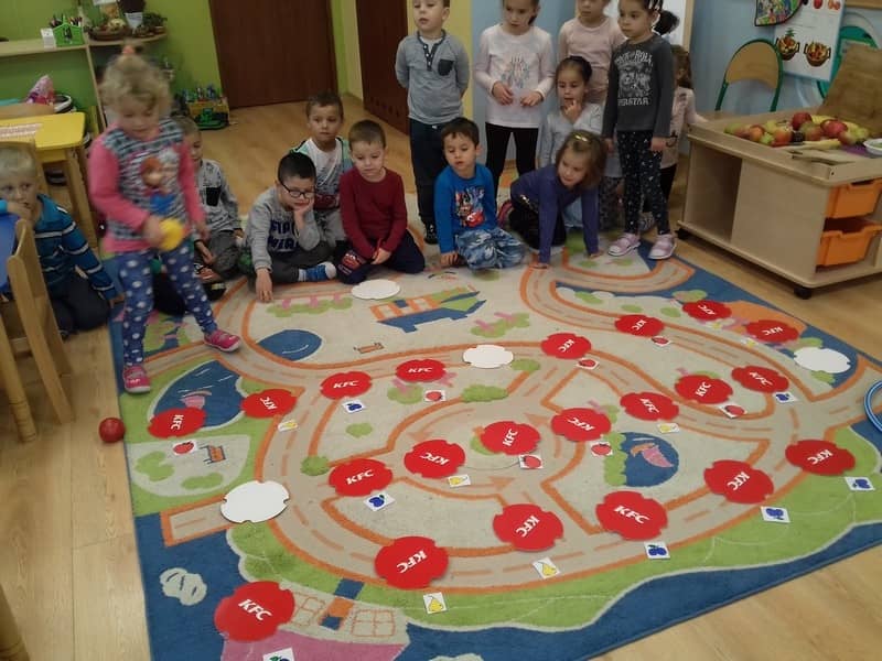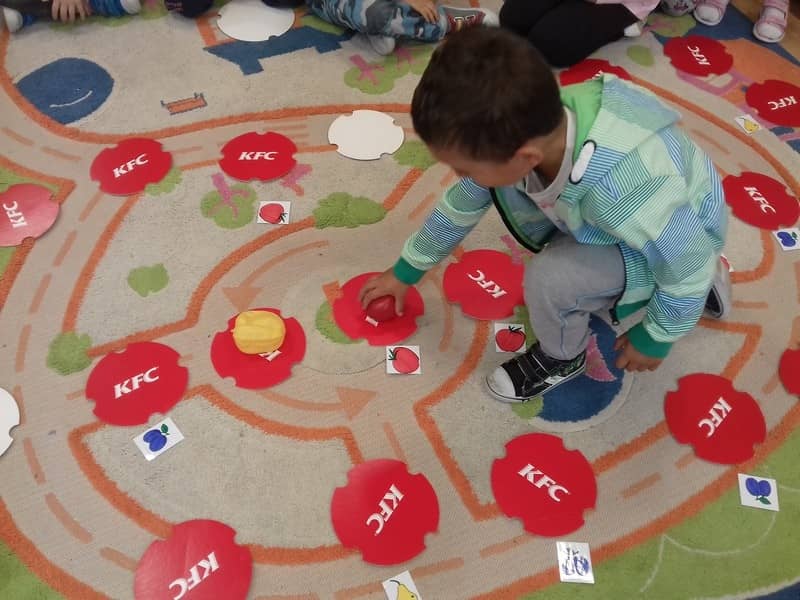 Przedszkolaki z grupy Pracowitych Pszczółek brały udział w grze matematycznej, z podziałem na dwie drużyny - dziewczynki i chłopcy. Zadaniem każdej grupy było zebrać jak najwięcej owoców. Kolejno każdy z grupy rzucał kostką, poruszał "owocowy" pionek na polach i zdobywał owoc dla drużyny. Pola jasne oznaczały utratę jednego owocu. Wygrały Dziewczynki, a drużyna Chłopców gratulowała zwycięzcy...