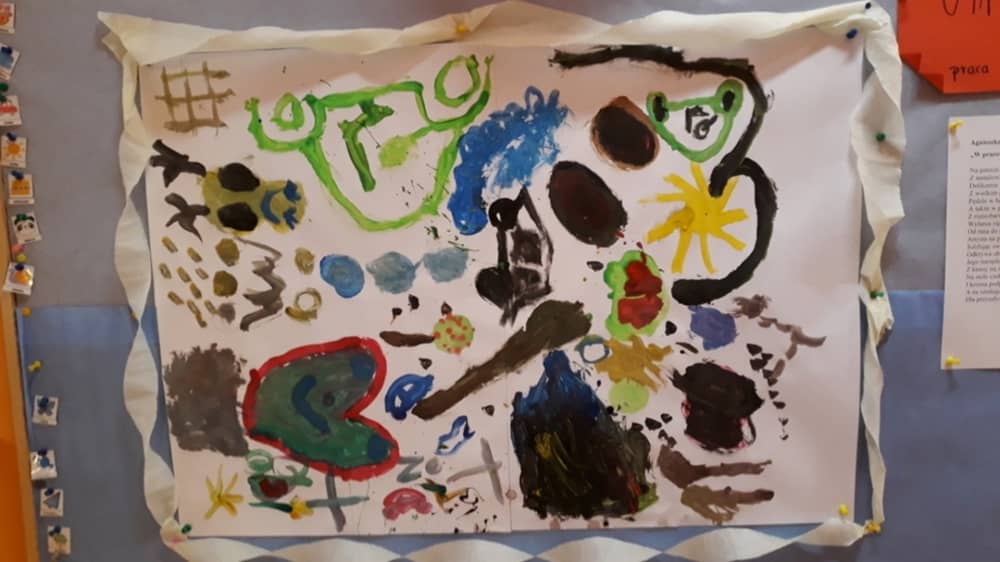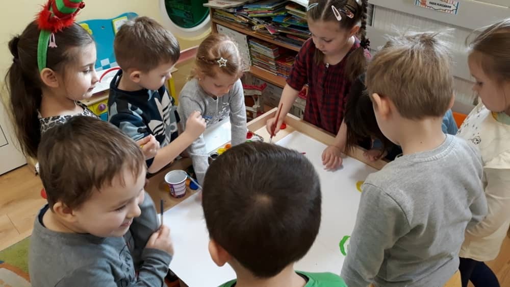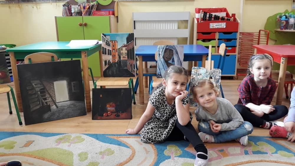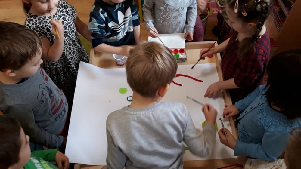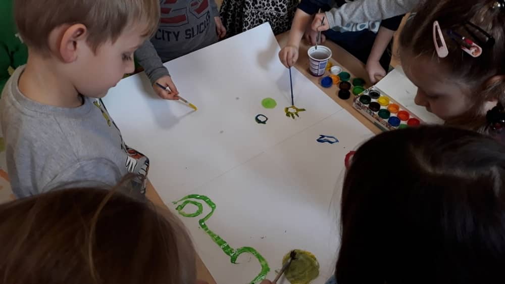 W drugim tygodniu lutego rozmawialiśmy w grupie „Pracowitych Pszczółek” na temat tego jak powstają obrazy i kto może zostać artystą. Dzieci zapoznały się na zajęciach z zawodem artysty malarza, jego warsztatem pracy i technikami malarskimi, które można stosować w malarstwie. Nauczycielka Agnieszka Karcz zaprezentowała im także namalowane przez siebie obrazy i odczytała swój autorski wiersz pt. „W pracowni artysty malarza”. Głównym założeniem było ukazanie dzieciom tego, że każdy może tworzyć, a jego wyobraźnia nie ma granic. Na zakończenie dzieci namalowały farbami wspólną pracę.