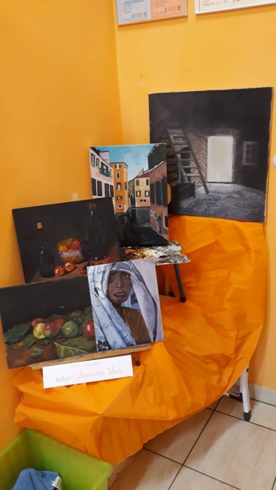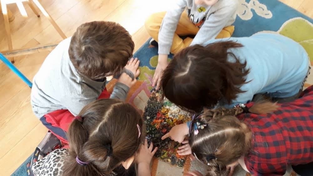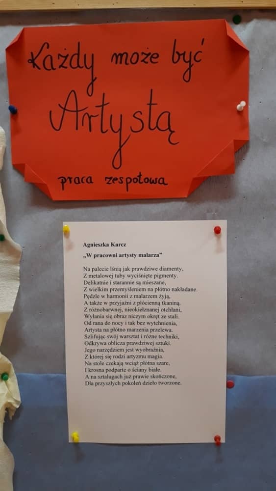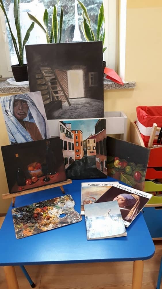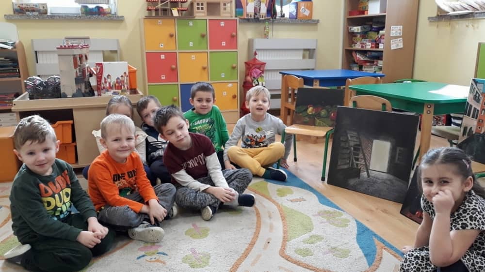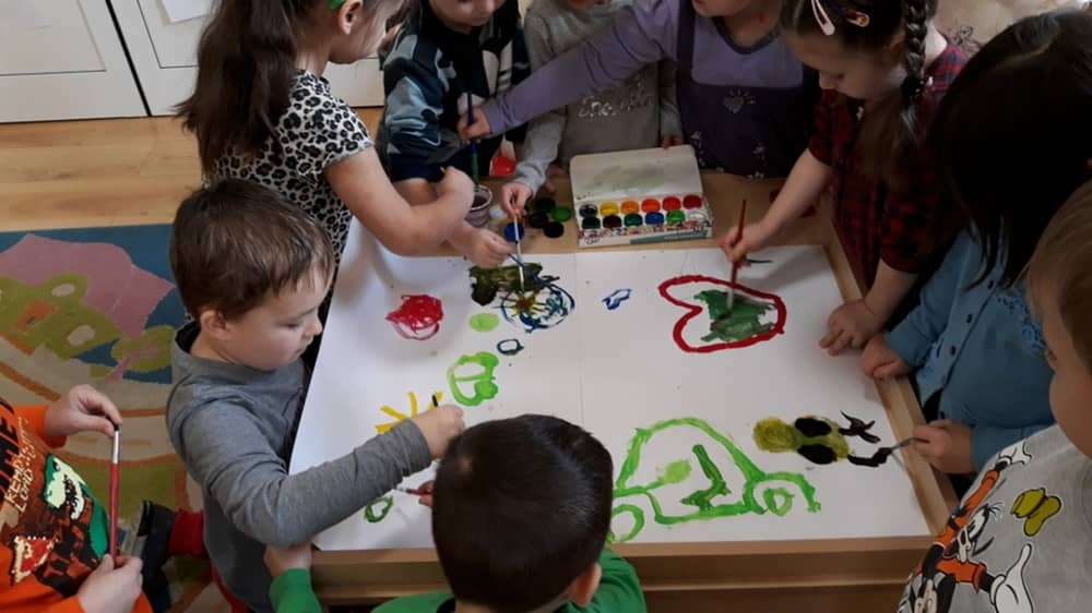 W drugim tygodniu lutego rozmawialiśmy w grupie „Pracowitych Pszczółek” na temat tego jak powstają obrazy i kto może zostać artystą. Dzieci zapoznały się na zajęciach z zawodem artysty malarza, jego warsztatem pracy i technikami malarskimi, które można stosować w malarstwie. Nauczycielka Agnieszka Karcz zaprezentowała im także namalowane przez siebie obrazy i odczytała swój autorski wiersz pt. „W pracowni artysty malarza”. Głównym założeniem było ukazanie dzieciom tego, że każdy może tworzyć, a jego wyobraźnia nie ma granic. Na zakończenie dzieci namalowały farbami wspólną pracę.