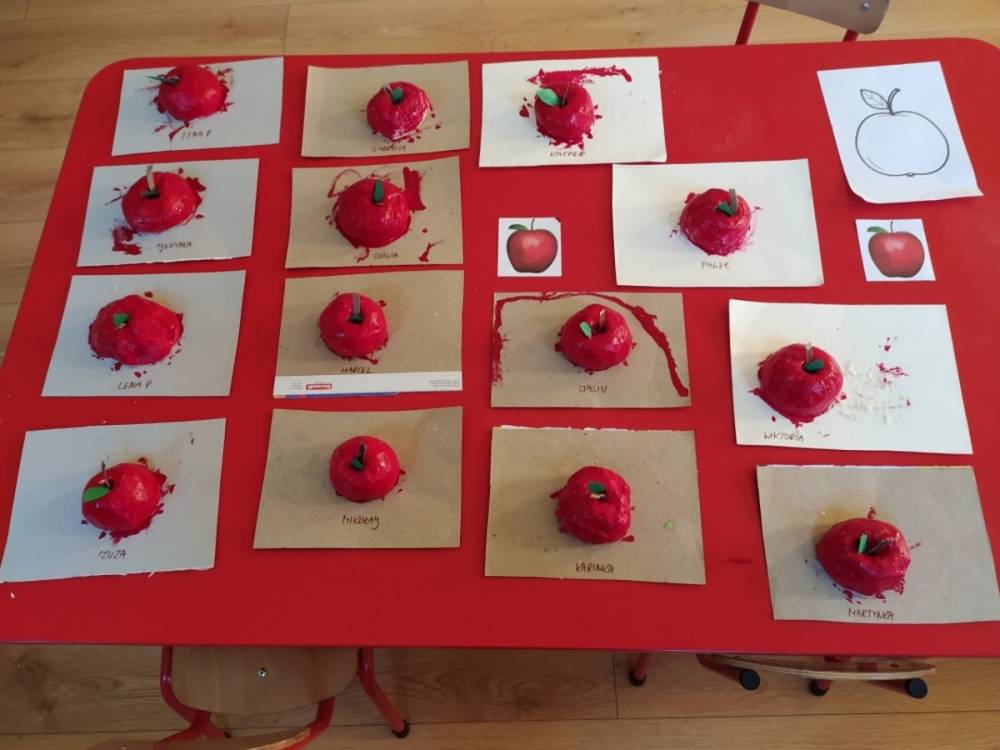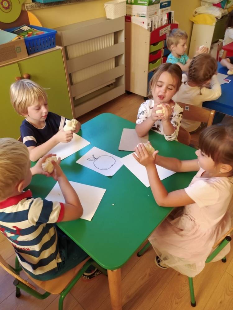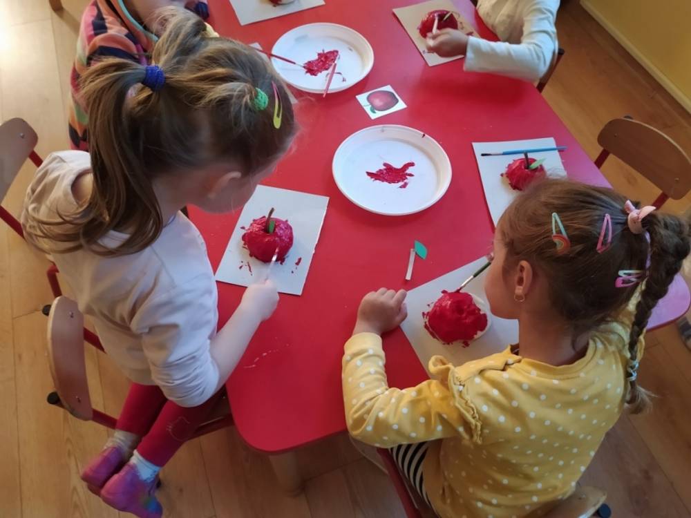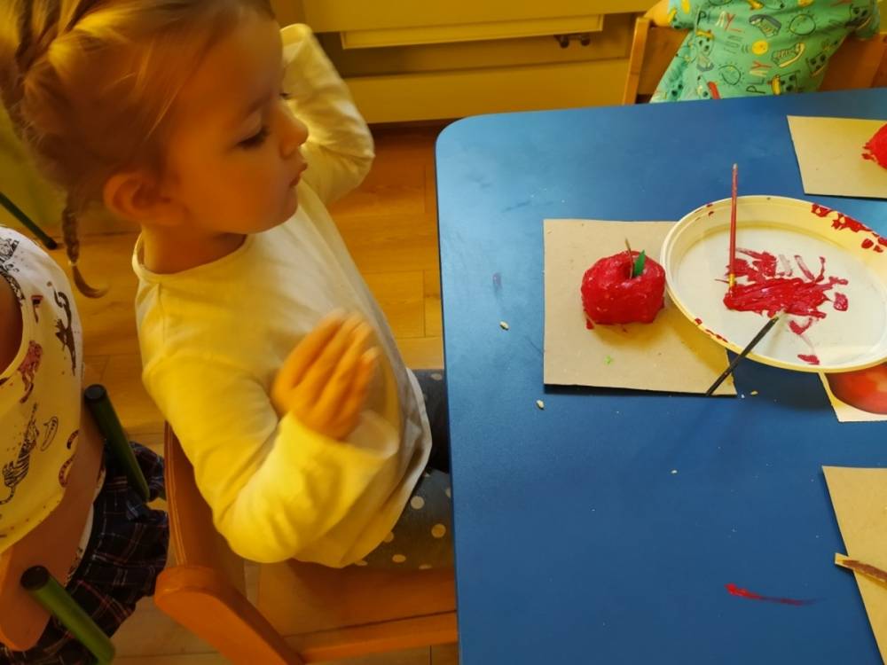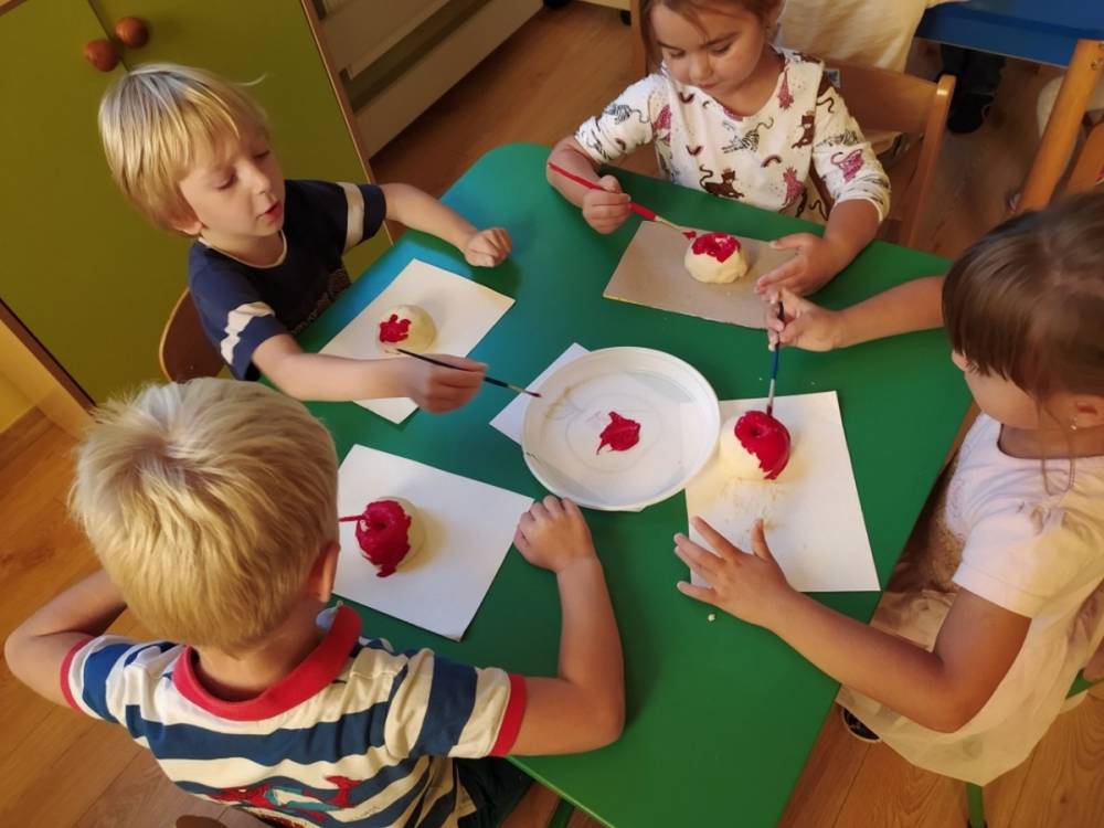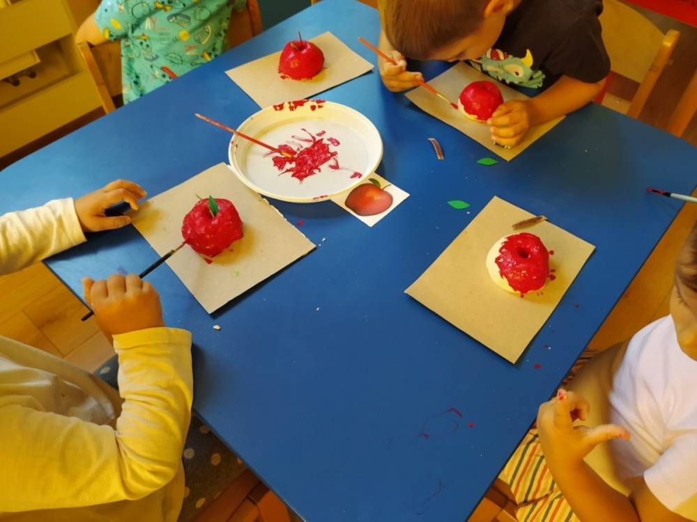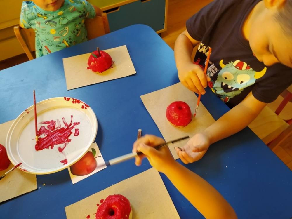 Dzień 25.09.2020 okazał się być naprawdę pracowitym dniem dla „Pracowitych Pszczółek”. Oprócz zajęć sportowych, odbyły się zajęcia plastyczne w trakcie, których dzieci miały okazję lepić z masy solnej piękne rumiane jabłuszka. Efekty ich pracy były wyśmienite- jabłuszka jak malowane, bo właśnie takie były i oczywiście nie zabrakło im ani ogonka, ani listeczka.