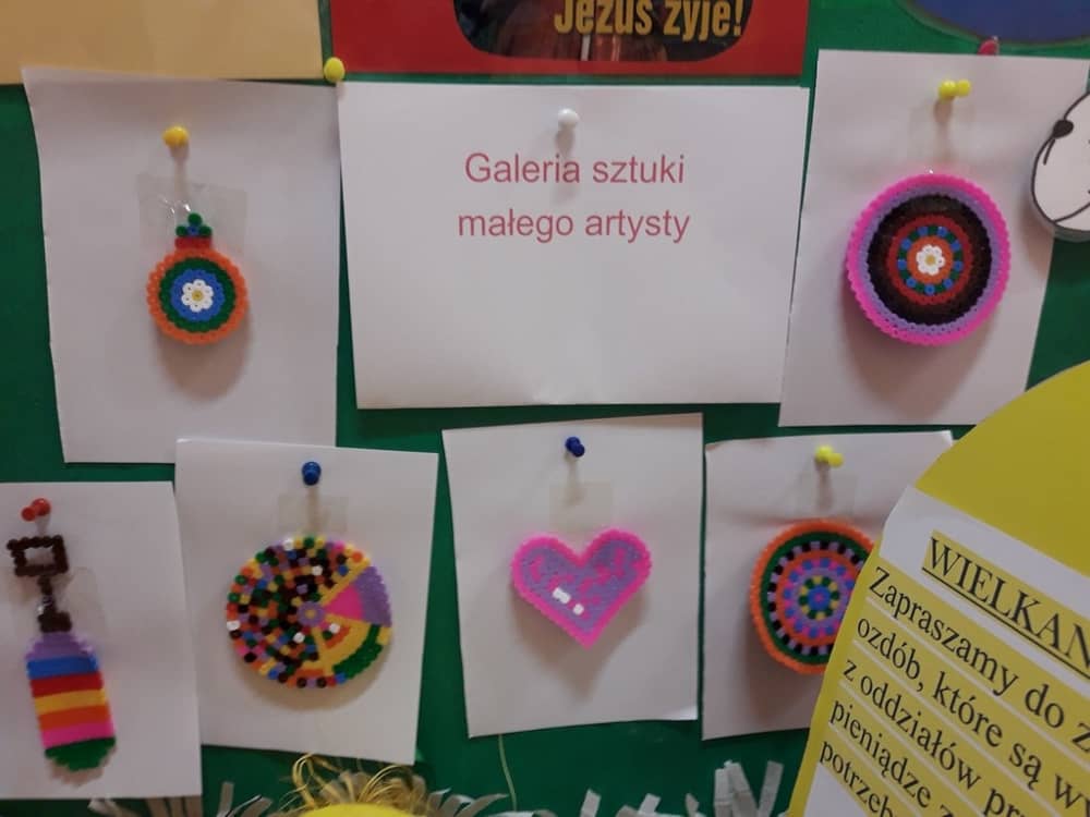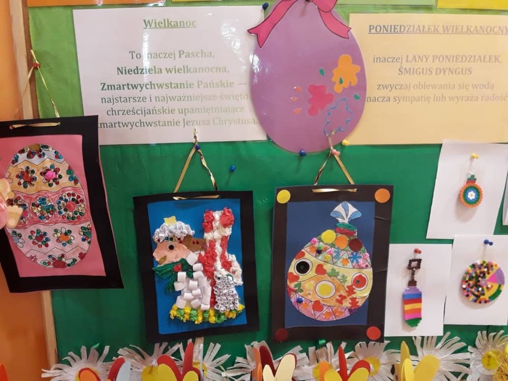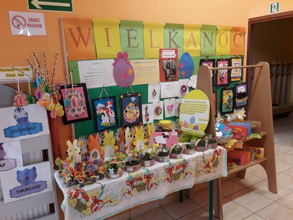 W dniach od 1 do 15 kwietnia odbedzie się Kiermasz Wielkanocny dla Rodzin przedszkolaków. Przez dwa tygodnie były przygotowywane prace plastyczne przez wszystkie dzieci, które wykazały się w tym roku wielkim zapałem do działania i talentem artystycznym. Na wielkanocnym stole nie zabraknie barwnych pisanek, zielonej rzeżuchy, palemek z bibuły, zajączków, zabawnych kurczątek oraz kartek świątecznych, które można wysłać dla rodziny. Dzieci włożyły swoje dobre serduszka i pracowite dłonie m.in. w ułożenie pisanek z koralików pyssli.