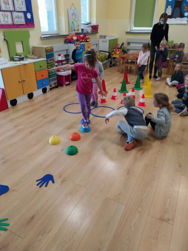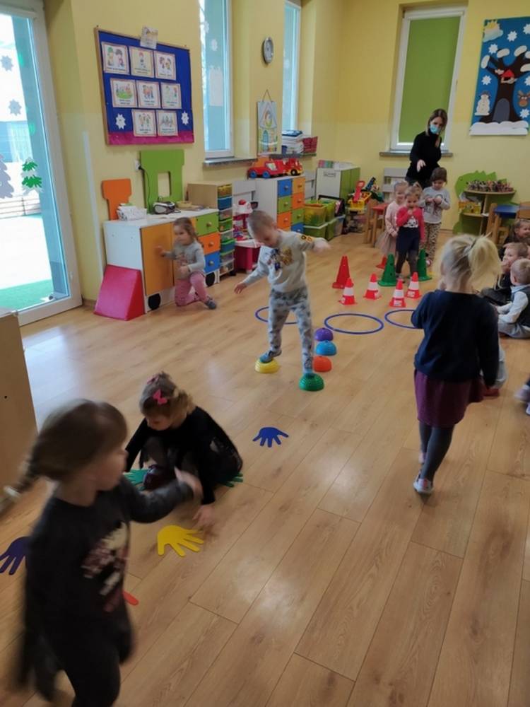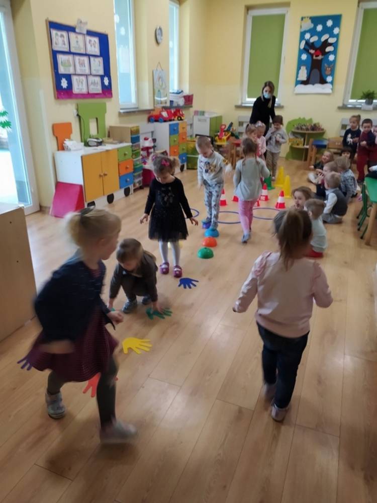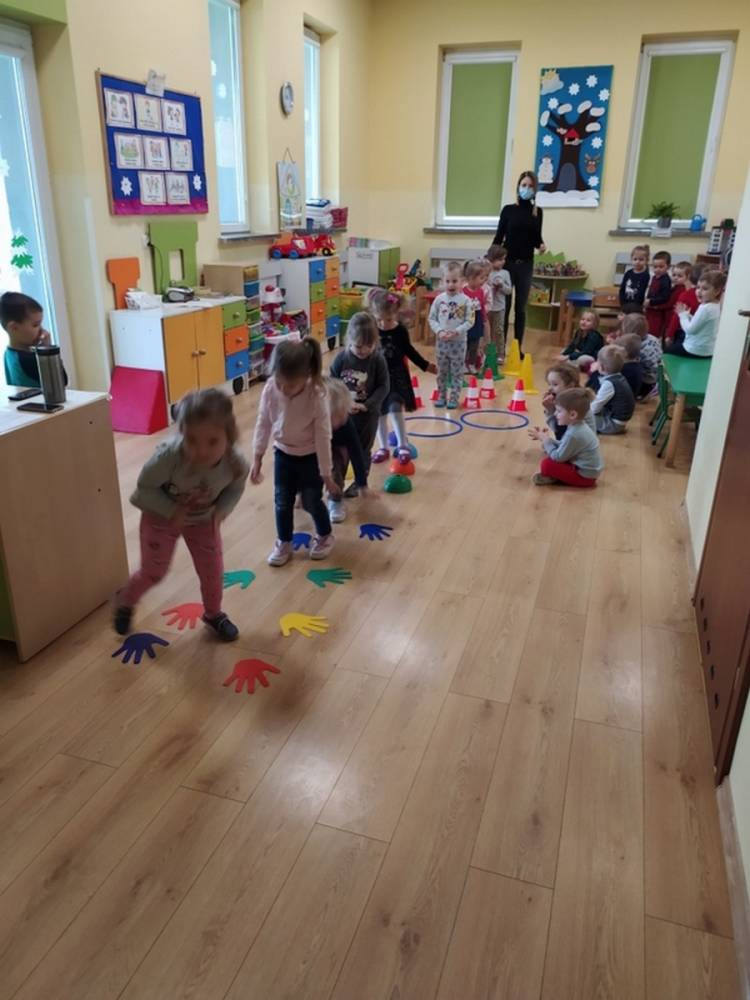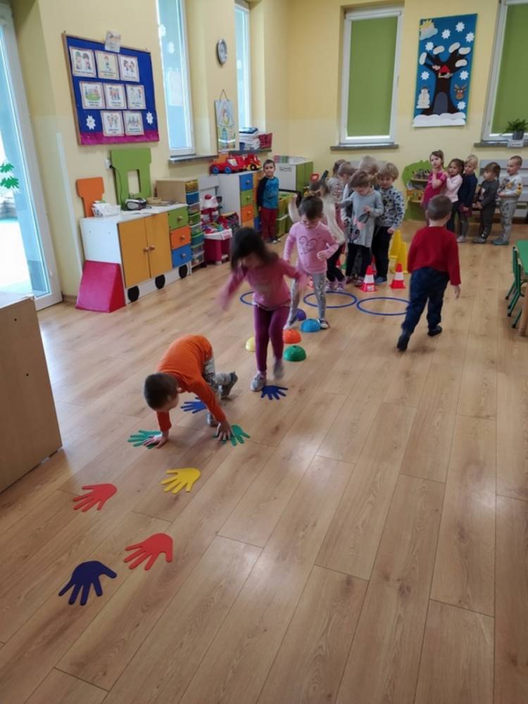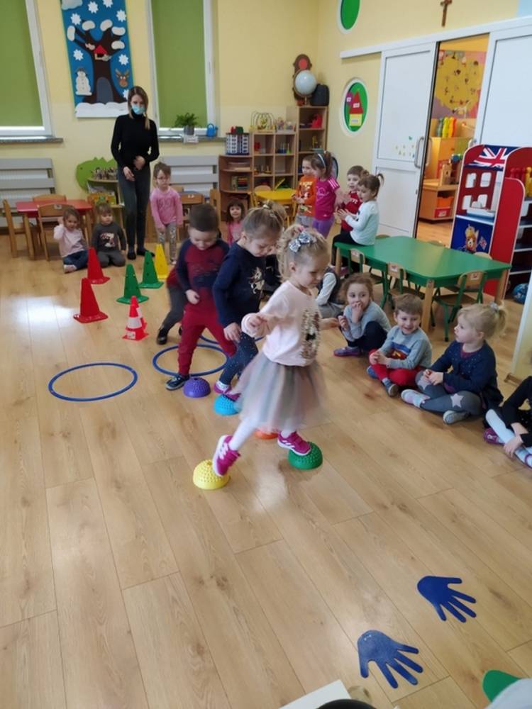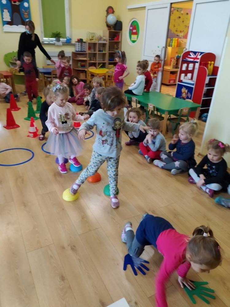 Kolejne zajęcia ruchowe w ramach Akcji „Zdrowo i Sportowo” odbyły się w dniu 25.02.2021. Dzieci tym razem odkrywały krajobrazy Polski. Ćwiczenia i zabawy ruchowe nawiązywały do ciekawych krain geograficznych. Były ćwiczenia wzmacniające mięśnie nóg i rąk, balans ciała i koordynację wzrokowo-ruchową. Każdy przedszkolak dzielnie pokonywał przeszkody i starał się ćwiczyć na miarę swoich możliwości.