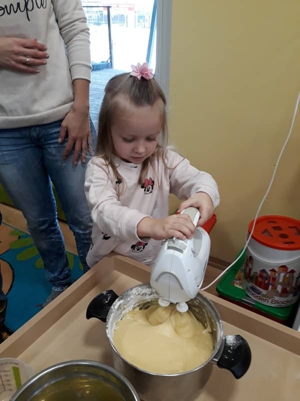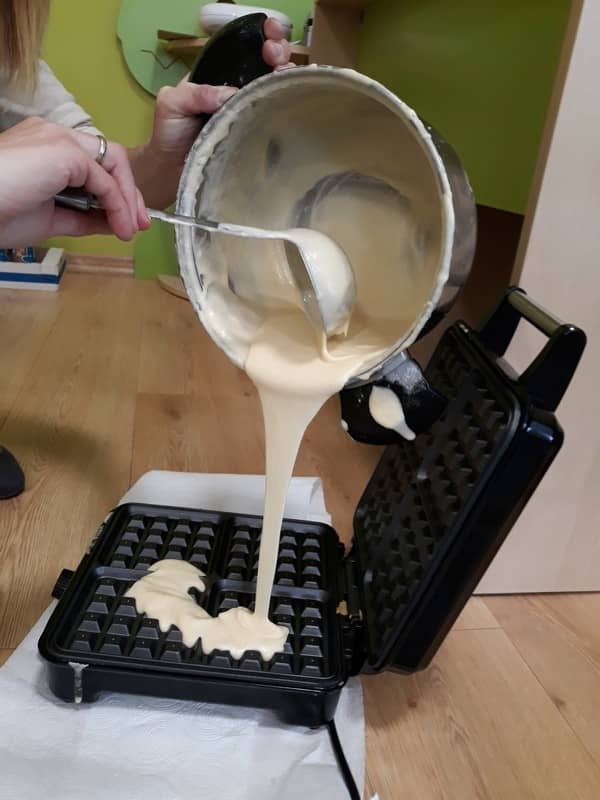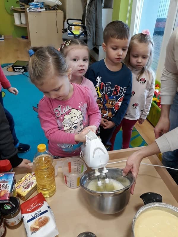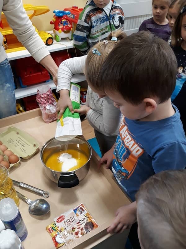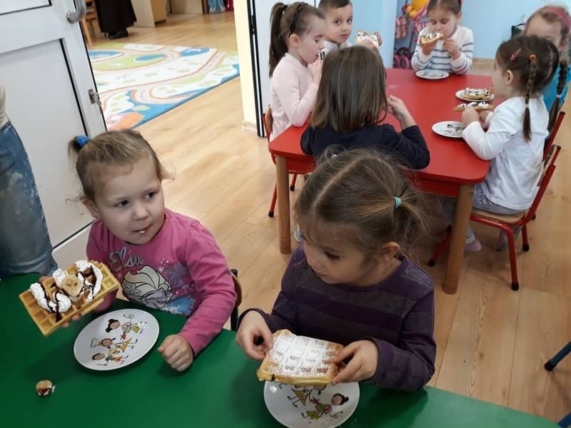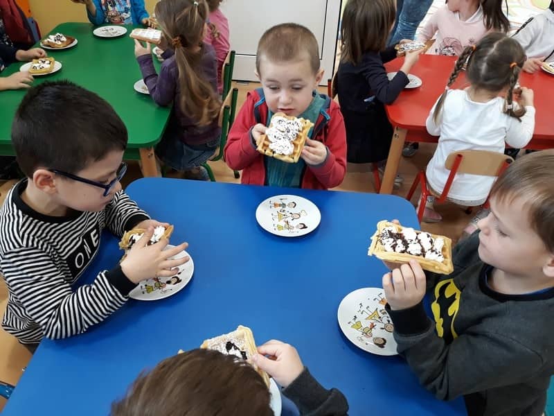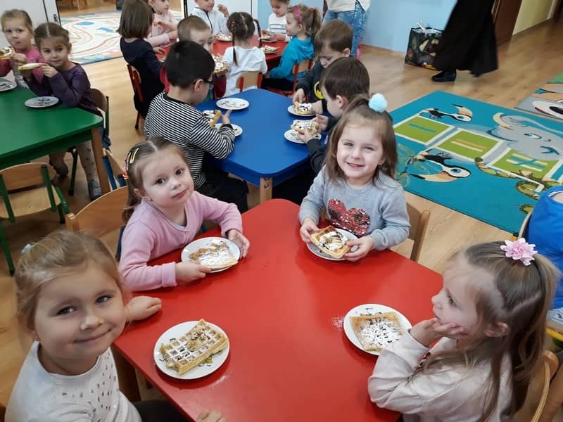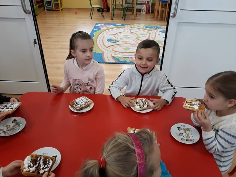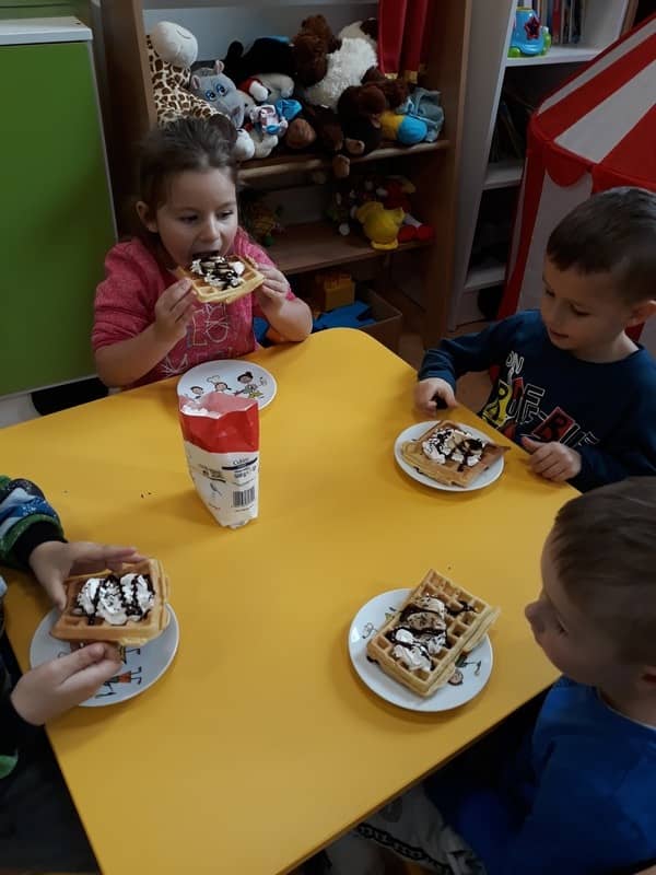 Dzieci z grupy „Tygryski” oraz „Pracowite pszczółki” zamieniły się w kucharzy. Przedszkolaki z pomocą pań przygotowały pyszne gofry. Dzieci chętnie pomagały w przygotowaniu ciasta na gofry, następnie oczekiwały aż gofry upieką się w gofrownicy. Przedszkolaki samodzielnie ozdabiały swoje gofry bitą śmietaną, cukrem pudrem, polewami oraz owocami. W tym dniu było bardzo pysznie.