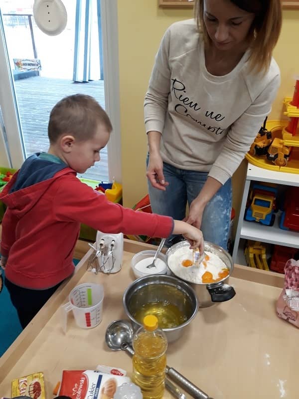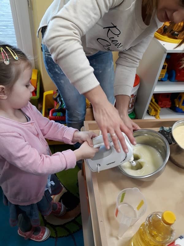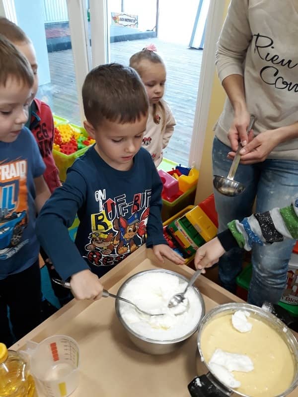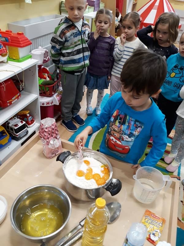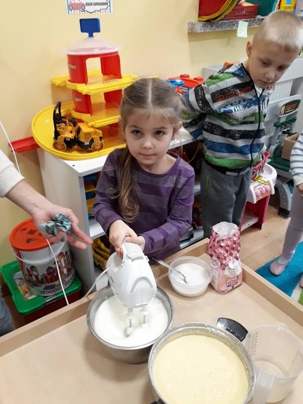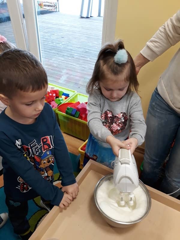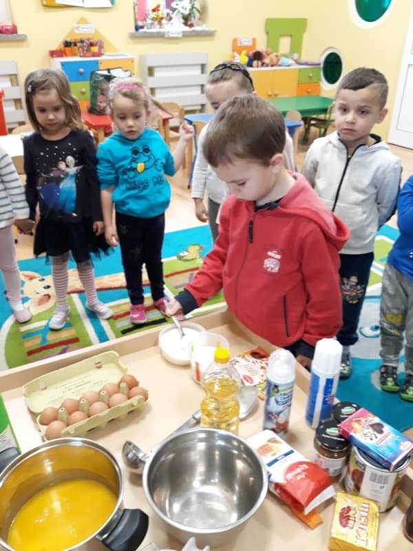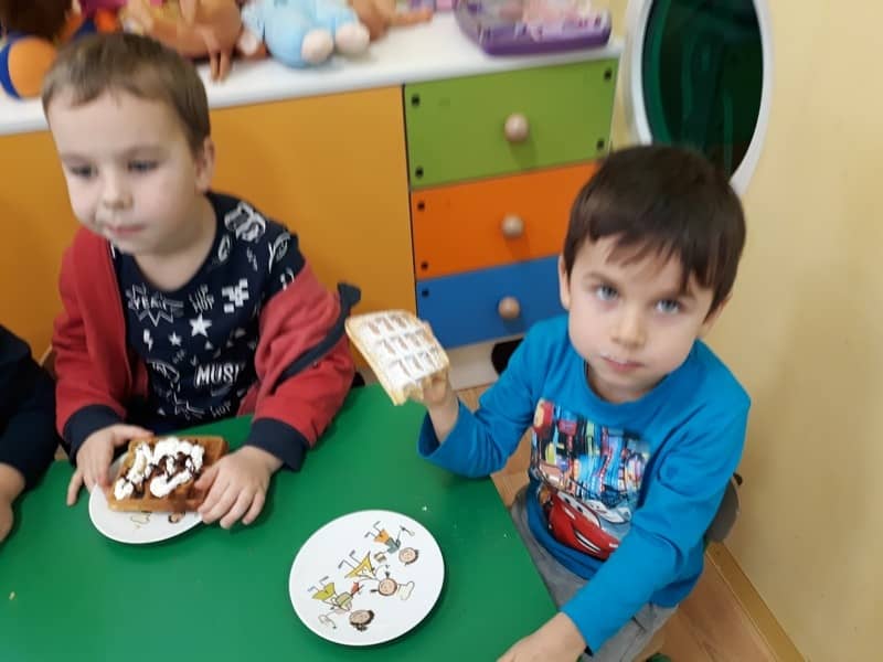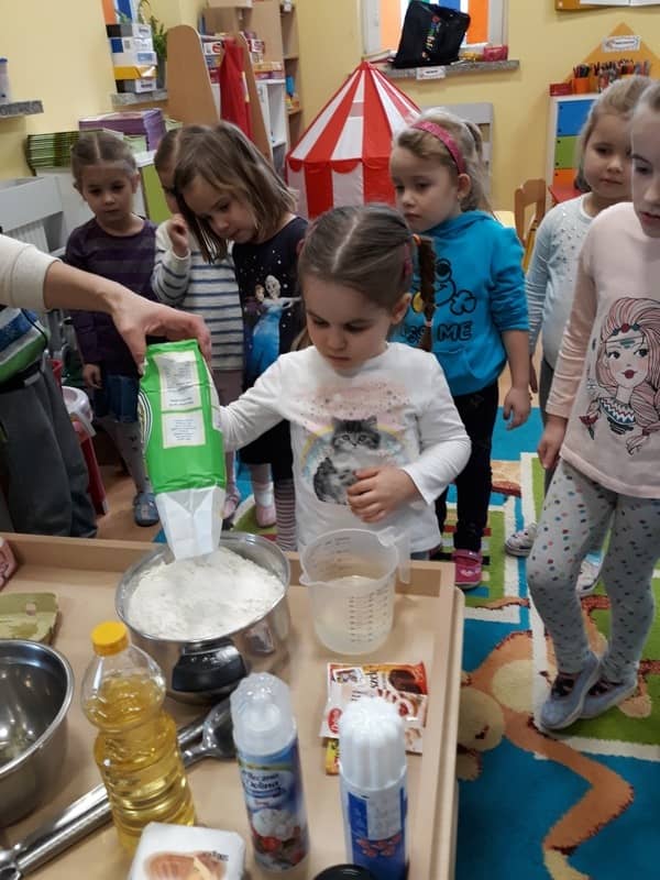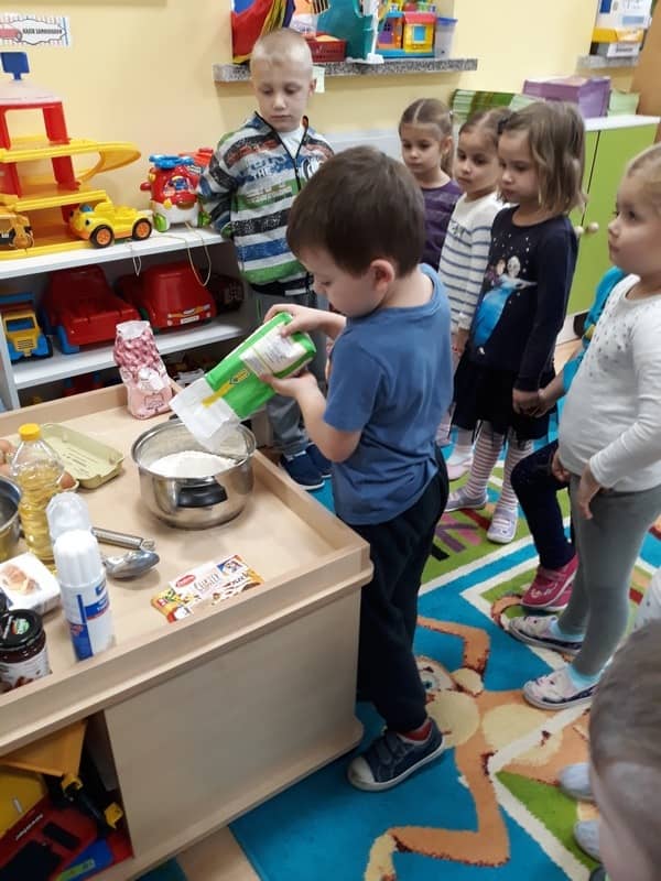 Dzieci z grupy „Tygryski” oraz „Pracowite pszczółki” zamieniły się w kucharzy. Przedszkolaki z pomocą pań przygotowały pyszne gofry. Dzieci chętnie pomagały w przygotowaniu ciasta na gofry, następnie oczekiwały aż gofry upieką się w gofrownicy. Przedszkolaki samodzielnie ozdabiały swoje gofry bitą śmietaną, cukrem pudrem, polewami oraz owocami. W tym dniu było bardzo pysznie.