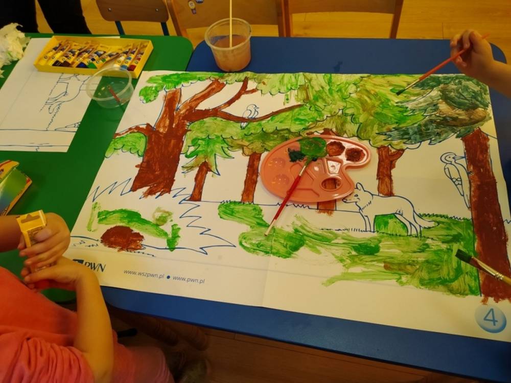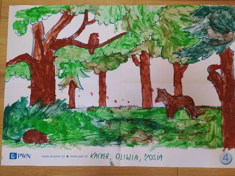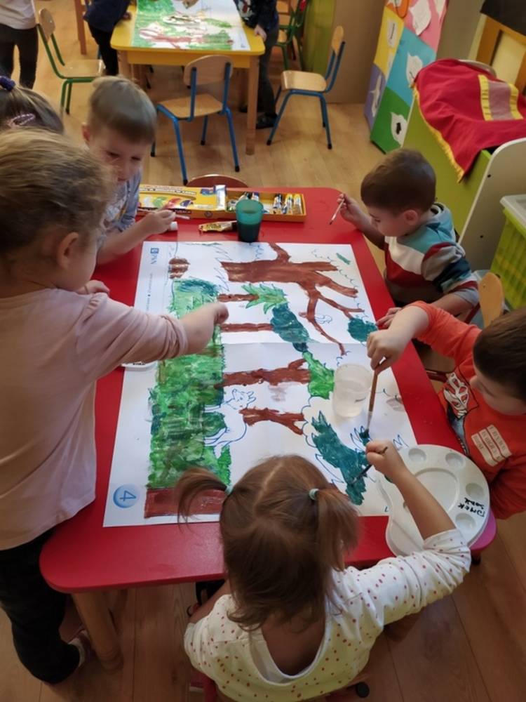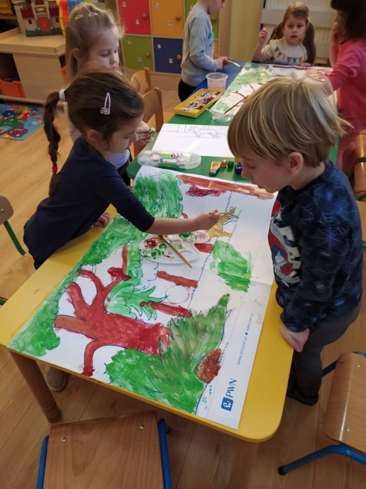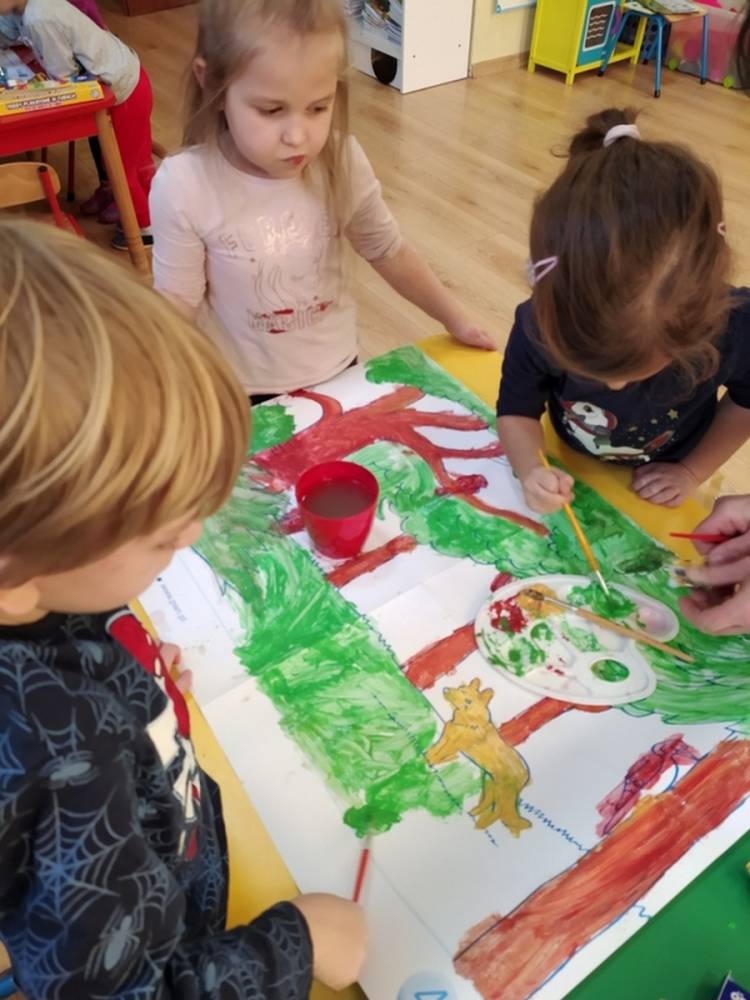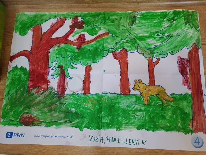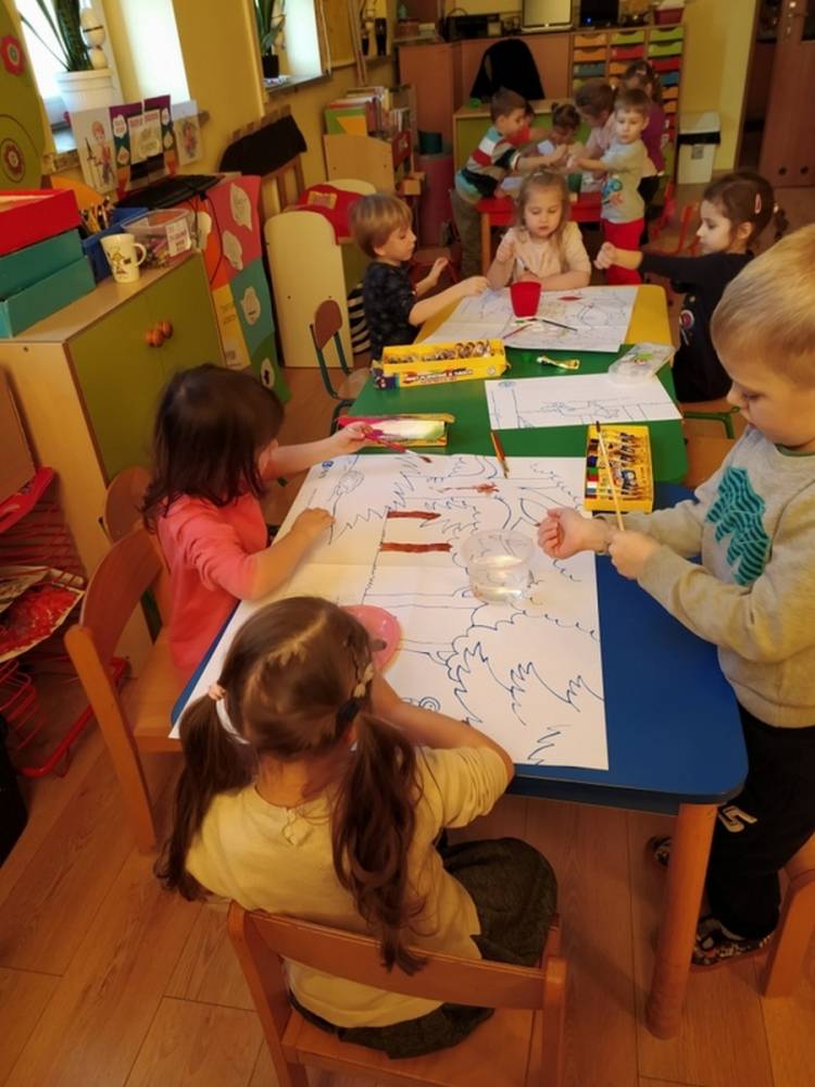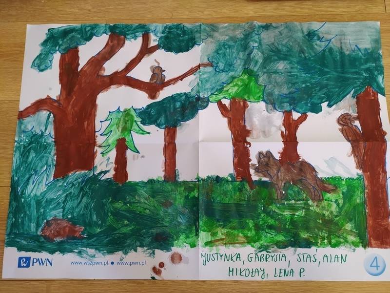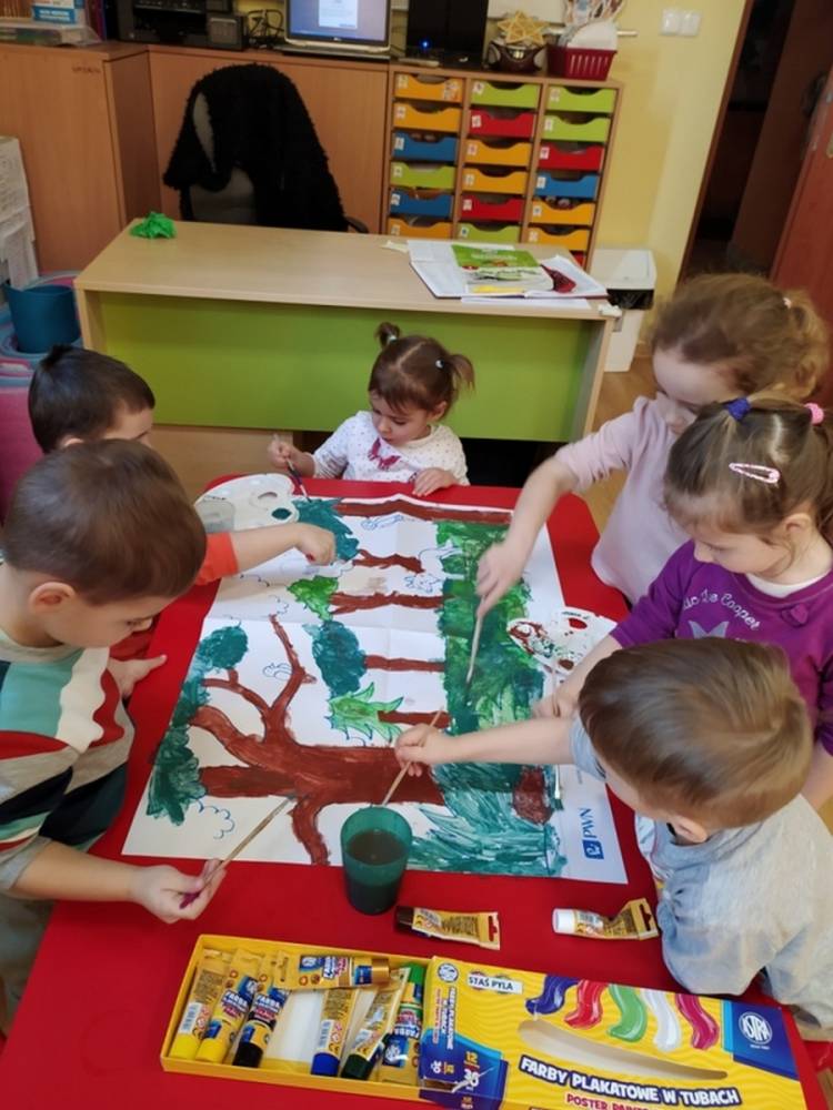 Las o każdej porze roku jest urokliwym miejscem dla odwiedzających go ludzi. Dlatego nie zważając na zimową pogodę, dzieci uczestniczyły w zajęciach poświęconym tematyce lasu. By docenić znaczenie lasu dzieci obejrzały interesujący film edukacyjny, poprzez który dowiedziały się, że las jest nie tylko domem zwierząt i roślin, ale także miejscem odpoczynku i krystalicznego powietrza. Ponadto dzieci zrozumiały, że las gwarantuje nam tlen, jest surowcem budowlanym i należy się o niego troszczyć. Dzieci wysłuchały również wiersza Pani Agnieszki Karcz pt. „Las”. Dodatkowo uczestniczyły w zabawie ruchowej i ilustrowały opowiadaną historię drzew. Na końcu podjęły artystyczne wyzwanie i w grupach malowały duże arkusze prezentujące kontury lasu i jego mieszkańców.