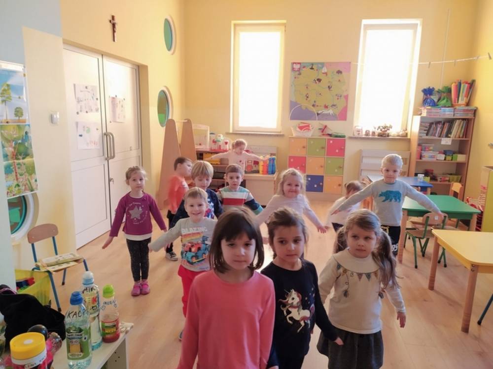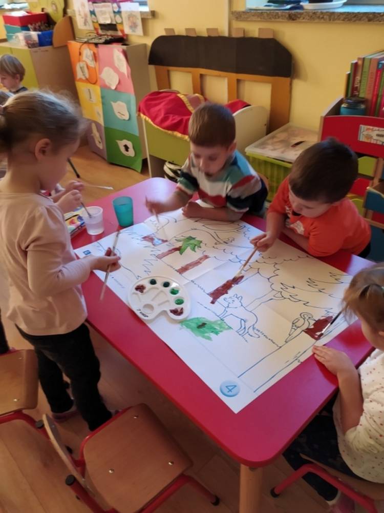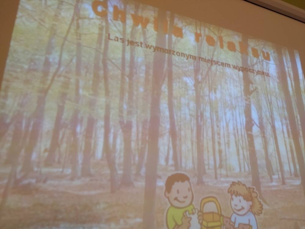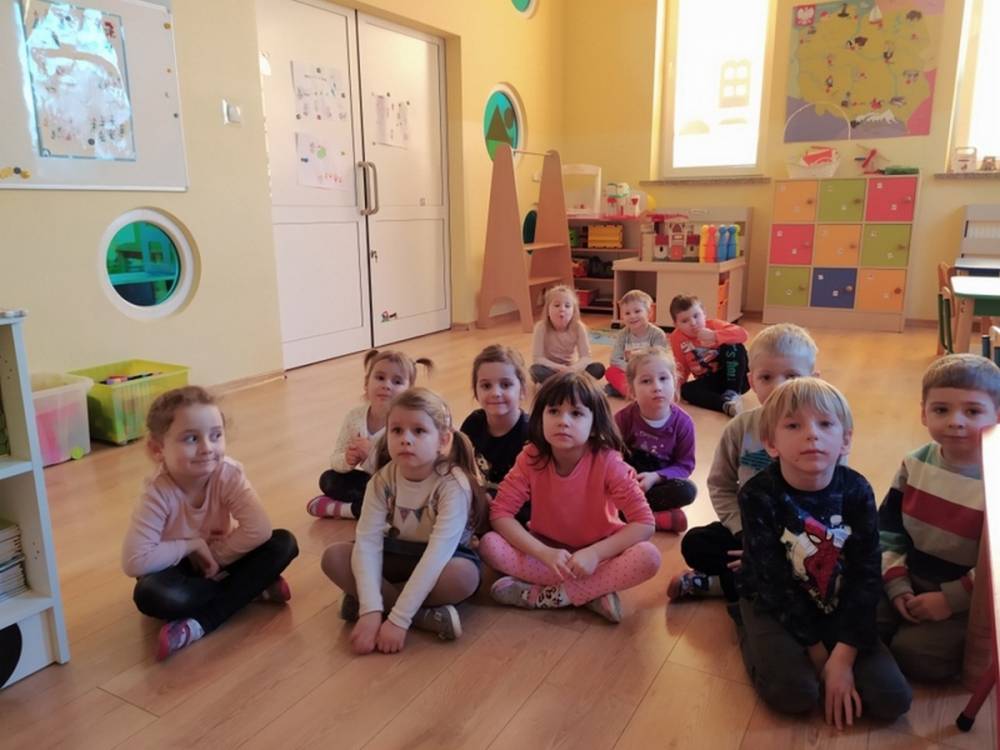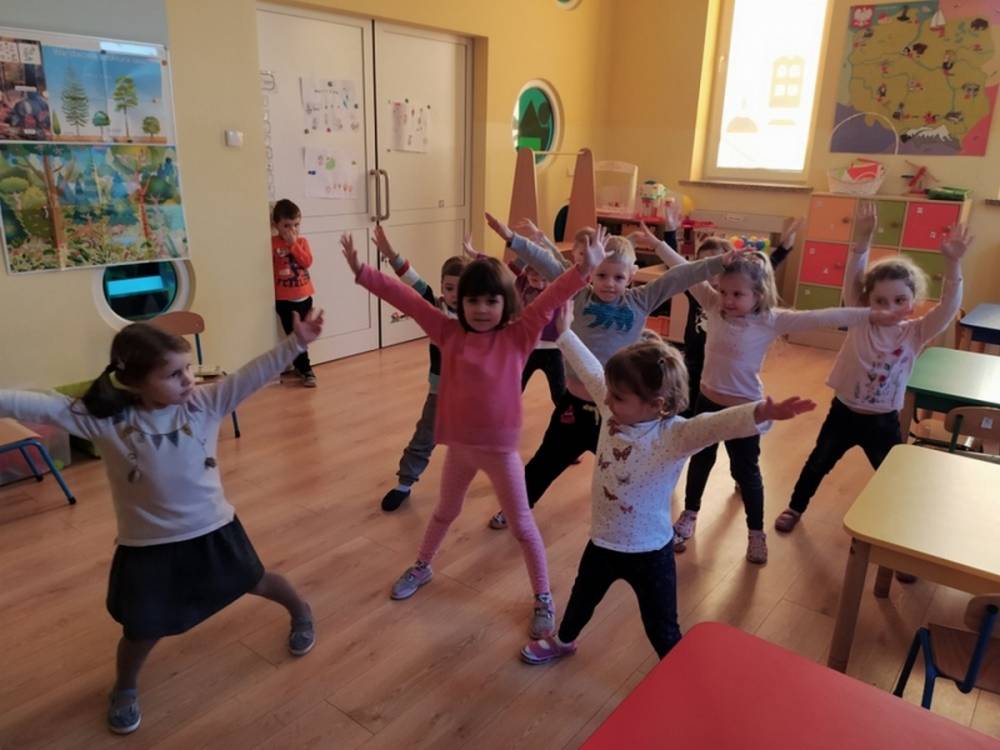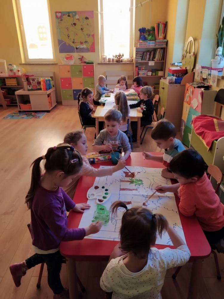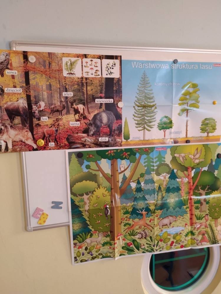 Las o każdej porze roku jest urokliwym miejscem dla odwiedzających go ludzi. Dlatego nie zważając na zimową pogodę, dzieci uczestniczyły w zajęciach poświęconym tematyce lasu. By docenić znaczenie lasu dzieci obejrzały interesujący film edukacyjny, poprzez który dowiedziały się, że las jest nie tylko domem zwierząt i roślin, ale także miejscem odpoczynku i krystalicznego powietrza. Ponadto dzieci zrozumiały, że las gwarantuje nam tlen, jest surowcem budowlanym i należy się o niego troszczyć. Dzieci wysłuchały również wiersza Pani Agnieszki Karcz pt. „Las”. Dodatkowo uczestniczyły w zabawie ruchowej i ilustrowały opowiadaną historię drzew. Na końcu podjęły artystyczne wyzwanie i w grupach malowały duże arkusze prezentujące kontury lasu i jego mieszkańców.