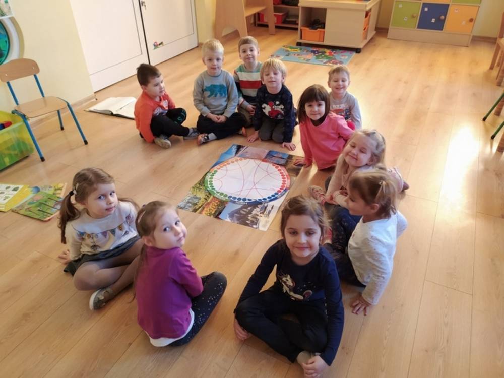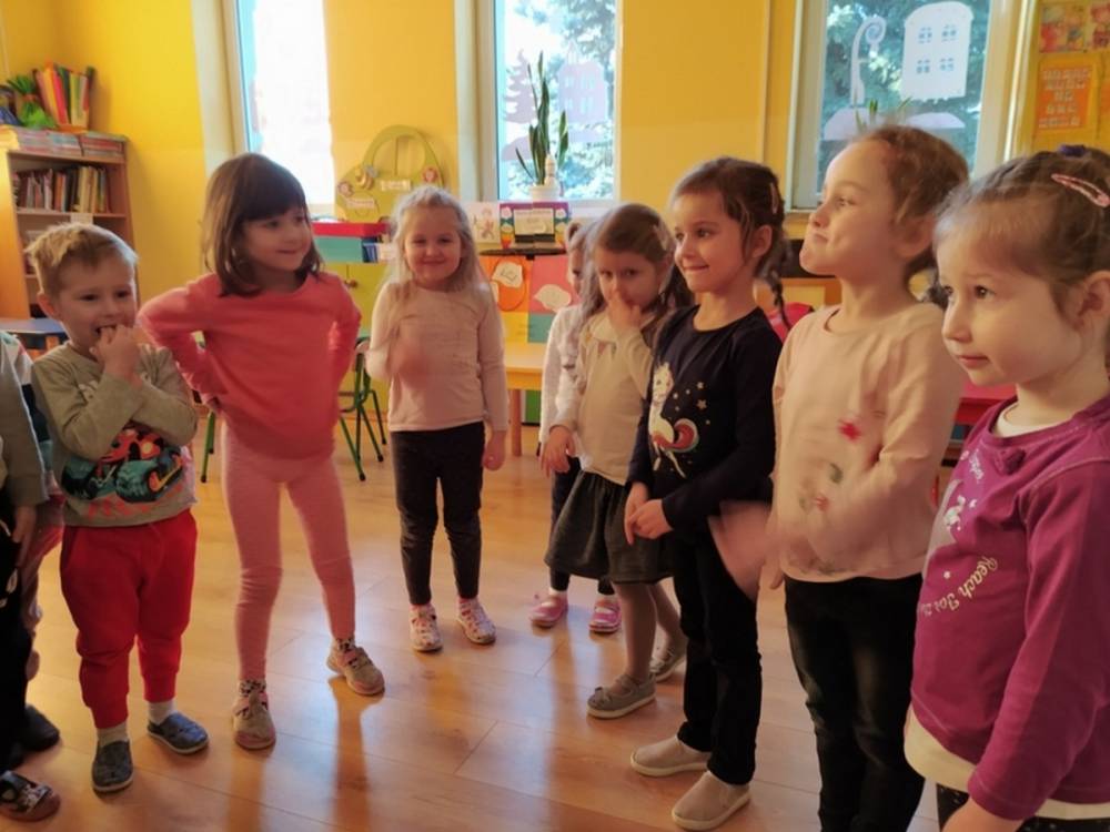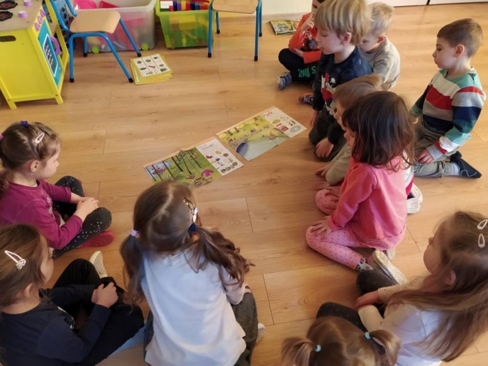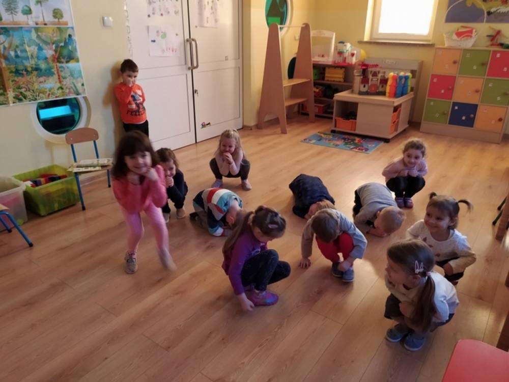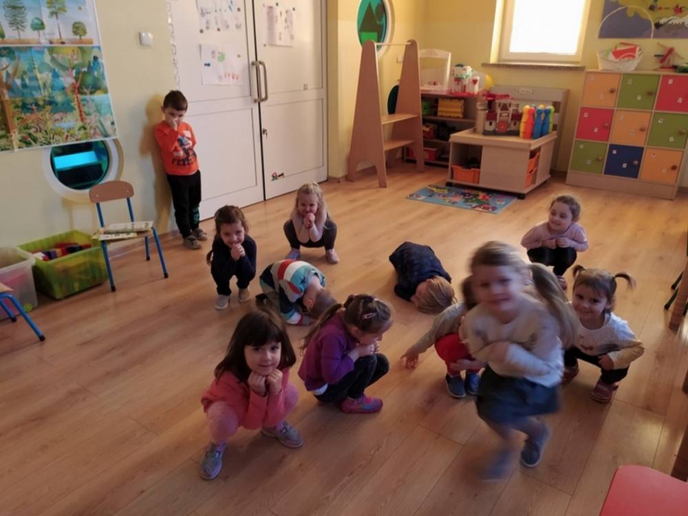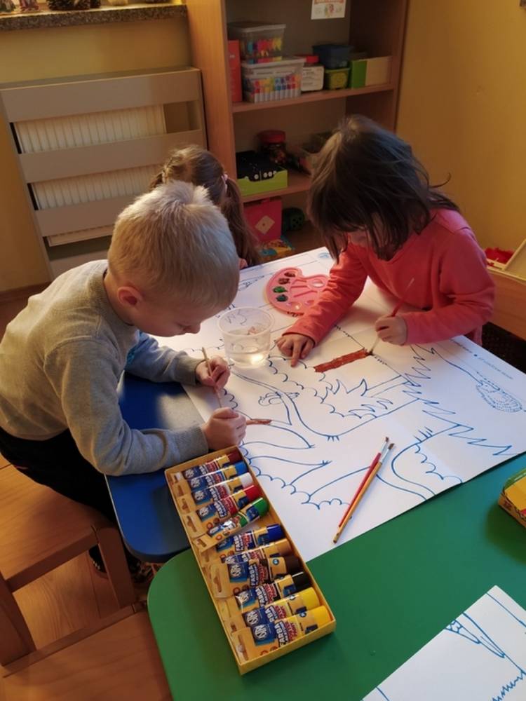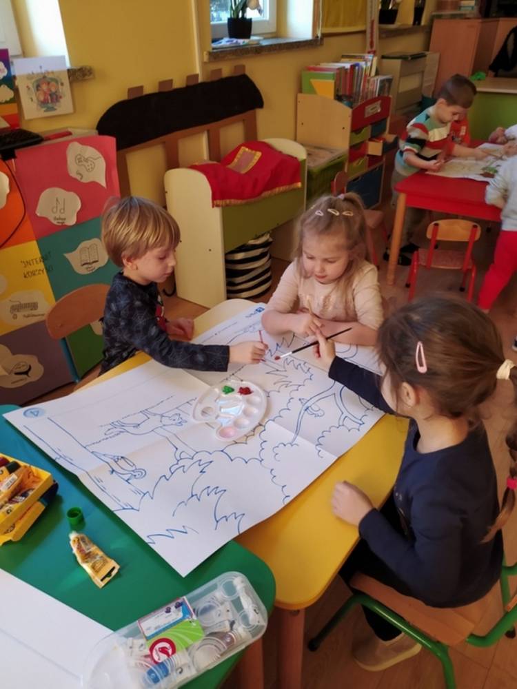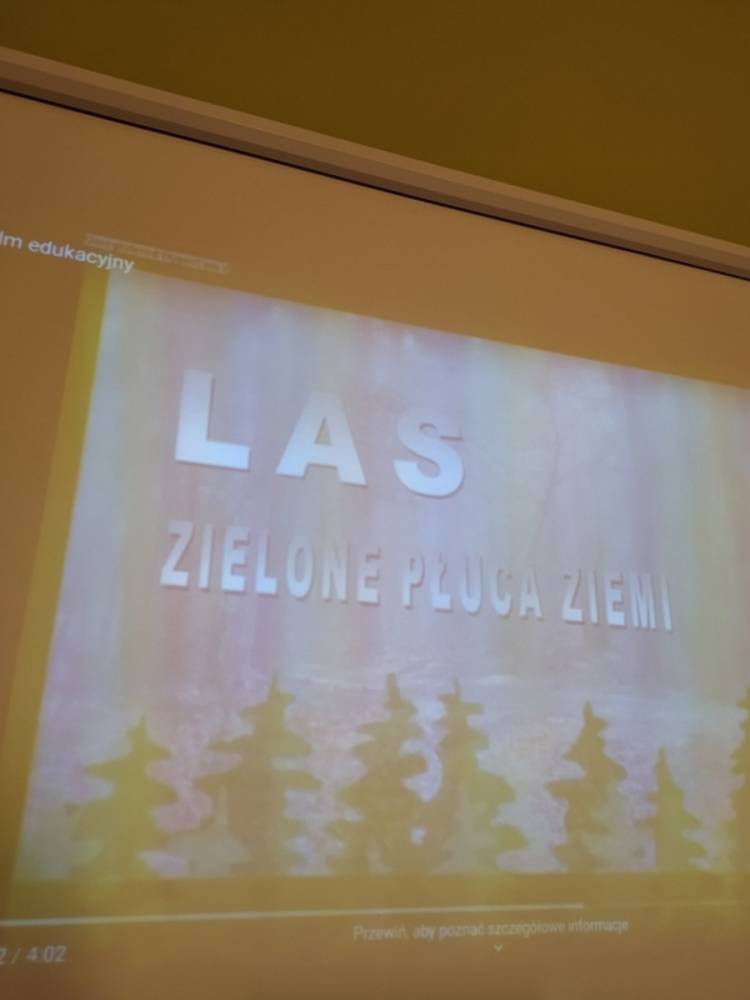Las o każdej porze roku jest urokliwym miejscem dla odwiedzających go ludzi. Dlatego nie zważając na zimową pogodę, dzieci uczestniczyły w zajęciach poświęconym tematyce lasu. By docenić znaczenie lasu dzieci obejrzały interesujący film edukacyjny, poprzez który dowiedziały się, że las jest nie tylko domem zwierząt i roślin, ale także miejscem odpoczynku i krystalicznego powietrza. Ponadto dzieci zrozumiały, że las gwarantuje nam tlen, jest surowcem budowlanym i należy się o niego troszczyć. Dzieci wysłuchały również wiersza Pani Agnieszki Karcz pt. „Las”. Dodatkowo uczestniczyły w zabawie ruchowej i ilustrowały opowiadaną historię drzew. Na końcu podjęły artystyczne wyzwanie i w grupach malowały duże arkusze prezentujące kontury lasu i jego mieszkańców.