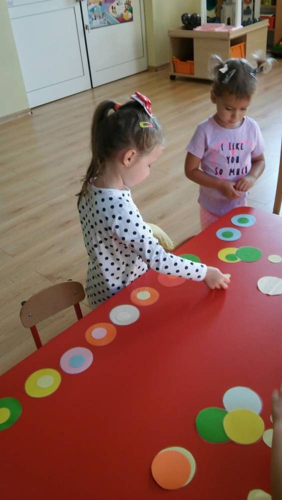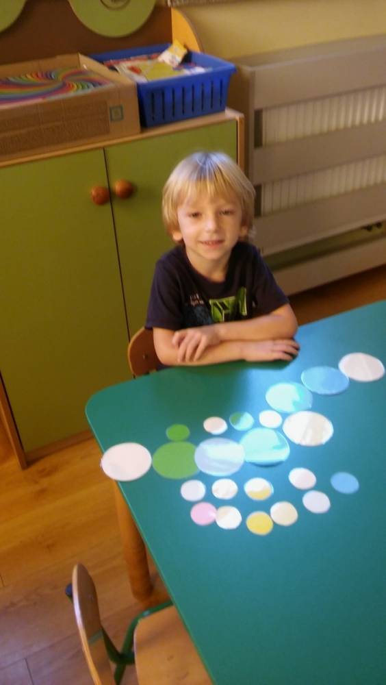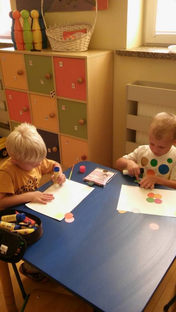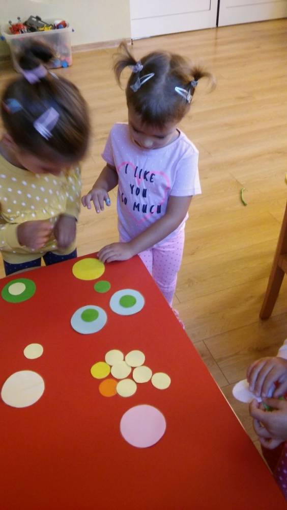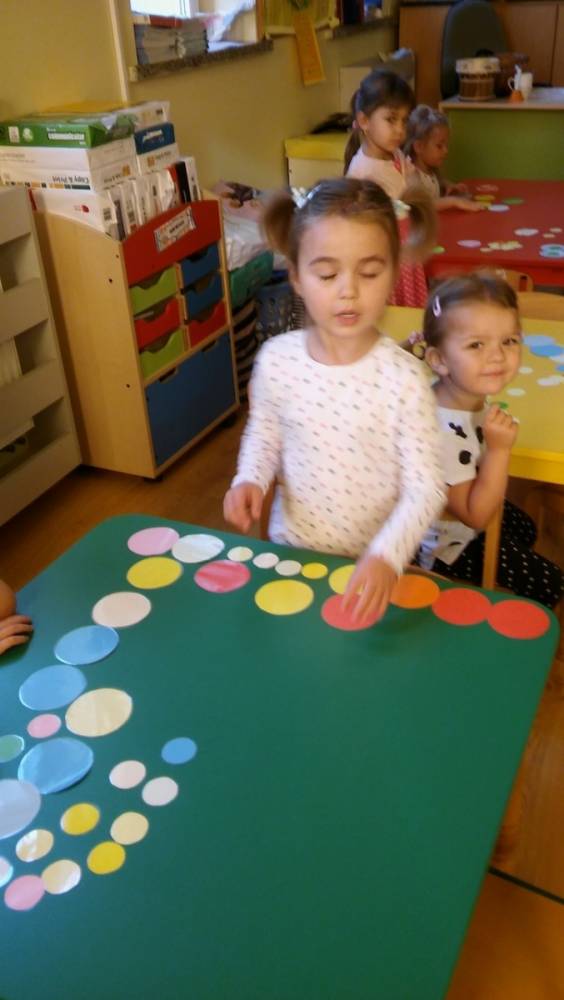 i swojej sali. Tu czekały na dzieci kropkowe atrakcje min: układanie obrazków z kropek, dobieranie się w pary według wzorów na kółeczkach, wymyślanie zabaw z kolorowymi kropeczkami, kropeczkowa gimnastyka. Cel zajęć został w pełni osiągnięty, gdyż każdy ,,Tygrysek” i ,,Pracowita Pszczółka” zgodnie stwierdzili, że każde dziecko ma jakiś talent, wystarczy tylko go odkryć i rozwijać. Zainspirowani bohaterką filmu, małą Vashti, przedszkolaki stworzyły piękne kropeczkowe kompozycje. Można w nich dostrzec świat roślin, zwierząt, pejzaże , a nawet kosmiczne przestworza.