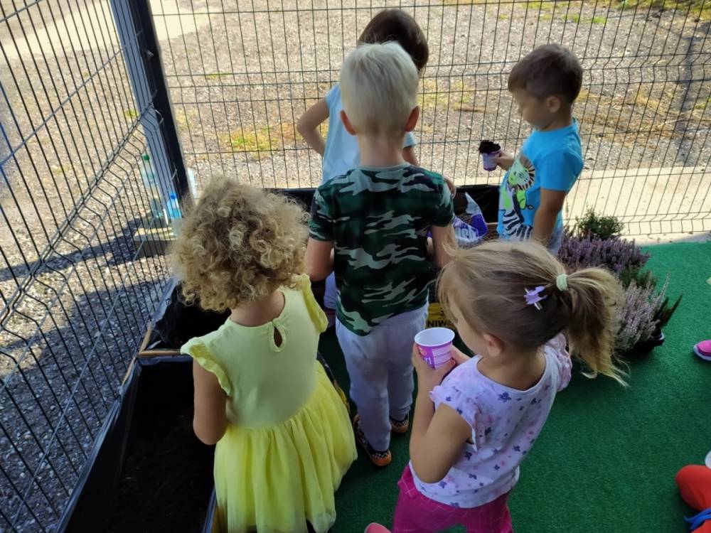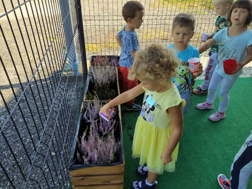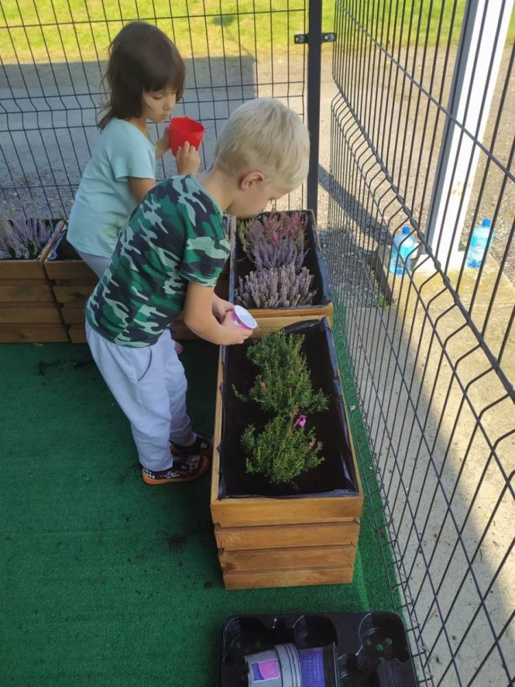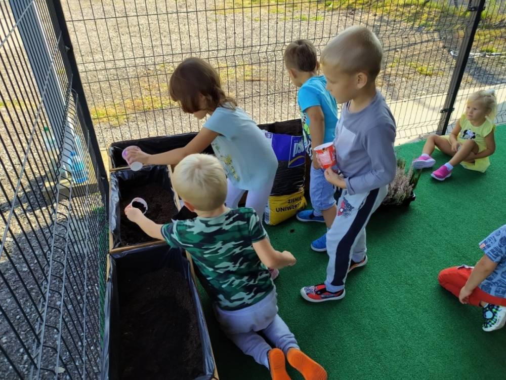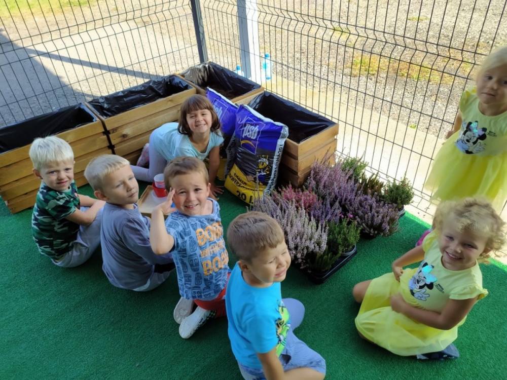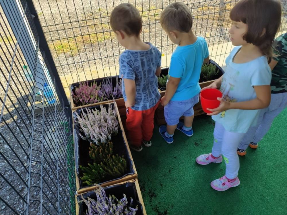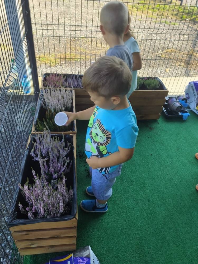 Nasz przedszkolny taras, nazywany przez dzieci „zieloną trawką”, zyskał nowych jesiennych mieszkańców. W dniu 14.09.2020 Przedszkolaki wspólnie z nauczycielkami, w godzinach popołudniowych, przygotowały niespodziankę dla wszystkich dzieci- mini ogródek pełen barwnych wrzosów i wrzośców. Dzieci dzielnie pracowały, dosypując ziemię, a na końcu podlewając rośliny. Radości i satysfakcji z dokonanych działań było, co niemiara. Cieszymy się z naszego kawałeczka zielni i wierzymy, że będzie w nim zawsze tak kolorowo.