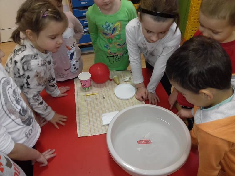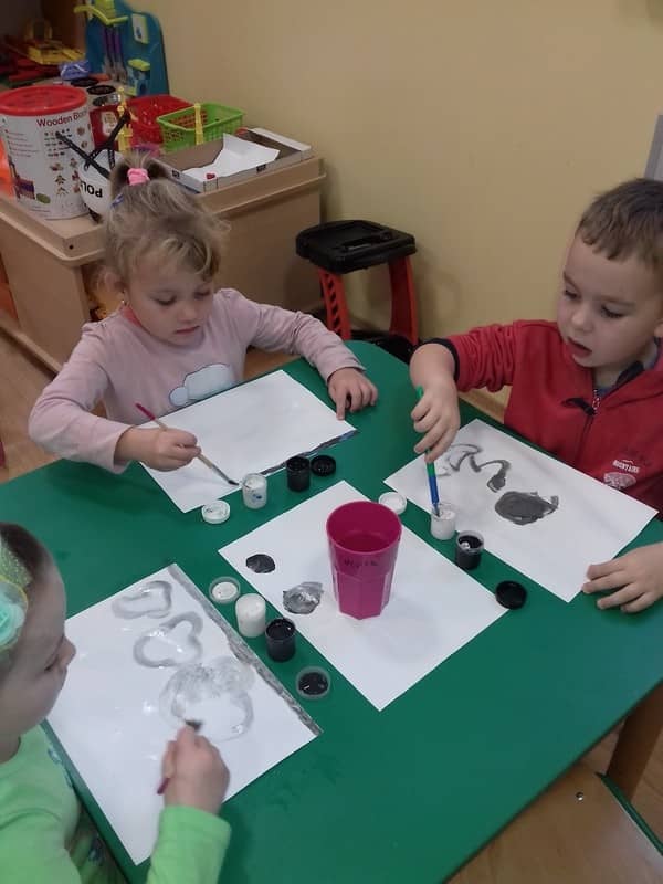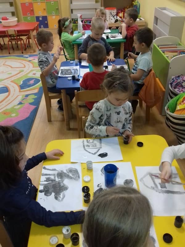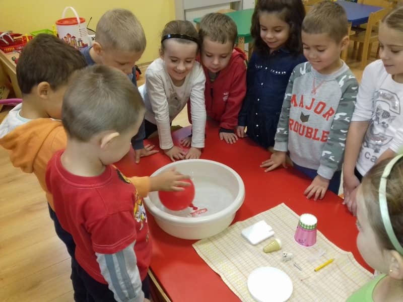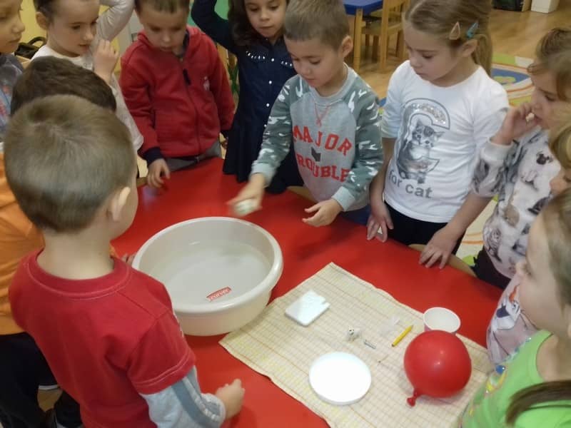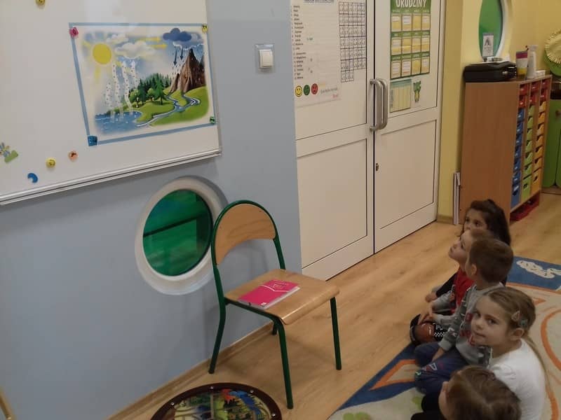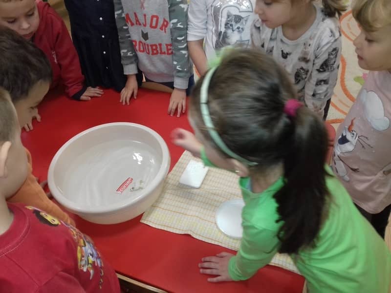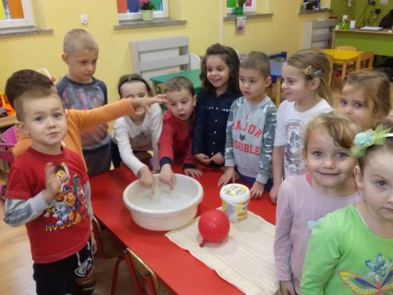 Obieg wody w przyrodzie. W dniu 17.11.2017 Pracowite Pszczółki poznały niezwykłe właściwości wody oraz zjawisko skraplania i parowania. Badały wyporność wody i sprawdzały, jakie przedmioty toną, bądź też unoszą się na wodzie. Ponadto zapoznane zostały ze zjawiskiem krążenia wody w przyrodzie. Do tego celu wykorzystano utwór literacki, planszę edukacyjną oraz doświadczenia z użyciem naczyń. Na zakończenie zajęć dzieci poznały technikę malarską "mokre w mokre" oraz tworzyły kolor szary przy użyciu farby białej i czarnej. Tematem prac był deszczowy świat.