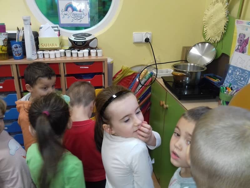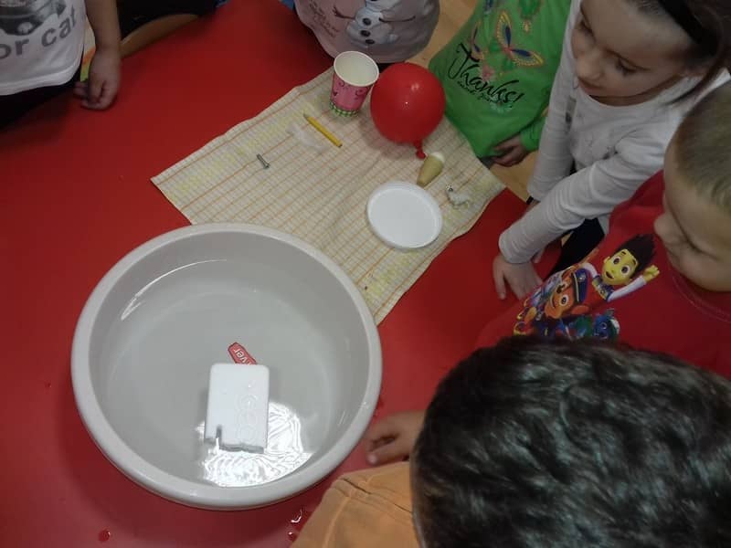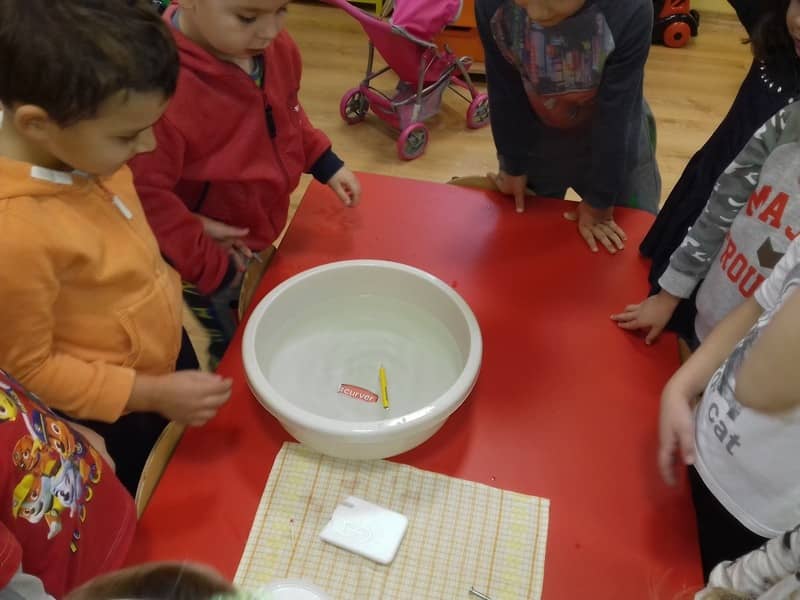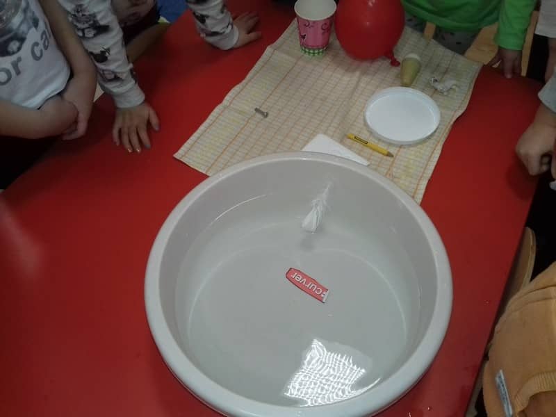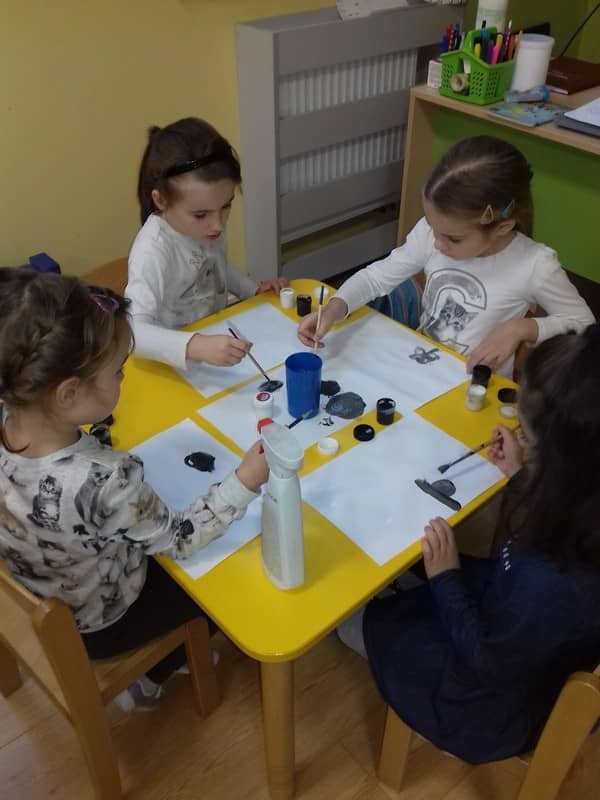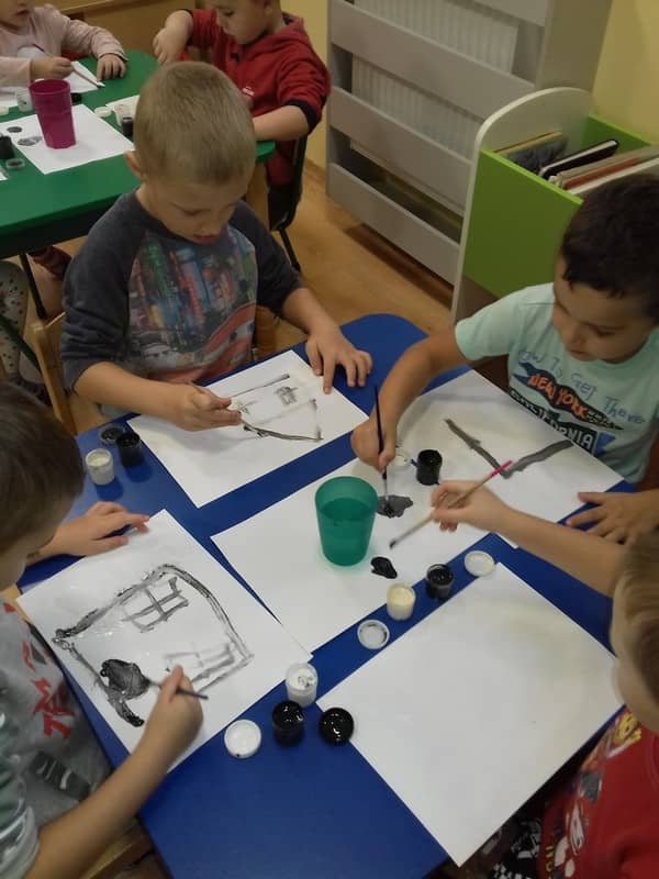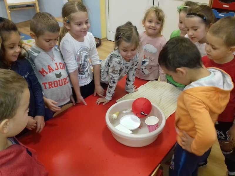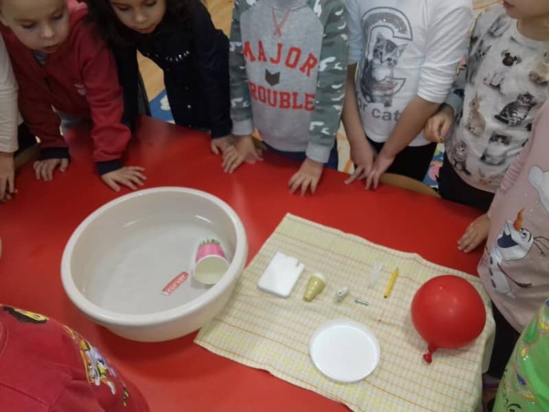 Obieg wody w przyrodzie. W dniu 17.11.2017 Pracowite Pszczółki poznały niezwykłe właściwości wody oraz zjawisko skraplania i parowania. Badały wyporność wody i sprawdzały, jakie przedmioty toną, bądź też unoszą się na wodzie. Ponadto zapoznane zostały ze zjawiskiem krążenia wody w przyrodzie. Do tego celu wykorzystano utwór literacki, planszę edukacyjną oraz doświadczenia z użyciem naczyń. Na zakończenie zajęć dzieci poznały technikę malarską "mokre w mokre" oraz tworzyły kolor szary przy użyciu farby białej i czarnej. Tematem prac był deszczowy świat.
