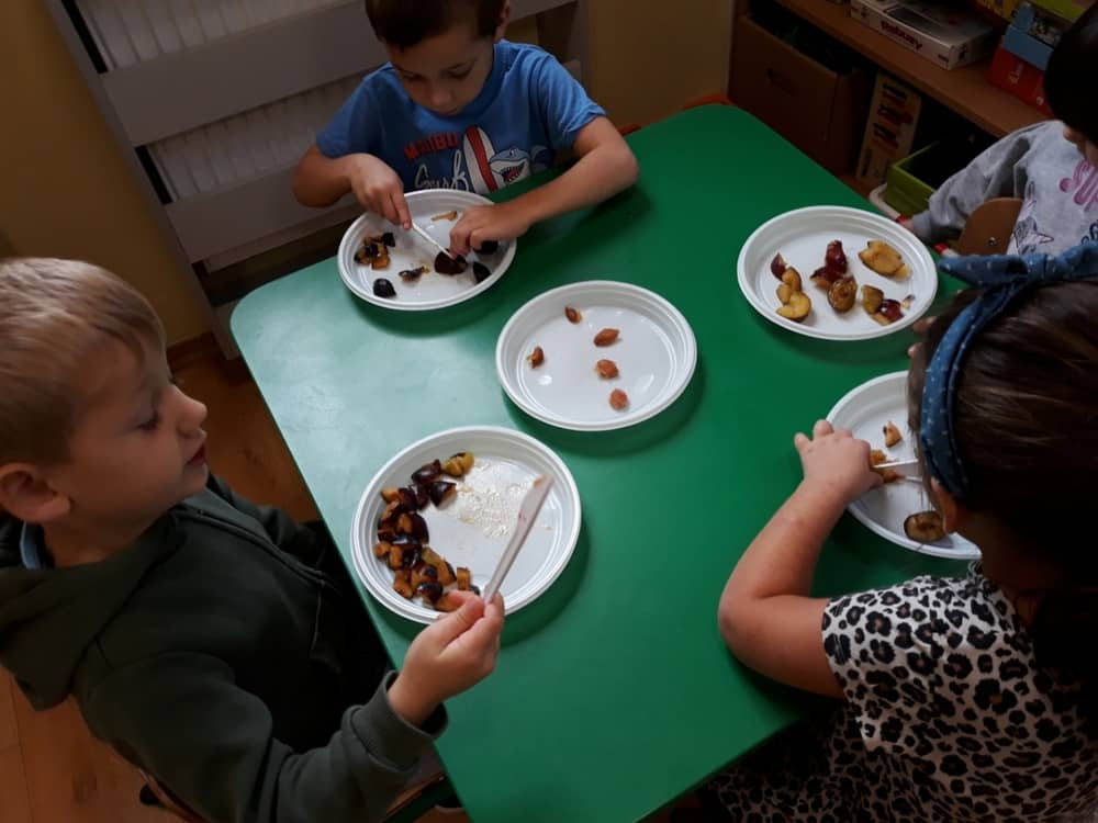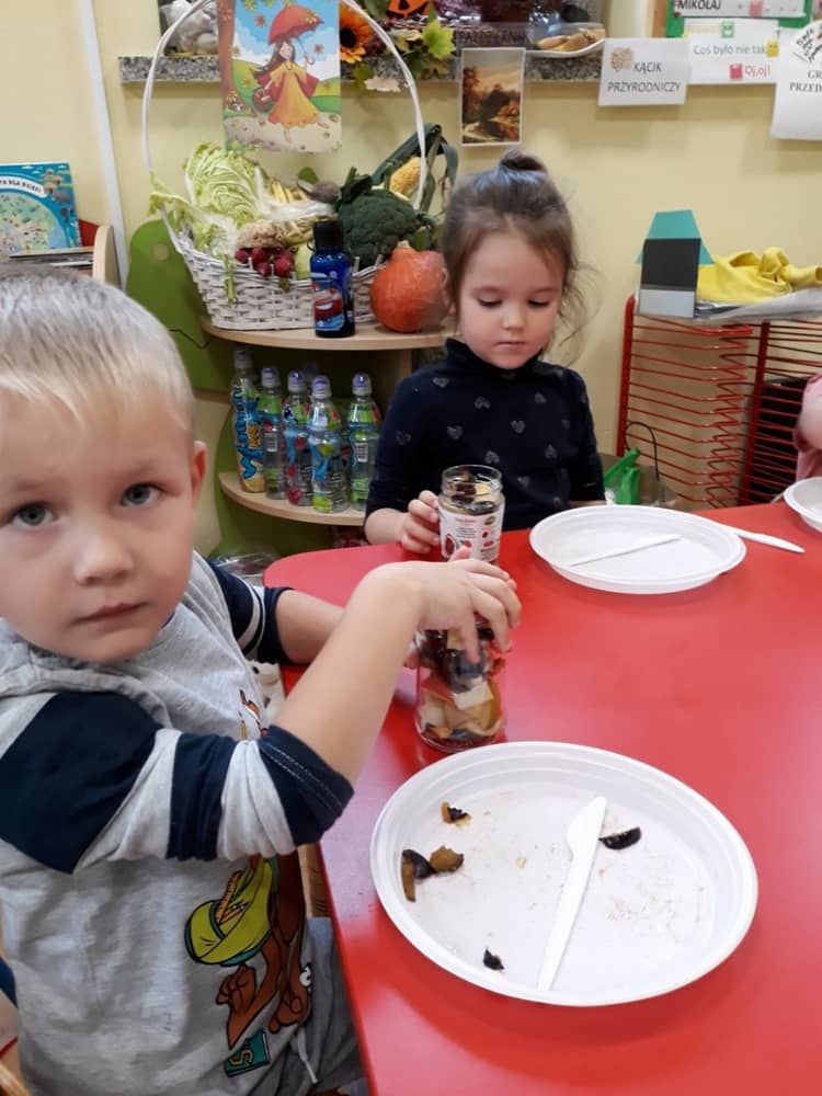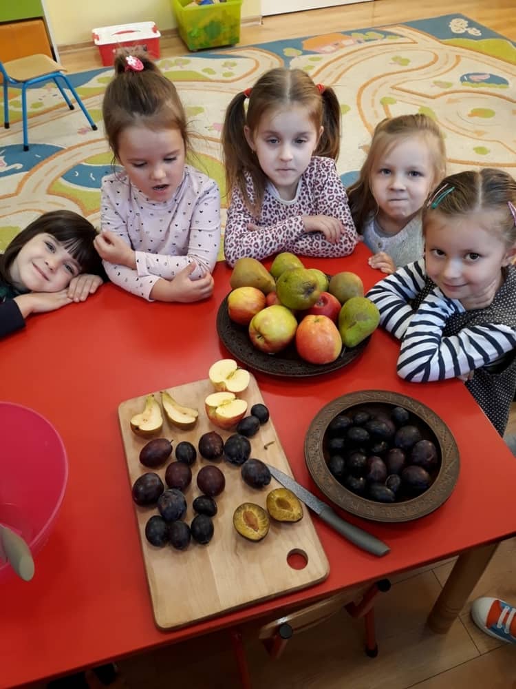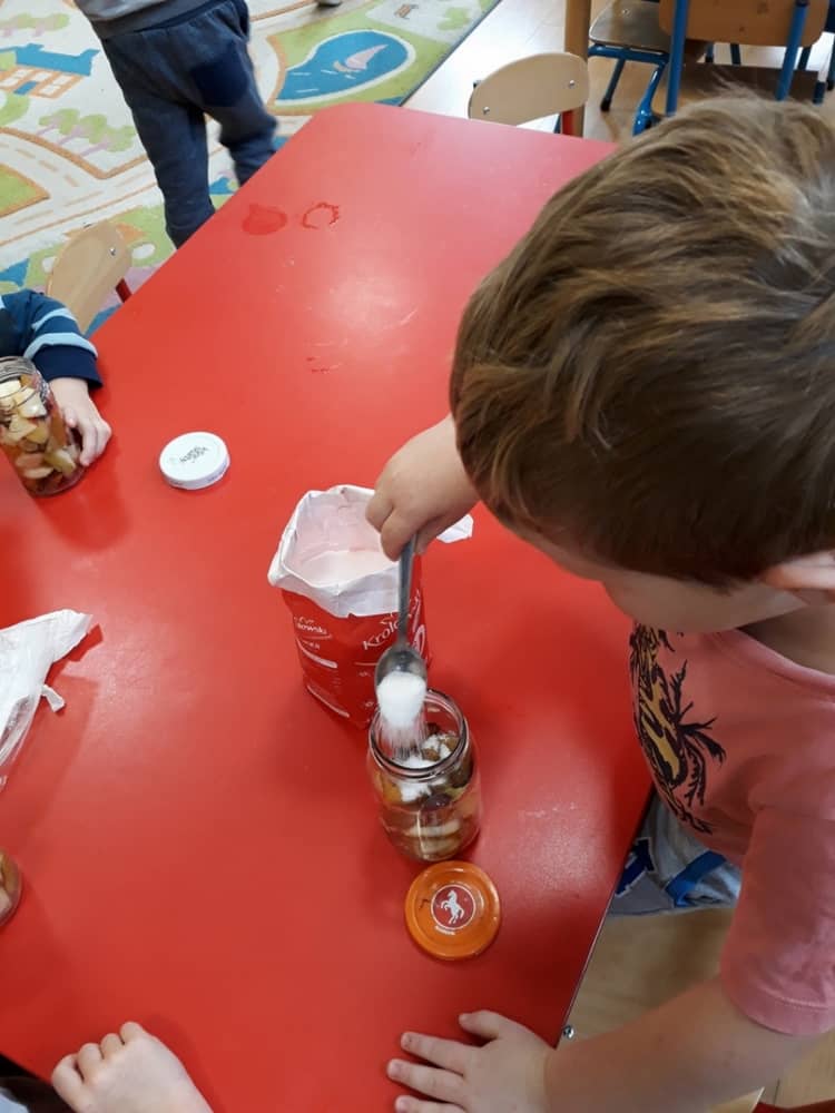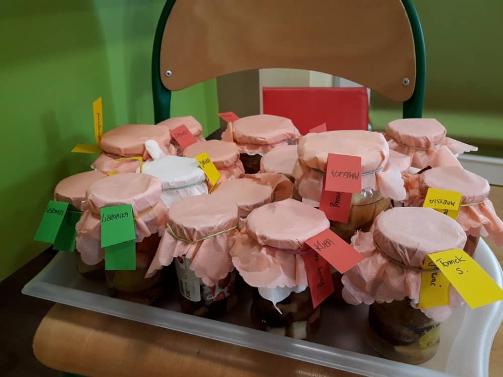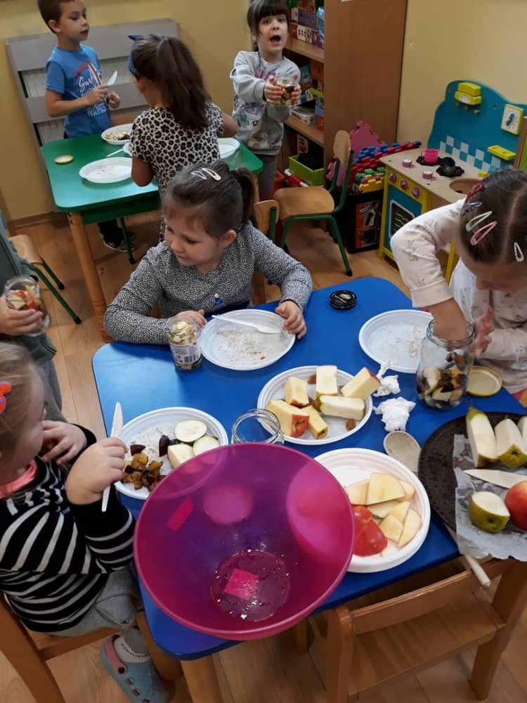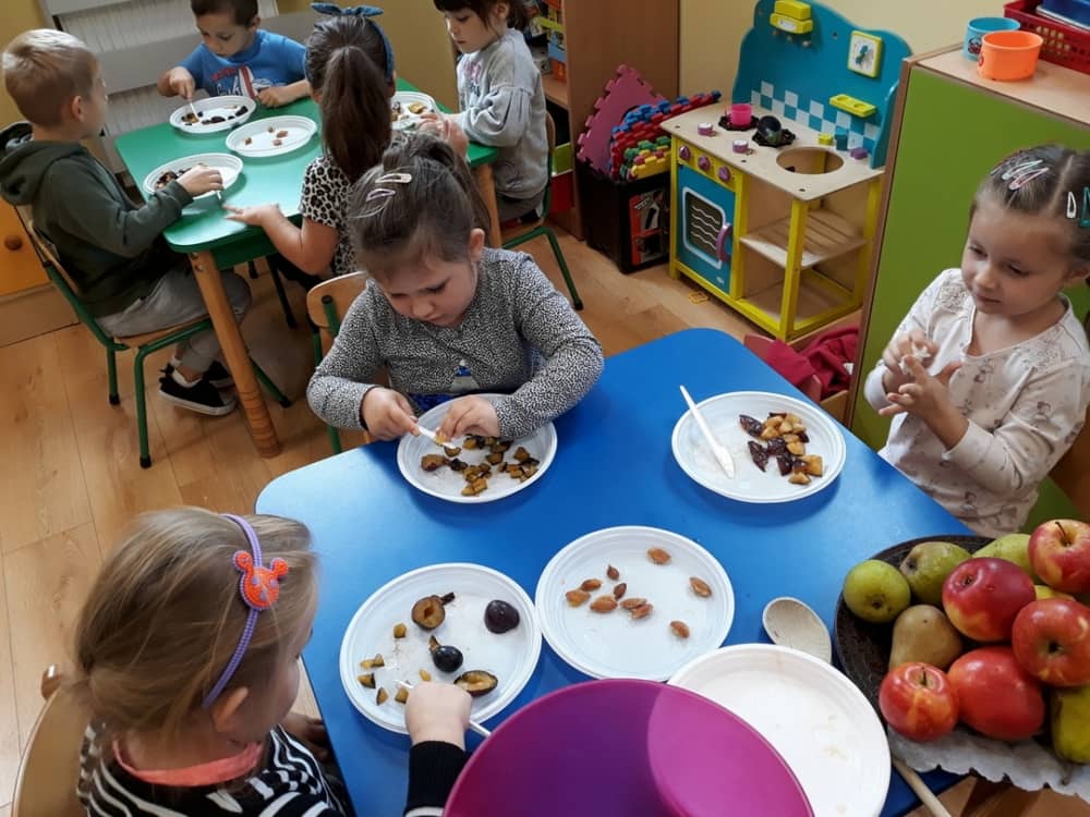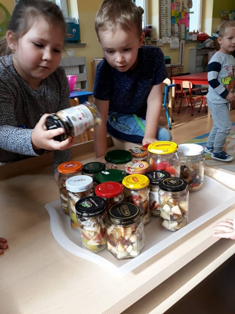 Jesień to wspaniała pora roku, która przynosi w darze bezcenne skarby. W drugim tygodniu października grupa „Pracowitych Pszczółek” odkrywała krainę warzyw i owoców oraz udekorowała swój kącik przyrodniczy wyśmienitymi okazami. W trakcie zajęć dzieci poznawały walory smakowe, zapachowe oraz wartości odżywcze zgromadzonych w kąciku owoców i warzyw. Bardzo atrakcyjnym dla nich wyzwaniem było samodzielne przygotowanie kompotu z trzech owoców- jabłka, gruszki i śliwki. Umyte owoce i czyste ręce były początkiem przygody kulinarnej. Dzieci samodzielnie kroiły owoce na małe kawałki, następnie przekładały je do słoików i wsypywały kilka łyżeczek cukru. Wszystkie owoce zalano gorącą wodą w zaciszu kuchennym, a dzieci zabrały szczelnie do domu zamknięte i przygotowane do pasteryzacji słoiczki. Kulinarna przygoda wielu witamin zapewne wszystkim doda.