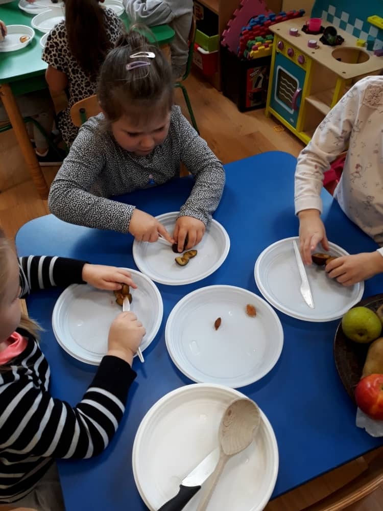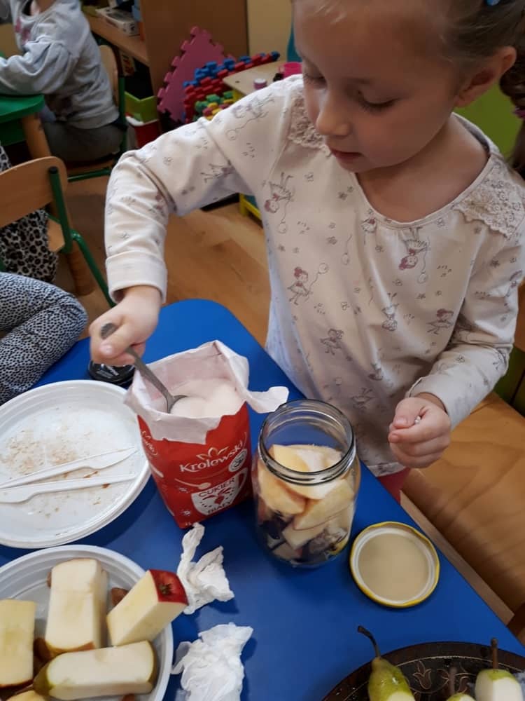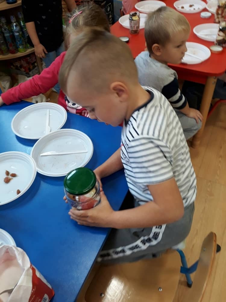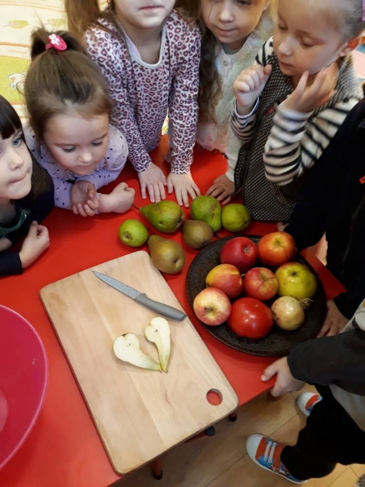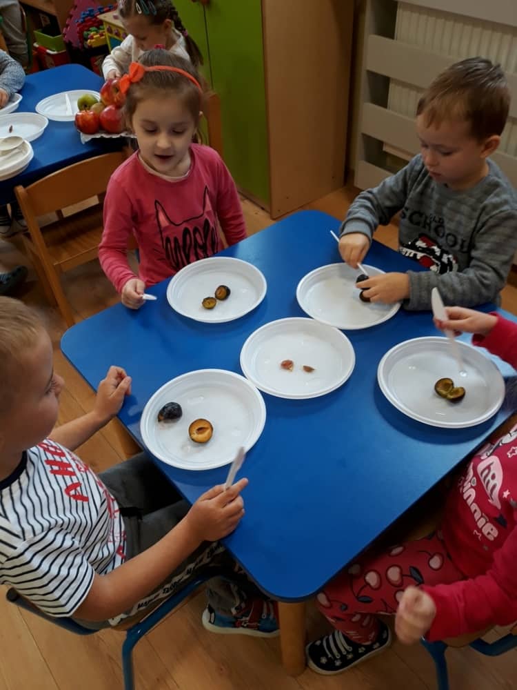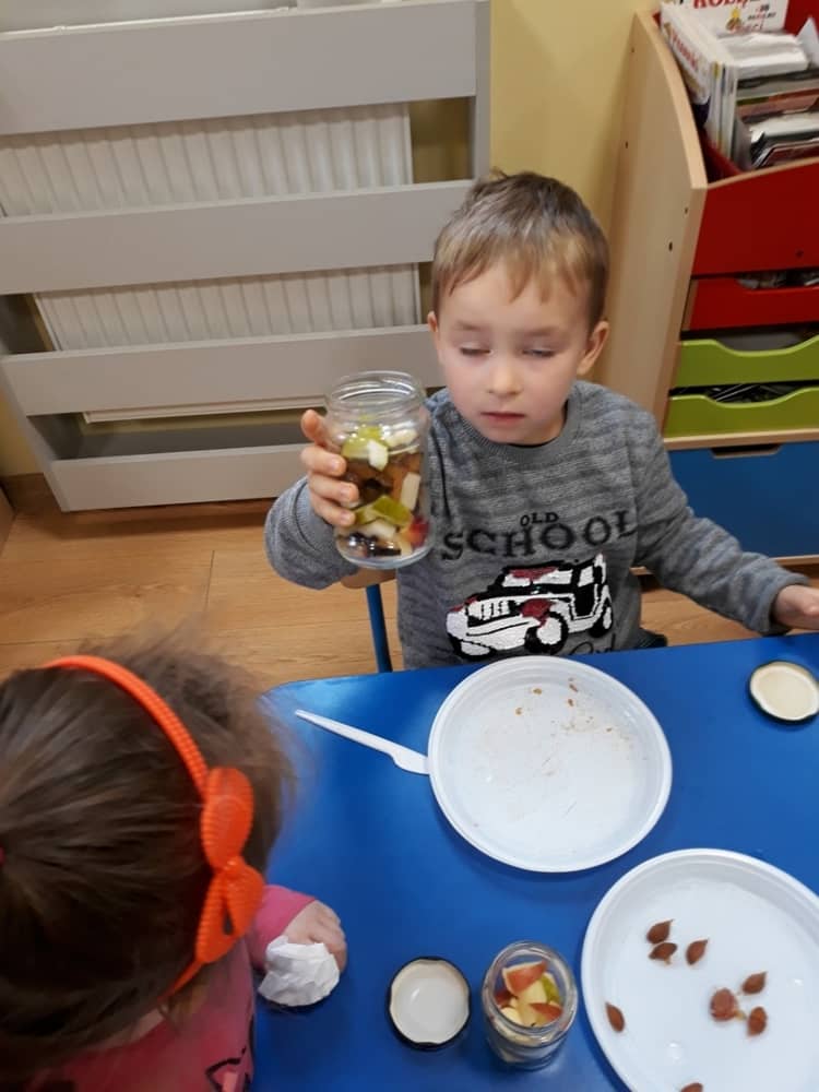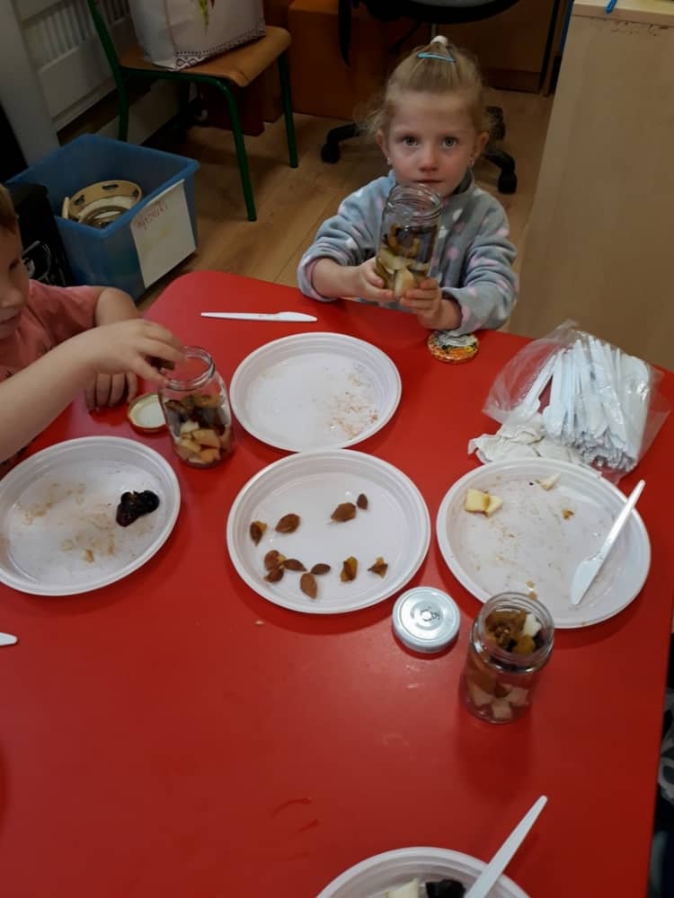 Jesień to wspaniała pora roku, która przynosi w darze bezcenne skarby. W drugim tygodniu października grupa „Pracowitych Pszczółek” odkrywała krainę warzyw i owoców oraz udekorowała swój kącik przyrodniczy wyśmienitymi okazami. W trakcie zajęć dzieci poznawały walory smakowe, zapachowe oraz wartości odżywcze zgromadzonych w kąciku owoców i warzyw. Bardzo atrakcyjnym dla nich wyzwaniem było samodzielne przygotowanie kompotu z trzech owoców- jabłka, gruszki i śliwki. Umyte owoce i czyste ręce były początkiem przygody kulinarnej. Dzieci samodzielnie kroiły owoce na małe kawałki, następnie przekładały je do słoików i wsypywały kilka łyżeczek cukru. Wszystkie owoce zalano gorącą wodą w zaciszu kuchennym, a dzieci zabrały szczelnie do domu zamknięte i przygotowane do pasteryzacji słoiczki. Kulinarna przygoda wielu witamin zapewne wszystkim doda.