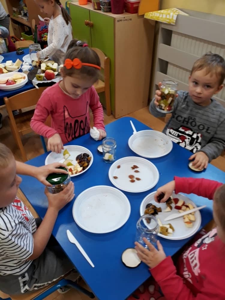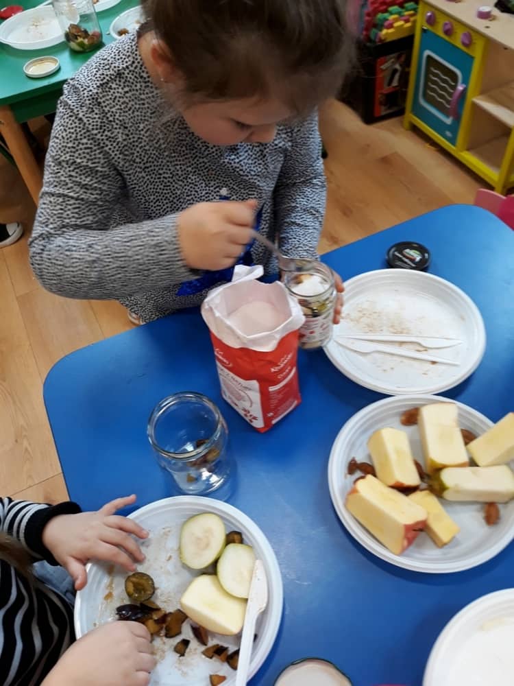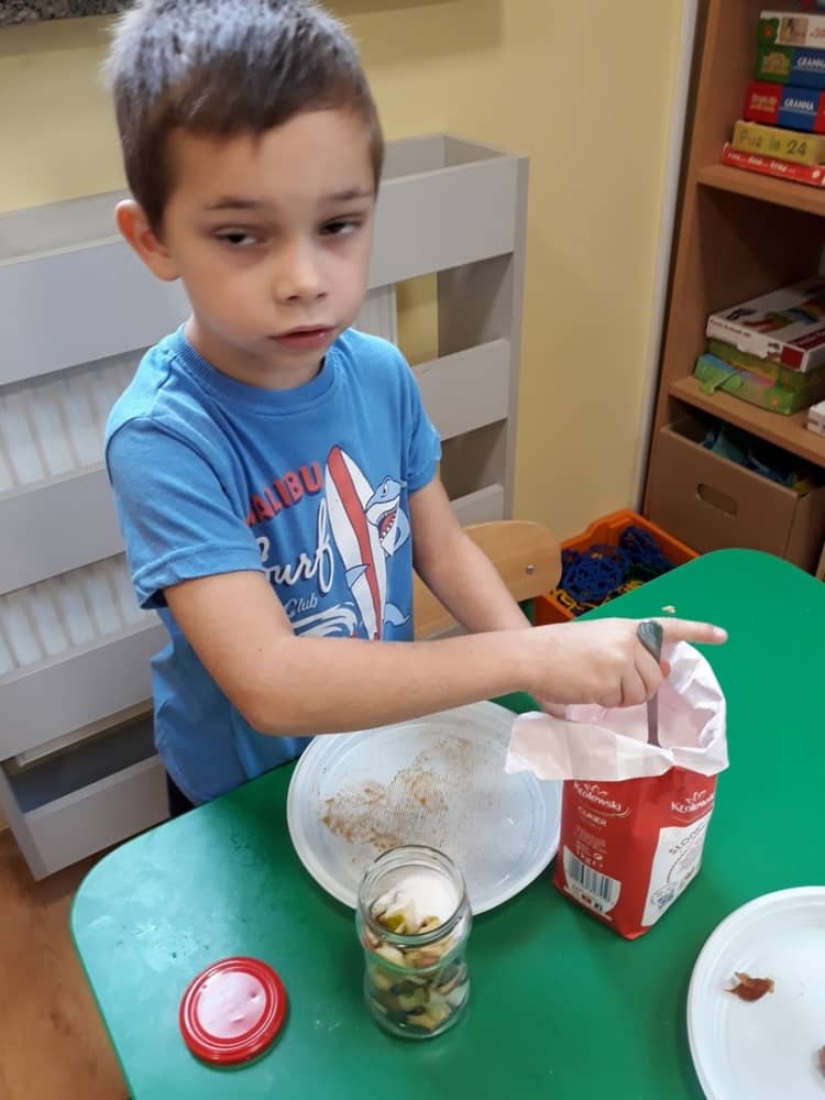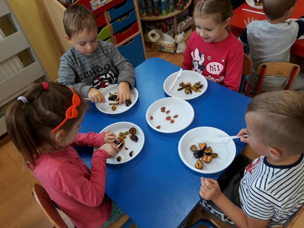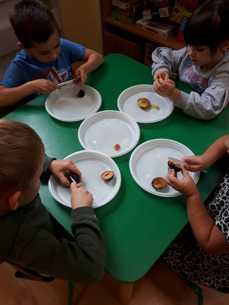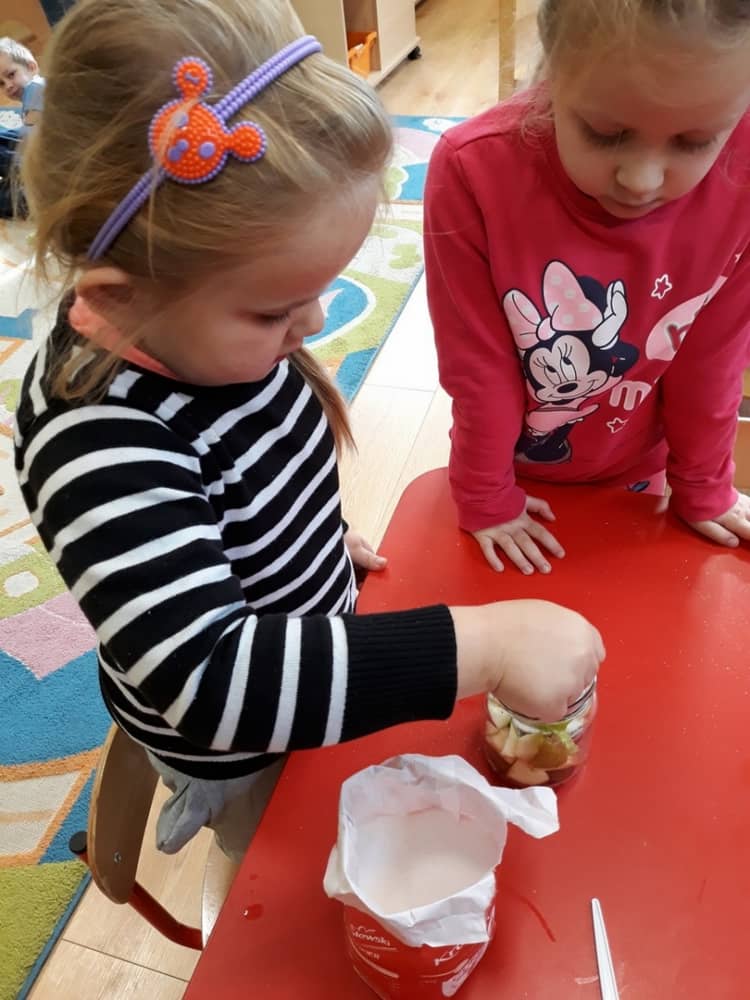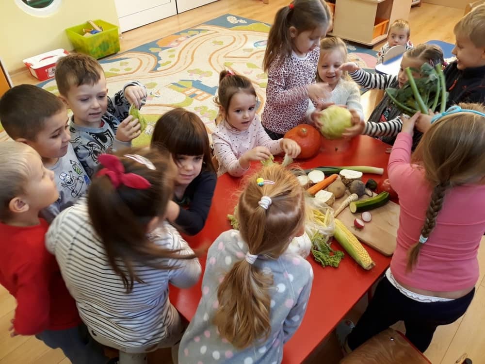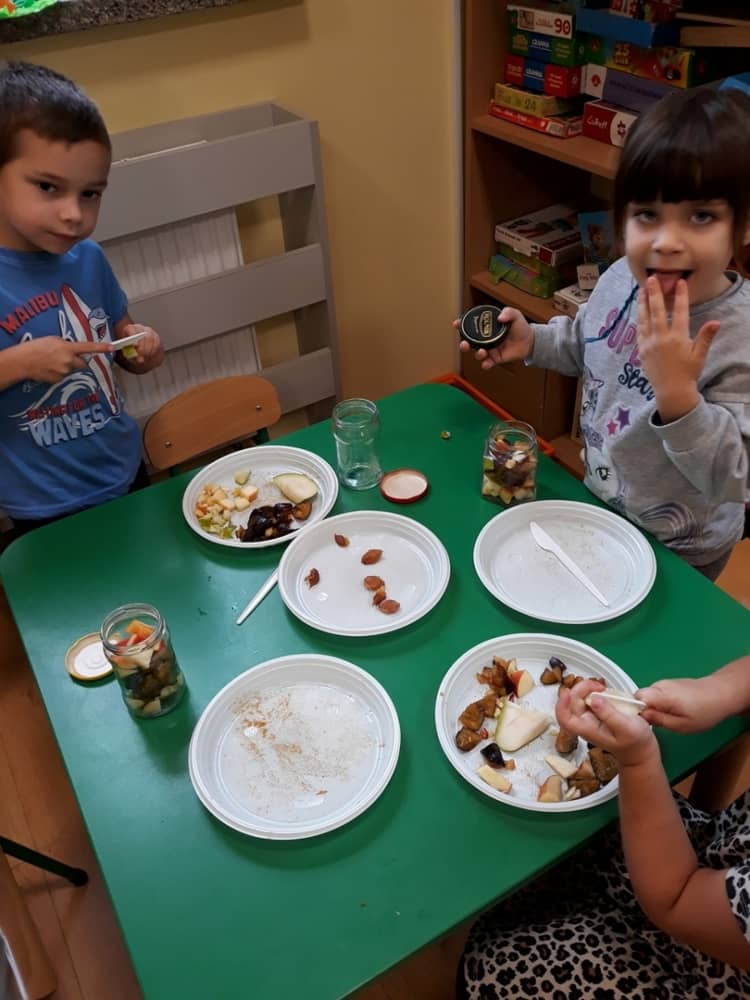 Jesień to wspaniała pora roku, która przynosi w darze bezcenne skarby. W drugim tygodniu października grupa „Pracowitych Pszczółek” odkrywała krainę warzyw i owoców oraz udekorowała swój kącik przyrodniczy wyśmienitymi okazami. W trakcie zajęć dzieci poznawały walory smakowe, zapachowe oraz wartości odżywcze zgromadzonych w kąciku owoców i warzyw. Bardzo atrakcyjnym dla nich wyzwaniem było samodzielne przygotowanie kompotu z trzech owoców- jabłka, gruszki i śliwki. Umyte owoce i czyste ręce były początkiem przygody kulinarnej. Dzieci samodzielnie kroiły owoce na małe kawałki, następnie przekładały je do słoików i wsypywały kilka łyżeczek cukru. Wszystkie owoce zalano gorącą wodą w zaciszu kuchennym, a dzieci zabrały szczelnie do domu zamknięte i przygotowane do pasteryzacji słoiczki. Kulinarna przygoda wielu witamin zapewne wszystkim doda.