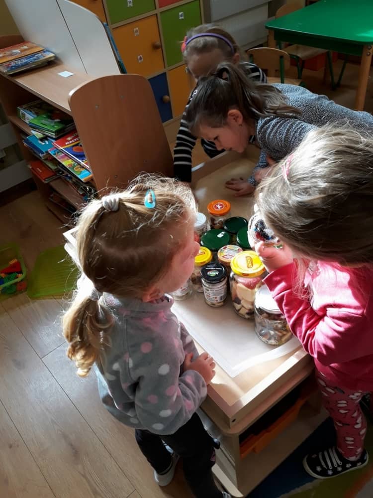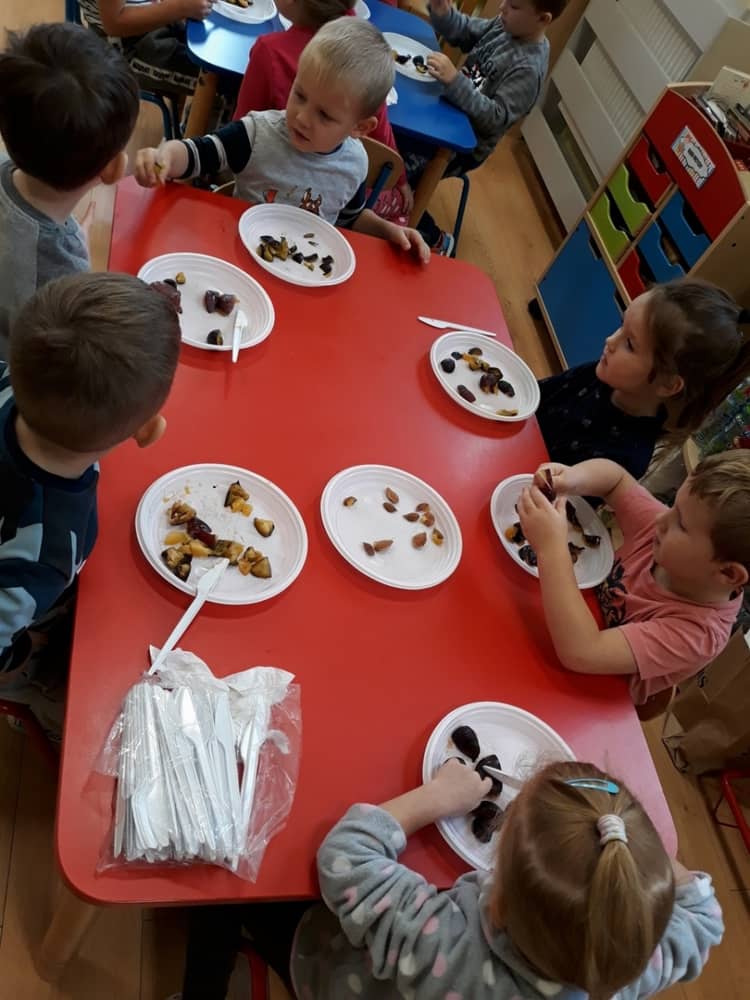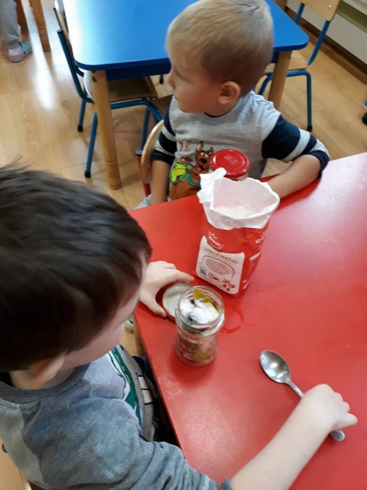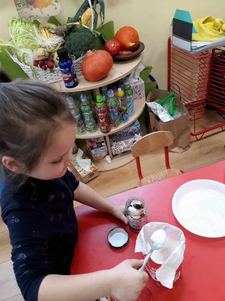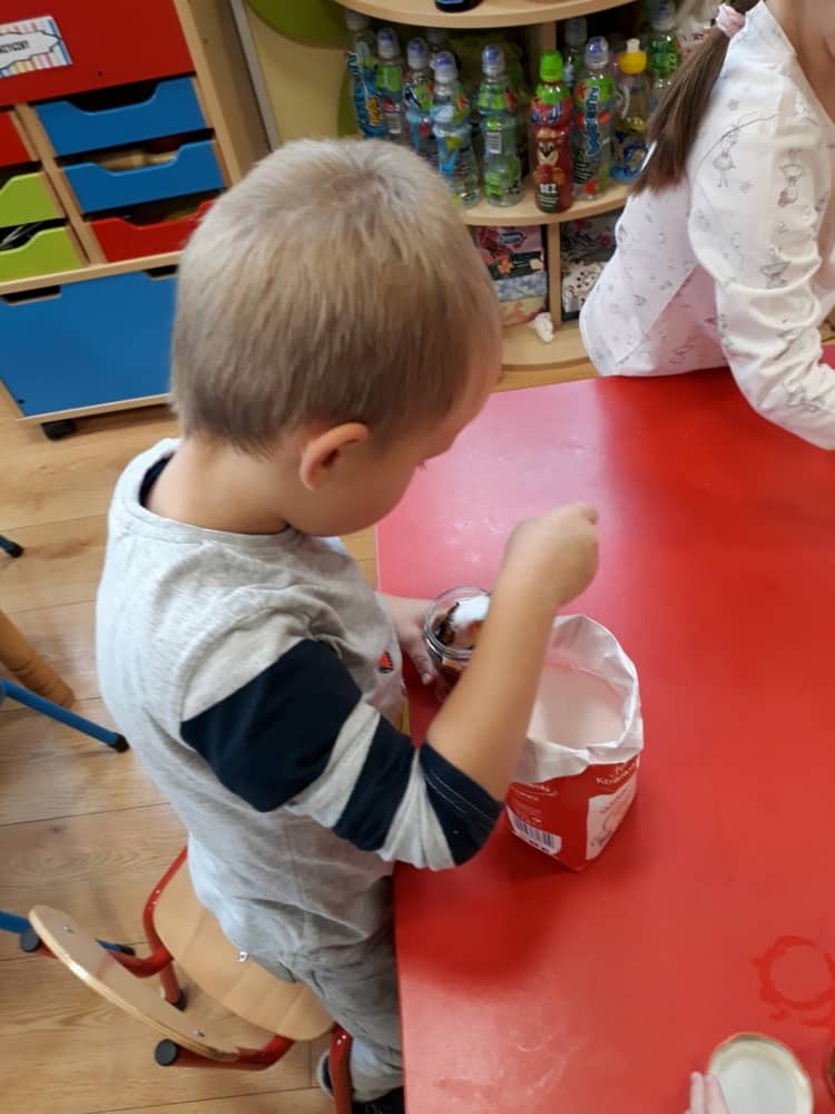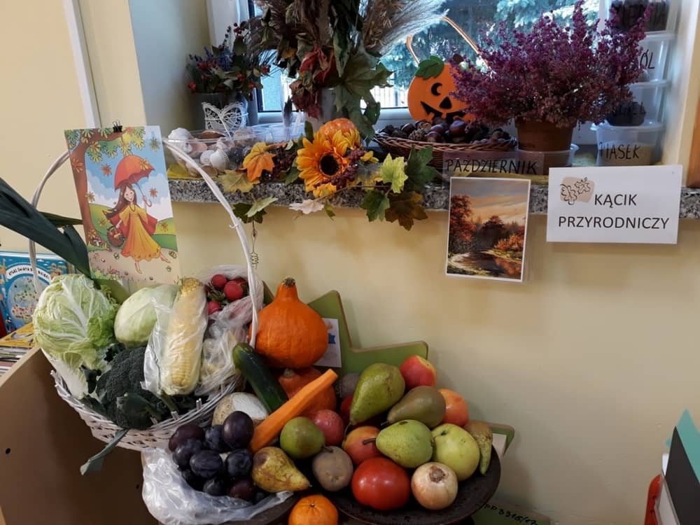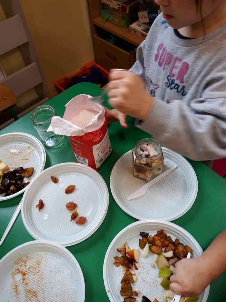 Jesień to wspaniała pora roku, która przynosi w darze bezcenne skarby. W drugim tygodniu października grupa „Pracowitych Pszczółek” odkrywała krainę warzyw i owoców oraz udekorowała swój kącik przyrodniczy wyśmienitymi okazami. W trakcie zajęć dzieci poznawały walory smakowe, zapachowe oraz wartości odżywcze zgromadzonych w kąciku owoców i warzyw. Bardzo atrakcyjnym dla nich wyzwaniem było samodzielne przygotowanie kompotu z trzech owoców- jabłka, gruszki i śliwki. Umyte owoce i czyste ręce były początkiem przygody kulinarnej. Dzieci samodzielnie kroiły owoce na małe kawałki, następnie przekładały je do słoików i wsypywały kilka łyżeczek cukru. Wszystkie owoce zalano gorącą wodą w zaciszu kuchennym, a dzieci zabrały szczelnie do domu zamknięte i przygotowane do pasteryzacji słoiczki. Kulinarna przygoda wielu witamin zapewne wszystkim doda.