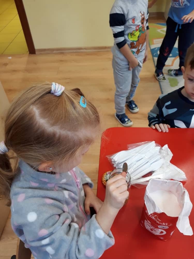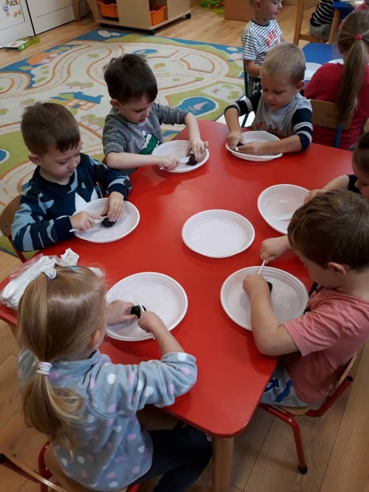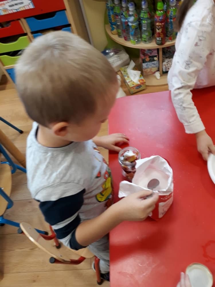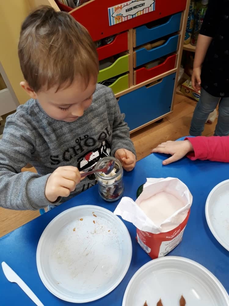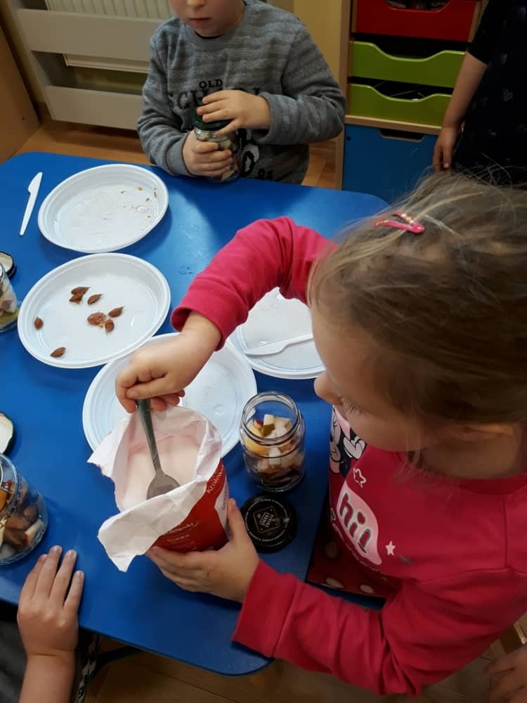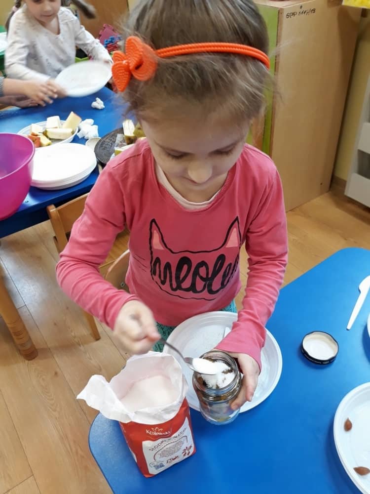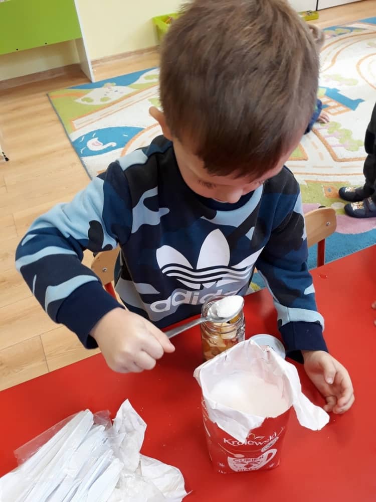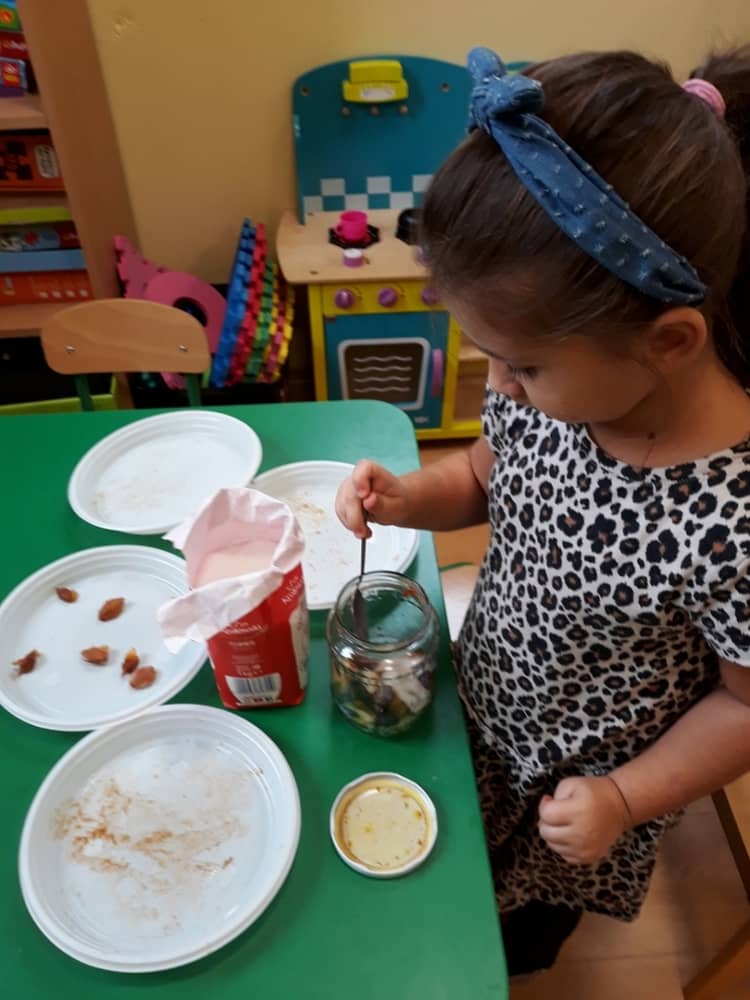 Jesień to wspaniała pora roku, która przynosi w darze bezcenne skarby. W drugim tygodniu października grupa „Pracowitych Pszczółek” odkrywała krainę warzyw i owoców oraz udekorowała swój kącik przyrodniczy wyśmienitymi okazami. W trakcie zajęć dzieci poznawały walory smakowe, zapachowe oraz wartości odżywcze zgromadzonych w kąciku owoców i warzyw. Bardzo atrakcyjnym dla nich wyzwaniem było samodzielne przygotowanie kompotu z trzech owoców- jabłka, gruszki i śliwki. Umyte owoce i czyste ręce były początkiem przygody kulinarnej. Dzieci samodzielnie kroiły owoce na małe kawałki, następnie przekładały je do słoików i wsypywały kilka łyżeczek cukru. Wszystkie owoce zalano gorącą wodą w zaciszu kuchennym, a dzieci zabrały szczelnie do domu zamknięte i przygotowane do pasteryzacji słoiczki. Kulinarna przygoda wielu witamin zapewne wszystkim doda.