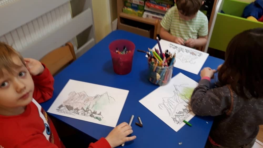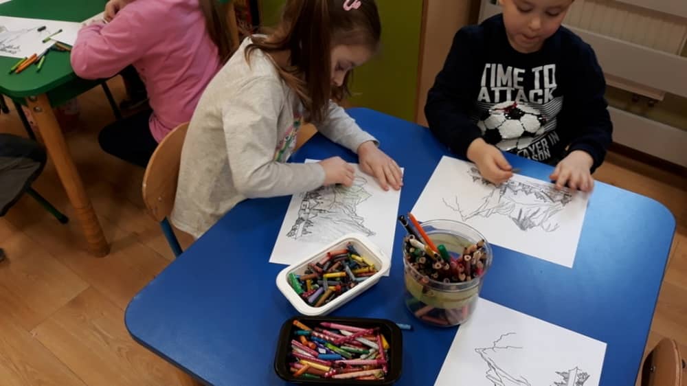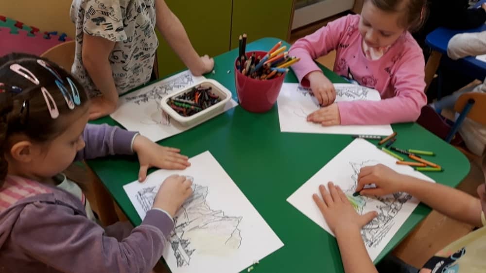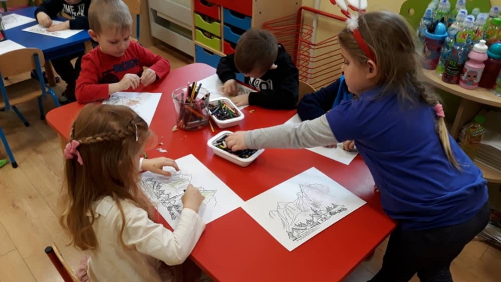 W dniu 27.02.2020 w ramach realizacji programu „Przyroda to przygoda”, przeprowadzono kolejne zajęcia tym razem o tematyce gór. W ramach zajęć, dzieci obejrzały film edukacyjny i zgromadziły wiadomości o walorach przyrodniczych gór i ich znaczeniu dla życia człowieka. Następnie wysłuchały wiersza Agnieszki Karcz pt. „Piękno gór” oraz wzięły udział w zabawie ruchowej i opowieści ruchowej, które nawiązywały do wędrówki pieszej w górach. Zwieńczeniem zajęć była praca plastyczna z użyciem kredek woskowych.