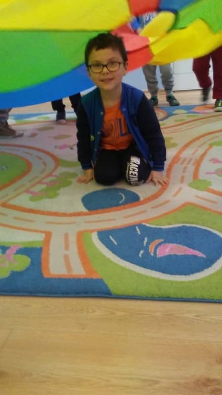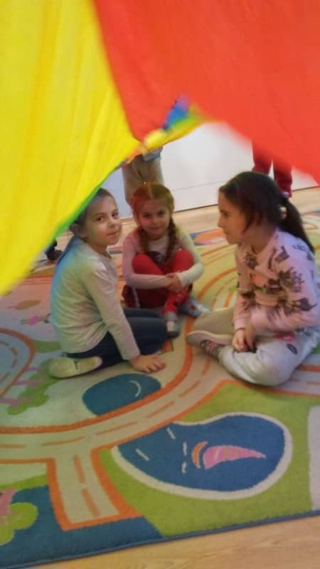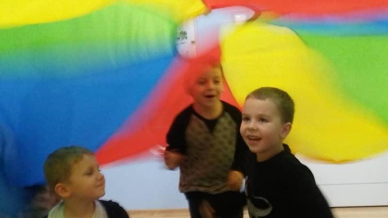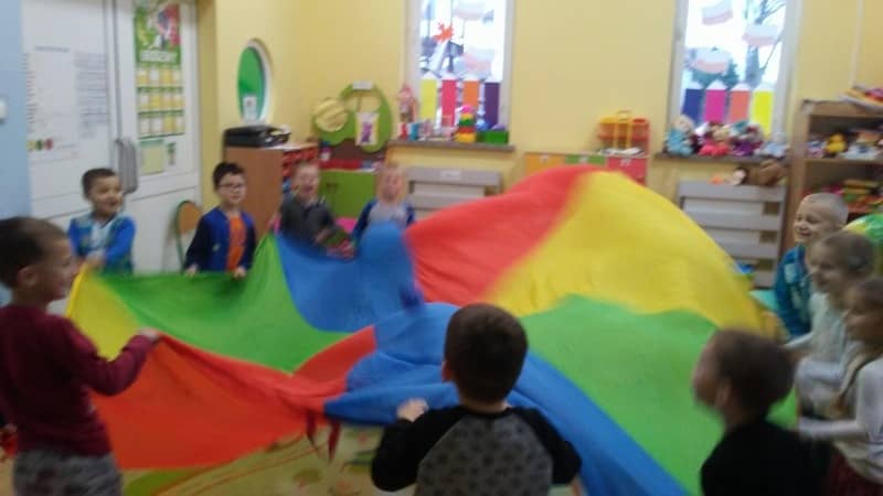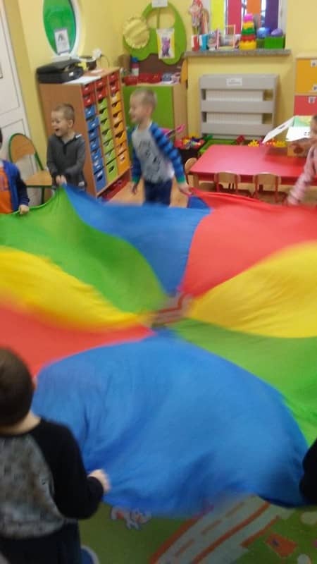 Popołudnia w naszej sali spędzaliśmy biegając, skacząc, podrzucając i chowając się pod wielką i kolorową chustą. Niby takie nic, a jak cieszy…