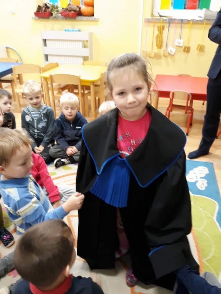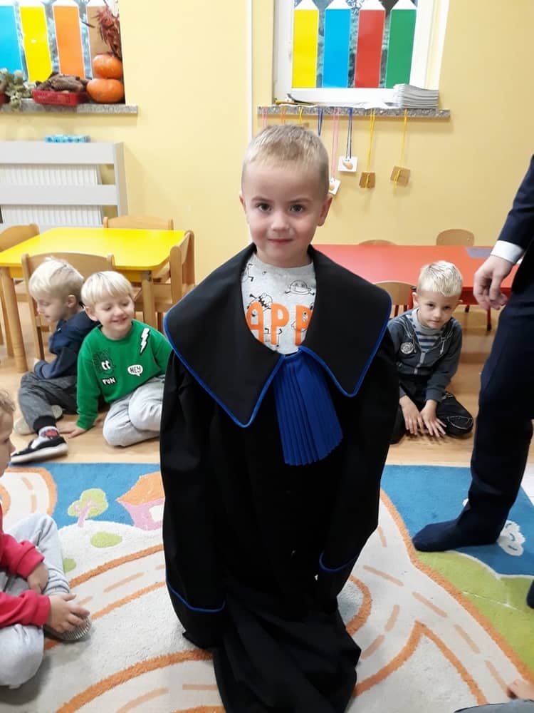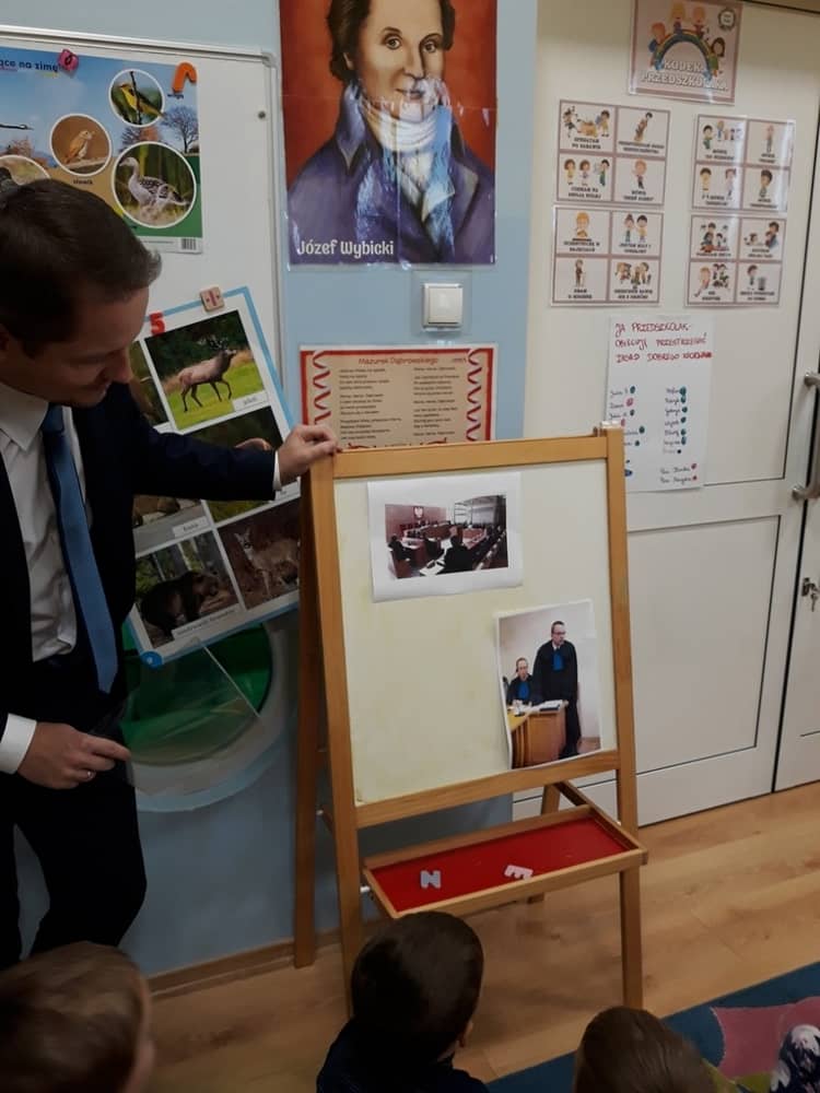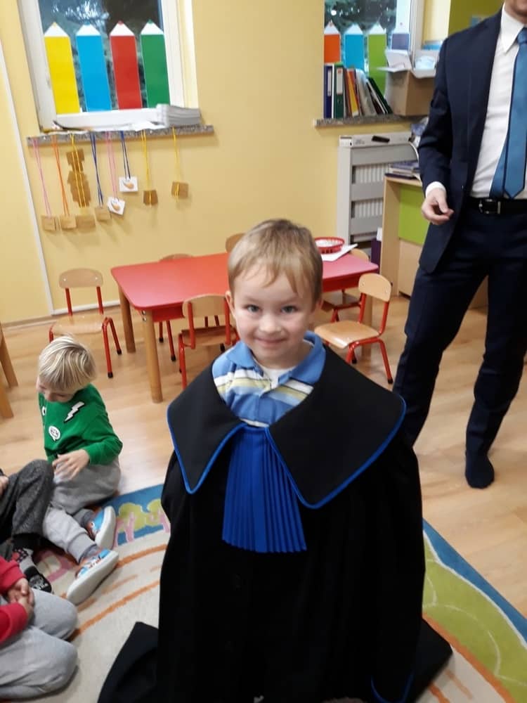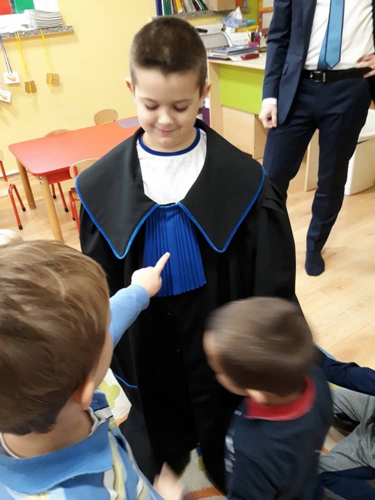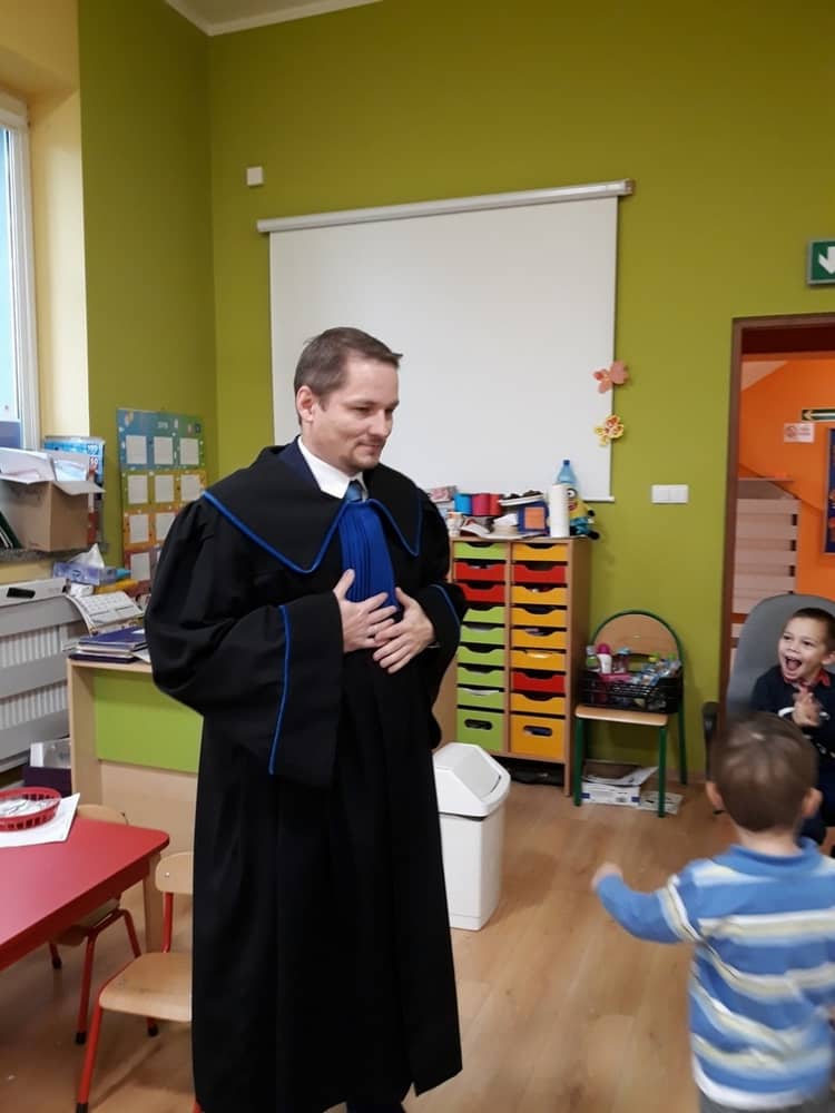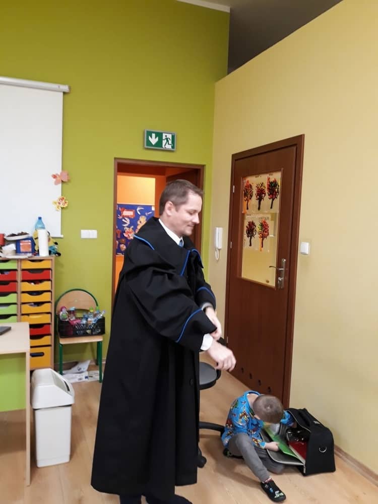 W dniu 25.10.2018 w naszym przedszkolu gościliśmy kolejnego Rodzica, który zaprezentował i zapoznał dzieci z wykonywanym przez siebie zawodem radcy prawnego. Pan prawnik opowiedział dzieciom m.in., co to są umowy i jakie konsekwencje ponosi ktoś, kto nie dotrzymuje danego słowa. Dzieci oglądały różne atrybuty związane z zawodem prawnika. Z zaciekawieniem przyglądały się księdze prawniczej pełnej przepisów, które musi znać każdy radca prawny. Największym zainteresowaniem wśród dzieci cieszyła się toga. Odważne „Tygryski” i „Pszczółki” chętnie przymierzały strój prawnika. Serdeczne podziękowania należą się naszemu Gościowi za zaangażowanie i przybliżenie dzieciom odpowiedzialnej pracy organów prawa.