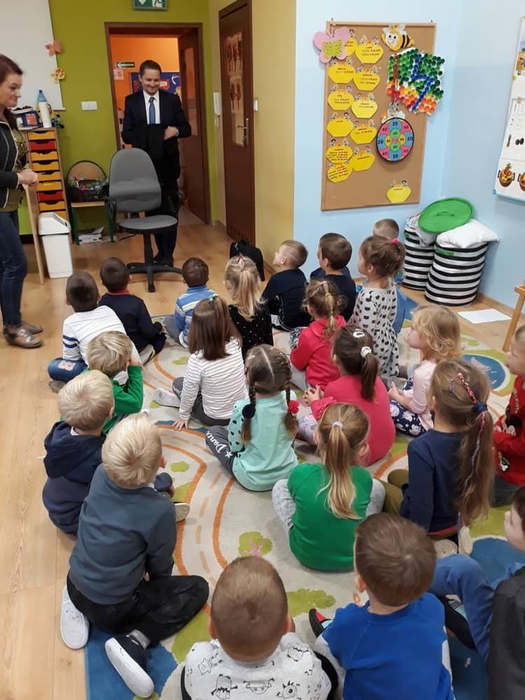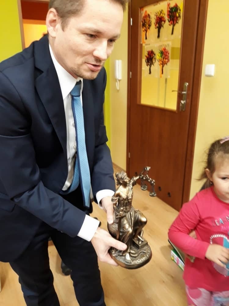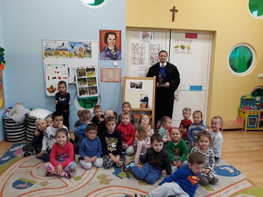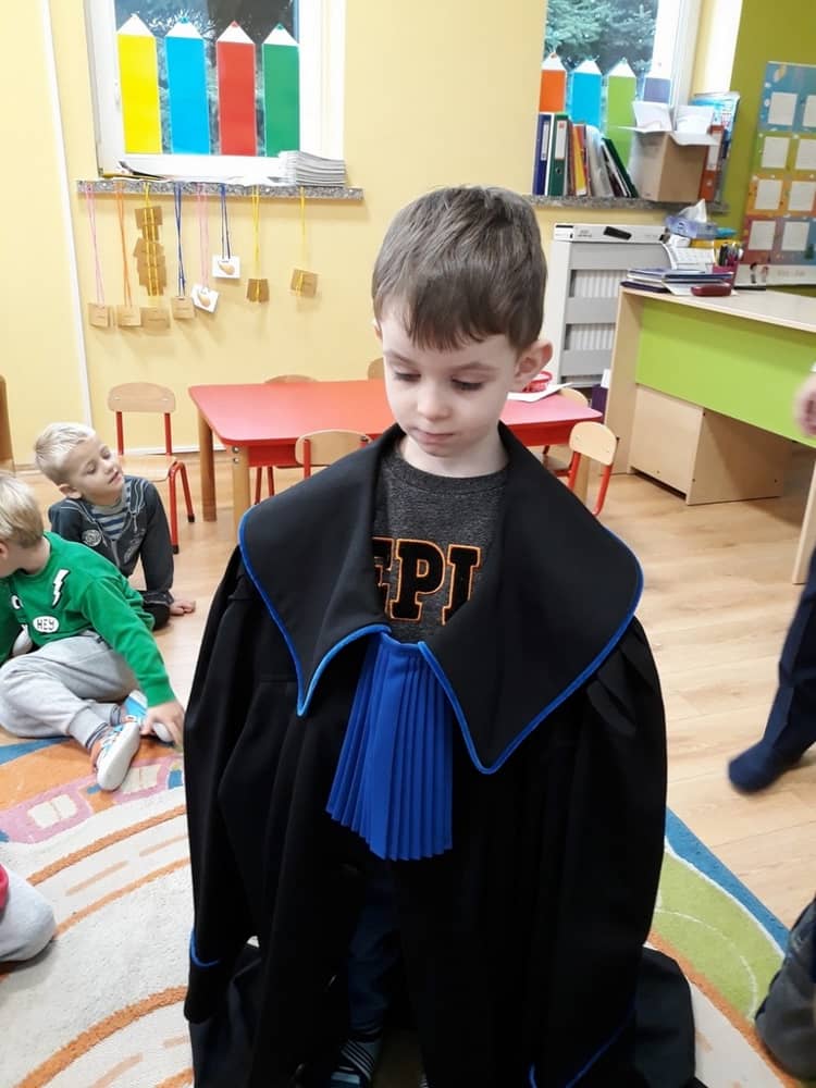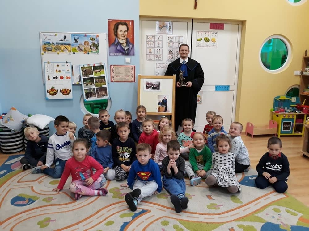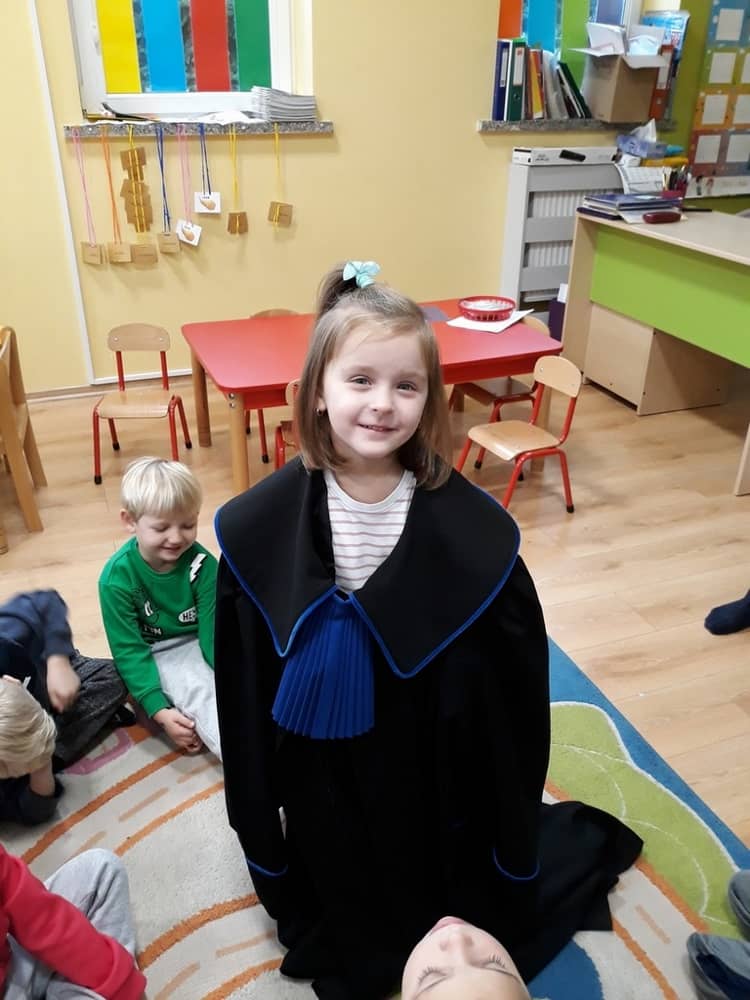 W dniu 25.10.2018 w naszym przedszkolu gościliśmy kolejnego Rodzica, który zaprezentował i zapoznał dzieci z wykonywanym przez siebie zawodem radcy prawnego. Pan prawnik opowiedział dzieciom m.in., co to są umowy i jakie konsekwencje ponosi ktoś, kto nie dotrzymuje danego słowa. Dzieci oglądały różne atrybuty związane z zawodem prawnika. Z zaciekawieniem przyglądały się księdze prawniczej pełnej przepisów, które musi znać każdy radca prawny. Największym zainteresowaniem wśród dzieci cieszyła się toga. Odważne „Tygryski” i „Pszczółki” chętnie przymierzały strój prawnika. Serdeczne podziękowania należą się naszemu Gościowi za zaangażowanie i przybliżenie dzieciom odpowiedzialnej pracy organów prawa.