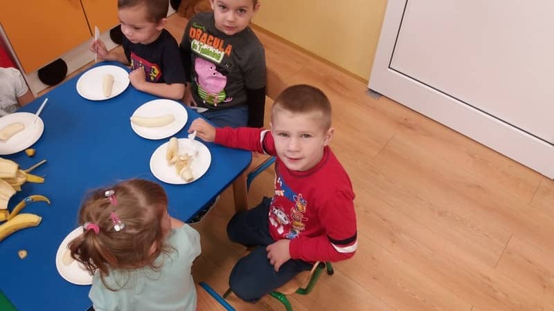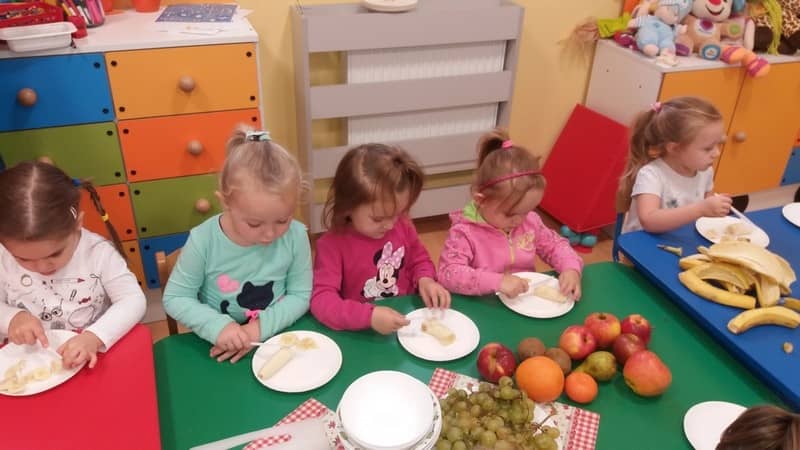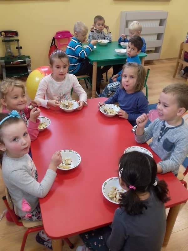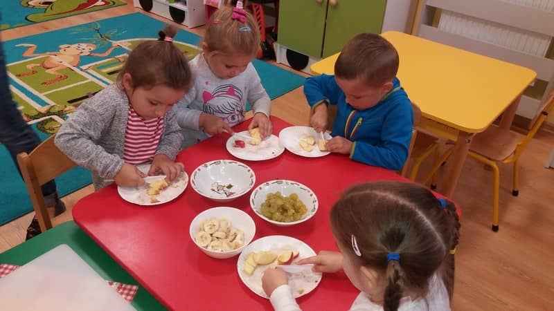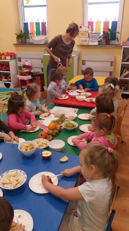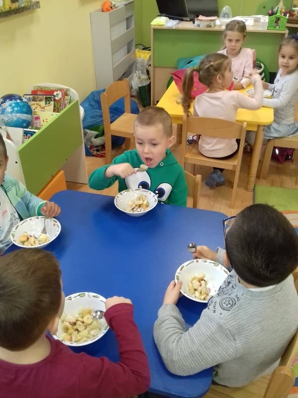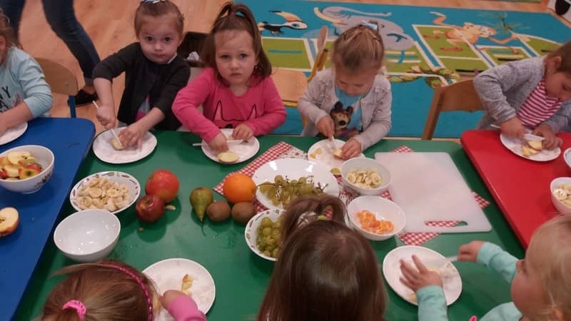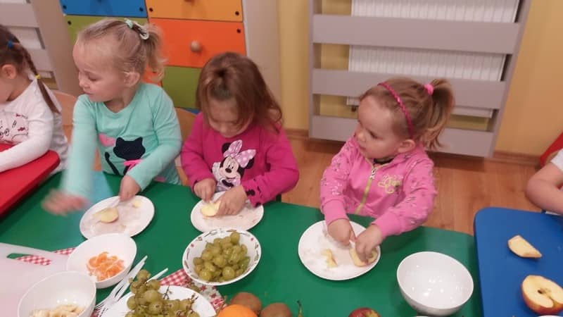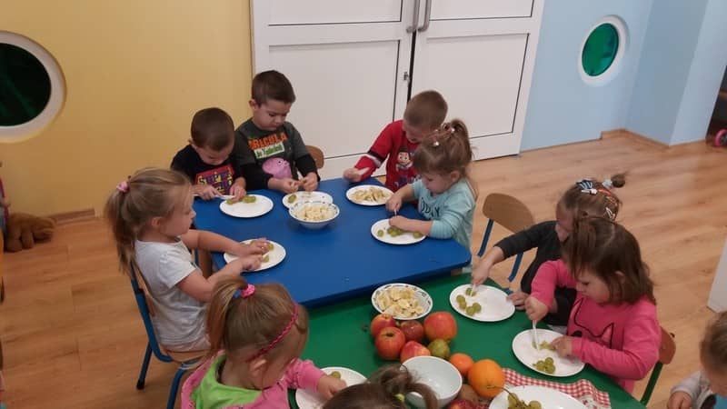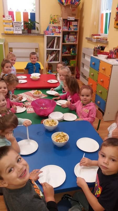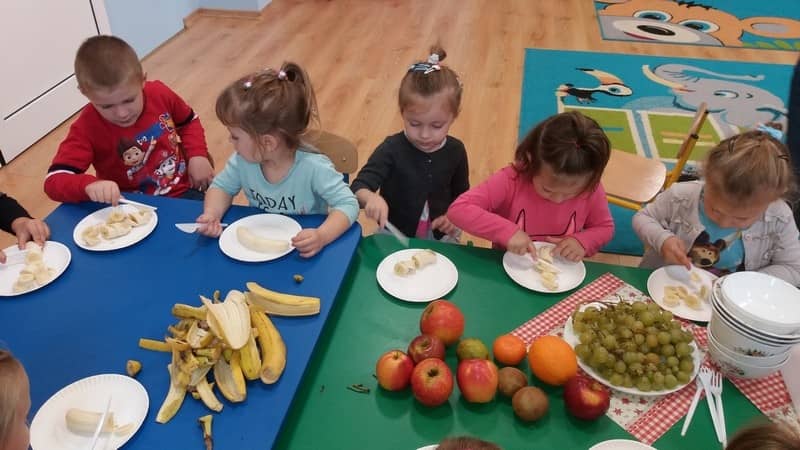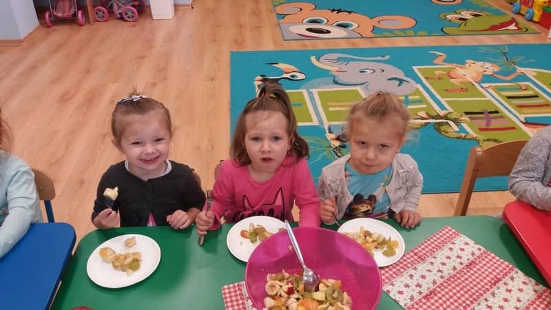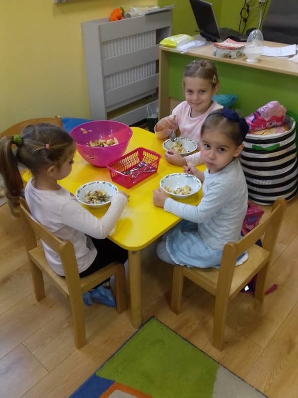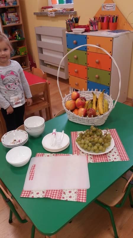 W czwartek 5 października było w naszym przedszkolu smacznie i zdrowo! Dzieci z grupy „Tygryski” na zajęciach własnoręcznie przygotowały pyszną, witaminową sałatkę z owoców, które przyniosły z domu. Przedszkolaki umyły ręce, a następnie wspólnie posegregowały umyte wcześniej przez panią owoce. Każdy dostał tackę i nożyk . Dzieci samodzielnie kroiły owoce na sałatkę, przestrzegając zasad bezpieczeństwa przy posługiwaniu się nożem. Po wymieszaniu ze sobą wszystkich owoców, każdy przedszkolak spróbował pysznej owocowej sałatki. Wszystkim bardzo smakowało wspólne dzieło .