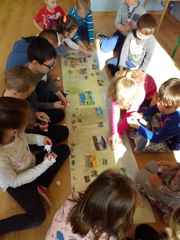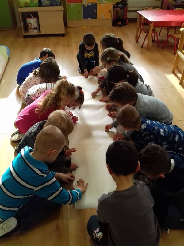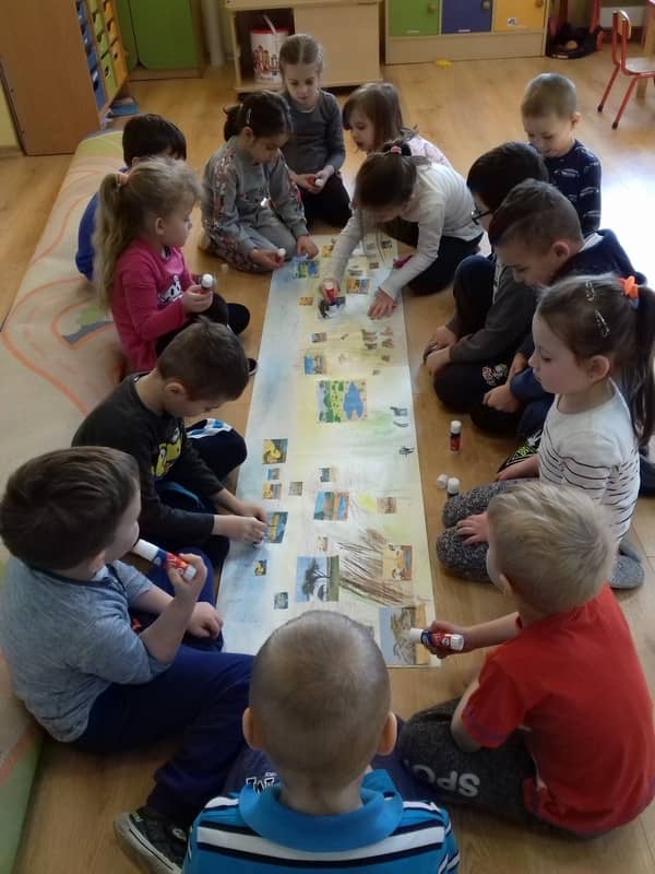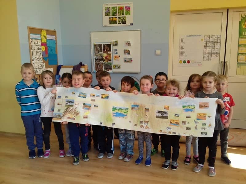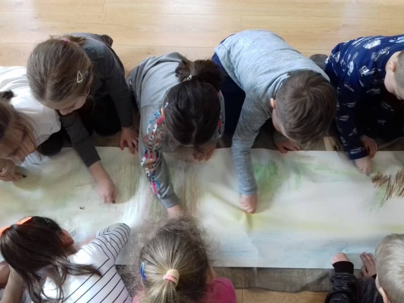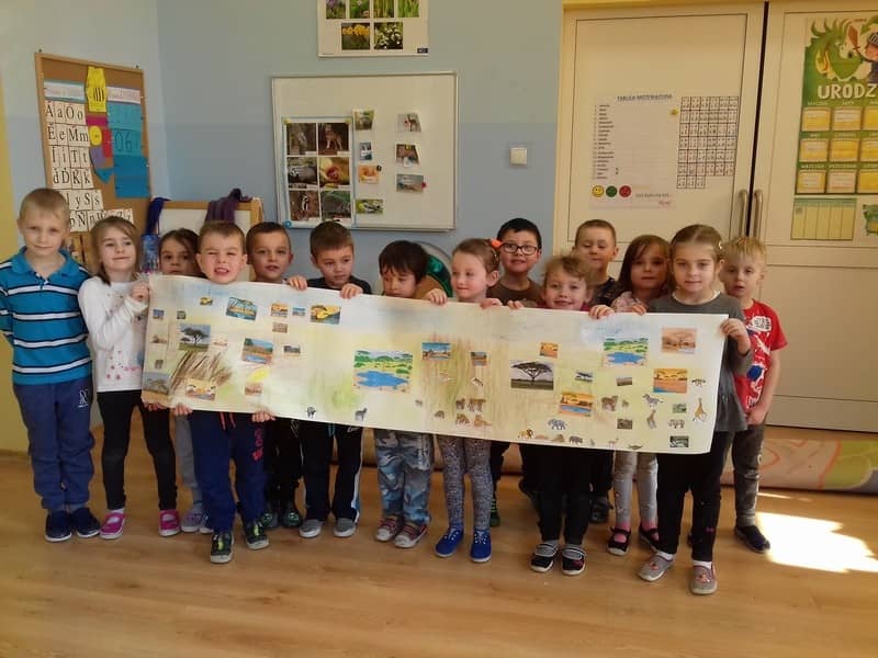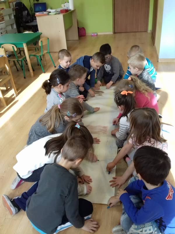 07.03.2018. W tym dniu Pracowite Pszczółki poznały technikę plastyczną Frotaż, która polega na odbijaniu przedmiotów o wyraźnej fakturze na powierzchni papieru. Wszyscy wspólnie na dużym arkuszu papieru rysowali kredkami woskowymi pracę zatytułowaną „Sawanna”. Pod kartką była rozłożona tkanina- lniane płótno. Na końcu dzieci naklejały zwierzęta i roślinność sawanny, tworząc własną kompozycję. To doświadczenie pokazało, że grupa potrafi wspaniale pracować, jako zespół i czerpie z tego wiele radości.