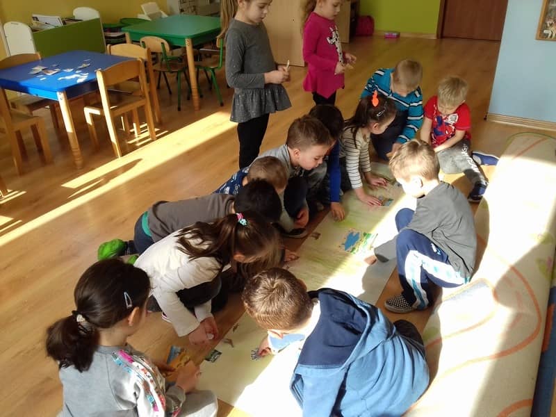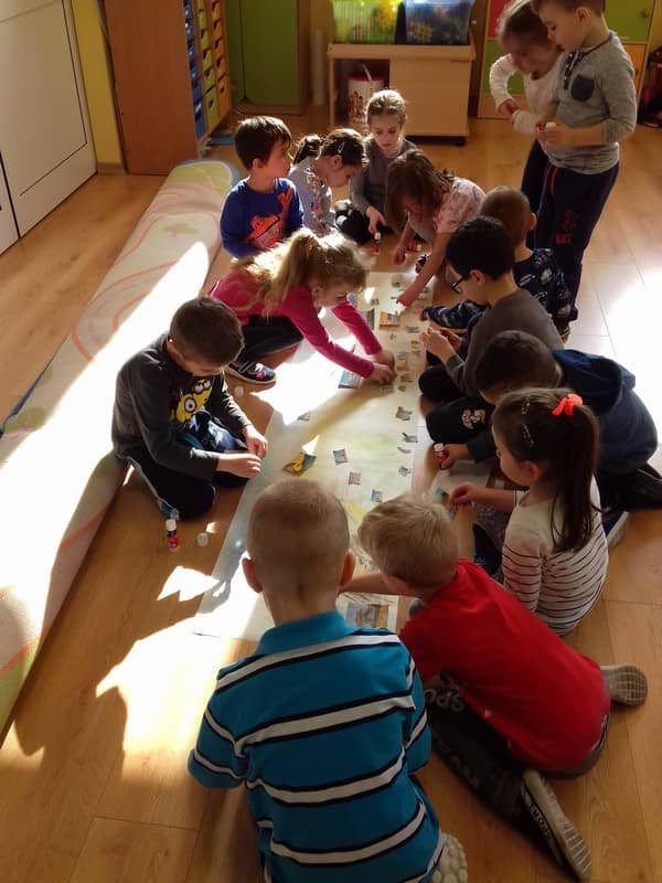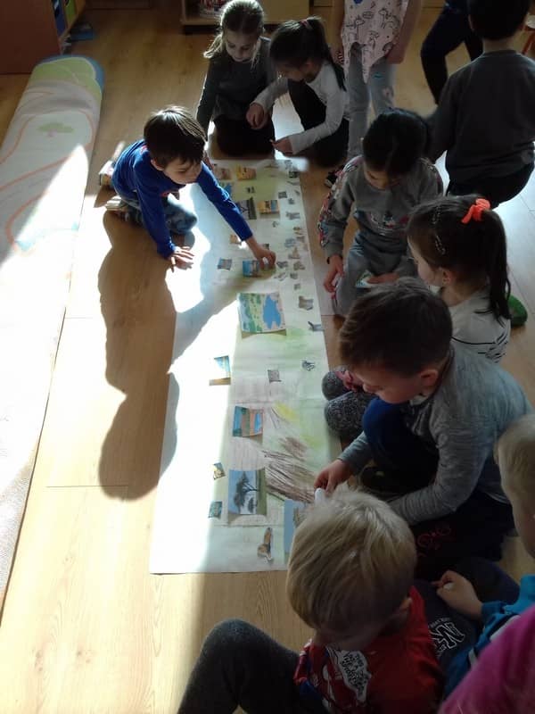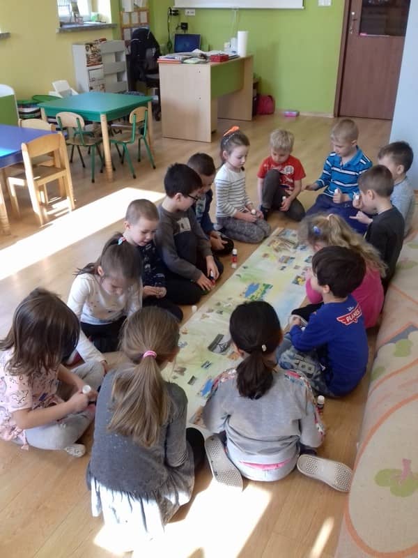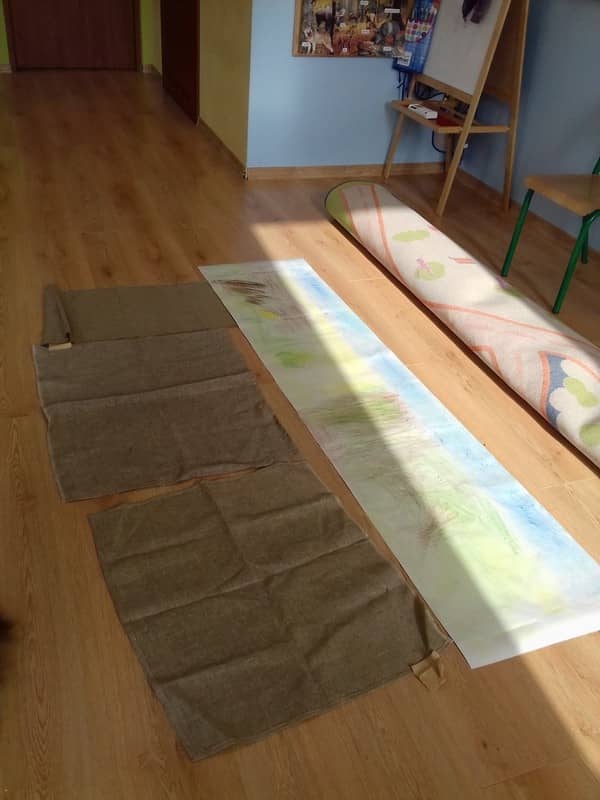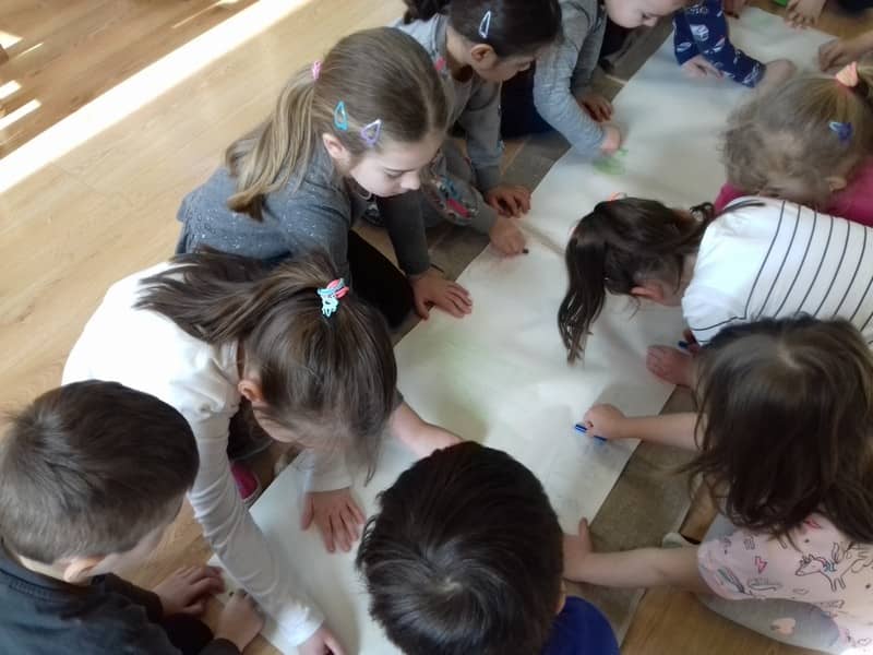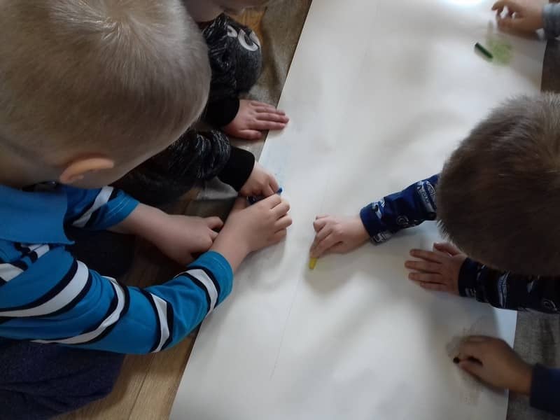 07.03.2018. W tym dniu Pracowite Pszczółki poznały technikę plastyczną Frotaż, która polega na odbijaniu przedmiotów o wyraźnej fakturze na powierzchni papieru. Wszyscy wspólnie na dużym arkuszu papieru rysowali kredkami woskowymi pracę zatytułowaną „Sawanna”. Pod kartką była rozłożona tkanina- lniane płótno. Na końcu dzieci naklejały zwierzęta i roślinność sawanny, tworząc własną kompozycję. To doświadczenie pokazało, że grupa potrafi wspaniale pracować, jako zespół i czerpie z tego wiele radości.