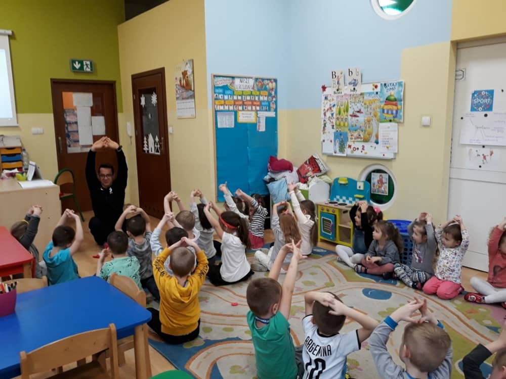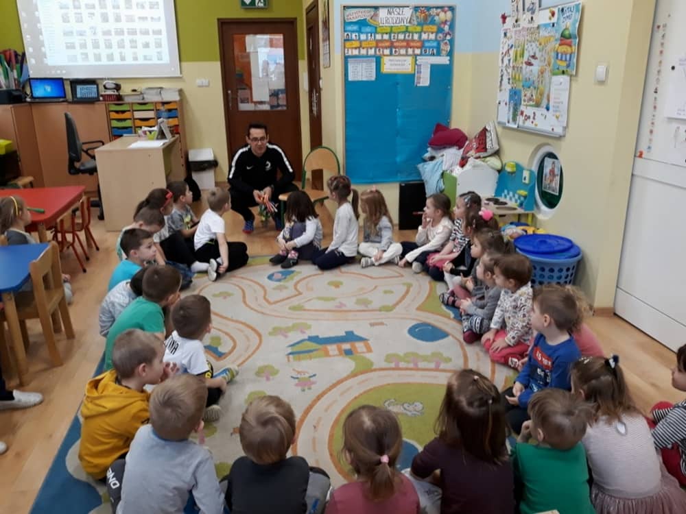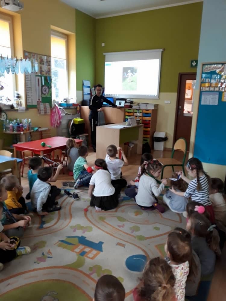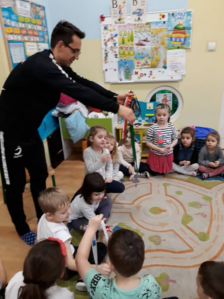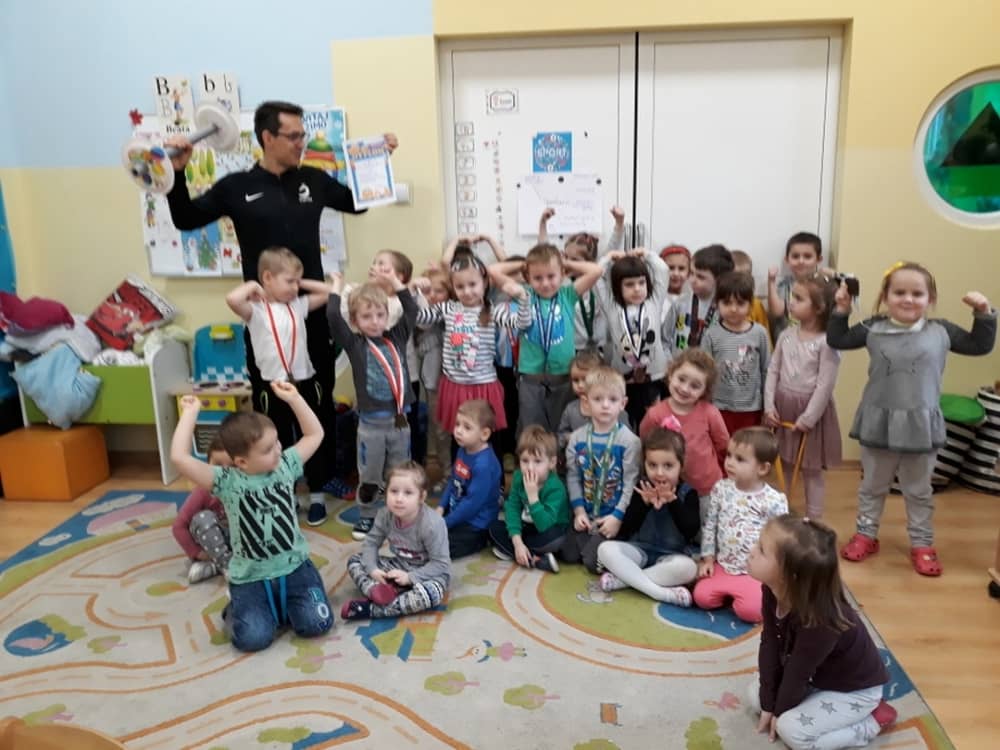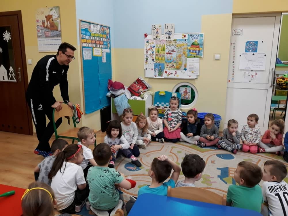 W dniu 14.01.2020 odwiedził nasze przedszkole wyjątkowy gość. Tata Marcelka, Pan Mateusz Barcik, poprowadził zajęcia dotyczące swojego zawodu - Sportowca. Tematyka zajęć przez cały tydzień nawiązywała do tematu, który w sposób profesjonalny zaprezentował Pan Mateusz. Na początku zajęć, dzieci uzyskały odpowiedzi na pytania- kto to jest sportowiec i kto może nim zostać. Następnie Pan Mateusz pokazał dzieciom zdobyte przez siebie medale oraz zaprezentował zdjęcia, ukazujące różne dyscypliny sportowe, sale ćwiczeń, treningi oraz relacje z różnych zawodów i miejsc, które odwiedził. Dodatkowo wspólnie z dziećmi wykonał, krótki trening w pozycji siedzącej. Wiele pytań dzieci i zainteresowanie tematyką sportu, sprzyjało radosnej atmosferze. Na koniec dzieci wręczyły Panu Mateuszowi pamiątkowy dyplom i wykonaną przez siebie sztangę.