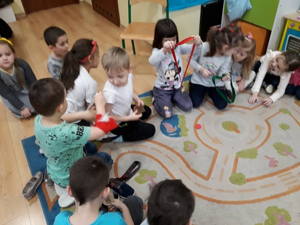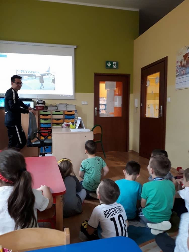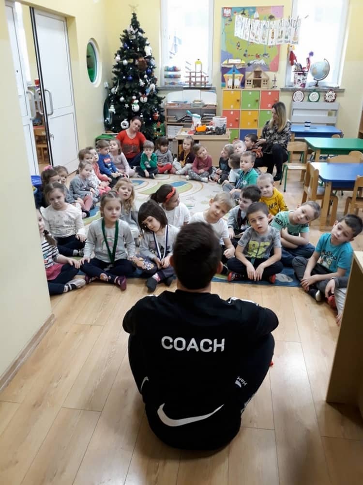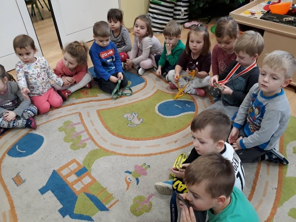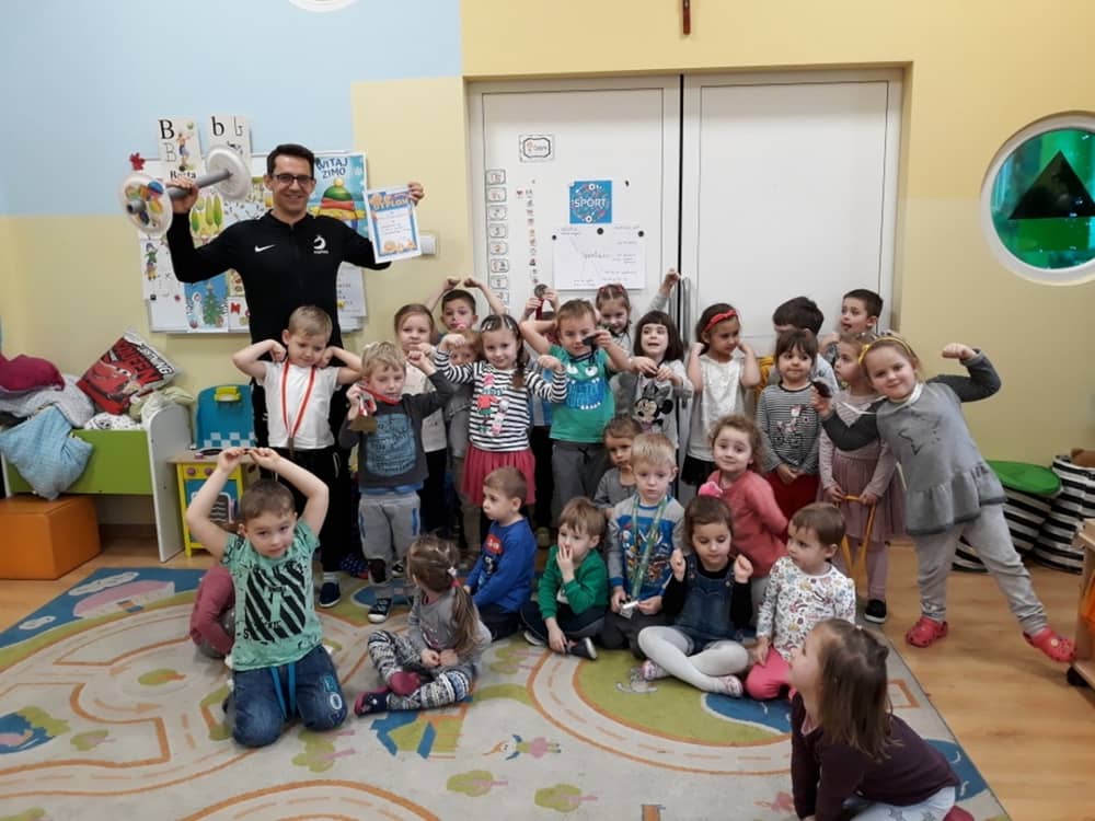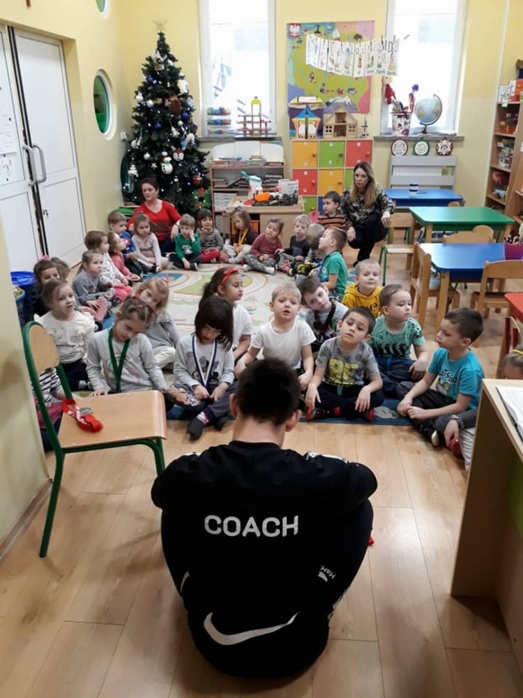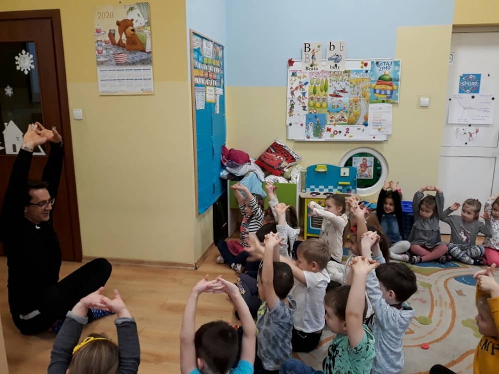 W dniu 14.01.2020 odwiedził nasze przedszkole wyjątkowy gość. Tata Marcelka, Pan Mateusz Barcik, poprowadził zajęcia dotyczące swojego zawodu - Sportowca. Tematyka zajęć przez cały tydzień nawiązywała do tematu, który w sposób profesjonalny zaprezentował Pan Mateusz. Na początku zajęć, dzieci uzyskały odpowiedzi na pytania- kto to jest sportowiec i kto może nim zostać. Następnie Pan Mateusz pokazał dzieciom zdobyte przez siebie medale oraz zaprezentował zdjęcia, ukazujące różne dyscypliny sportowe, sale ćwiczeń, treningi oraz relacje z różnych zawodów i miejsc, które odwiedził. Dodatkowo wspólnie z dziećmi wykonał, krótki trening w pozycji siedzącej. Wiele pytań dzieci i zainteresowanie tematyką sportu, sprzyjało radosnej atmosferze. Na koniec dzieci wręczyły Panu Mateuszowi pamiątkowy dyplom i wykonaną przez siebie sztangę.