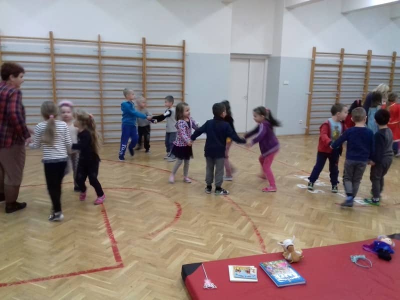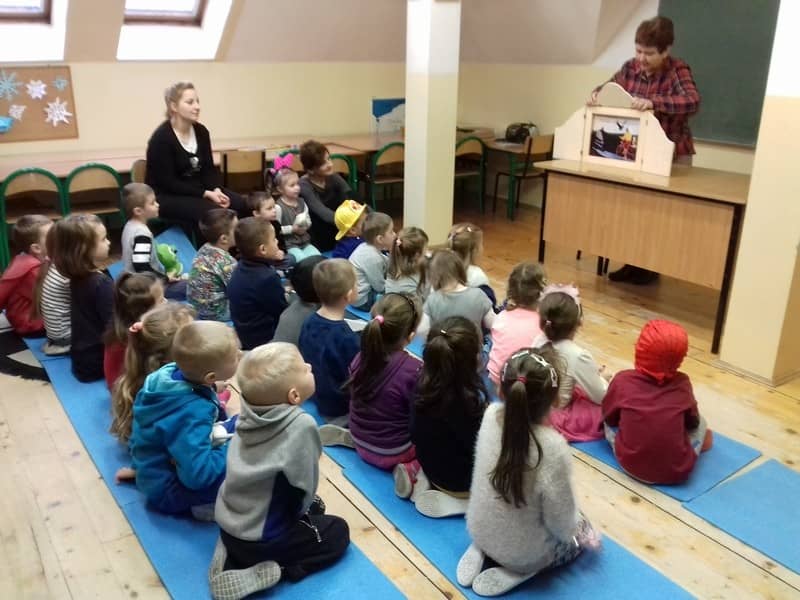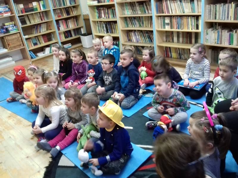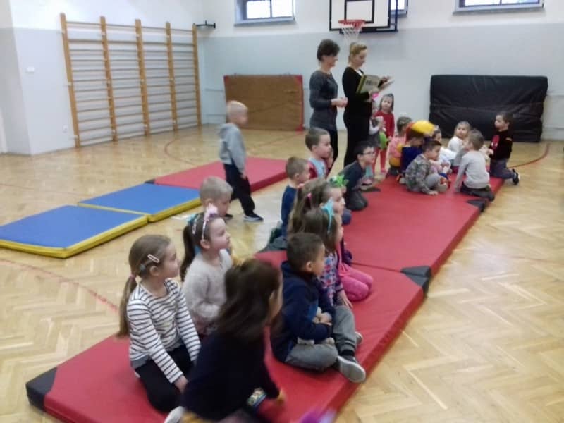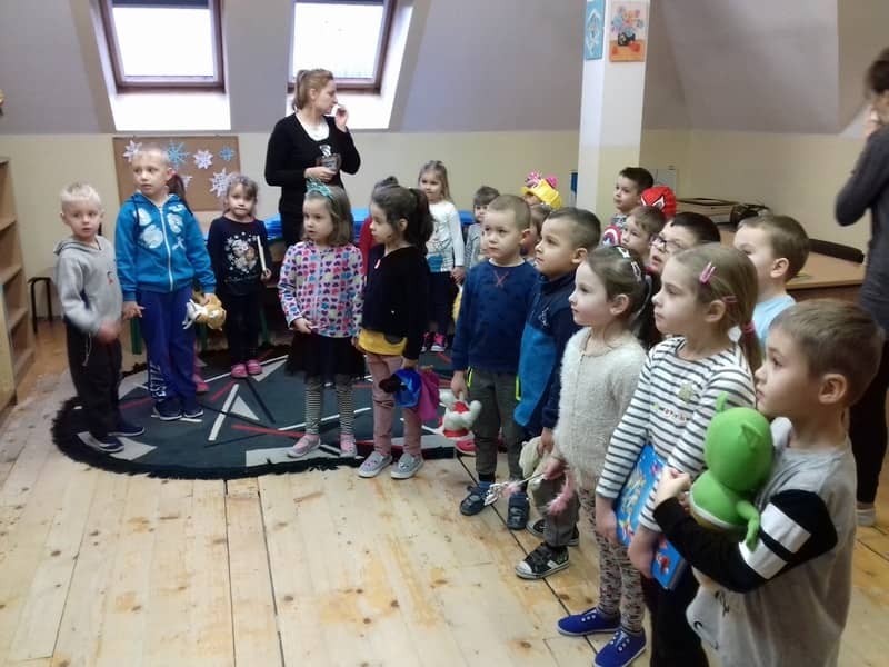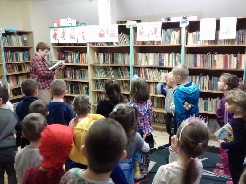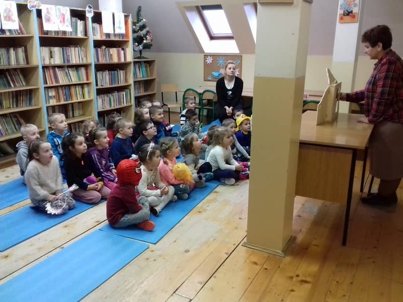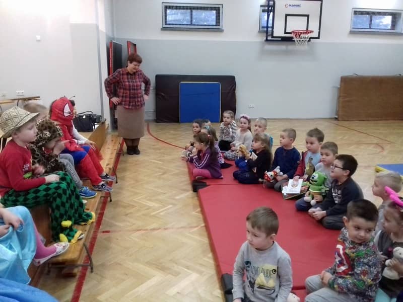 W dniu 12.01.2017 dzieci z oddziałów przedszkolnych i zerówki przeniosły się w świat bajek oraz odwiedziły Szkolną Bibliotekę. Na sali gimnastycznej w ramach zajęć, zgromadziły się by zaprezentować bajkowe stroje i rekwizyty, posłuchać zagadek bajkowych oraz występu wokalnego, a na zakończenie wykonać wspólny taniec do bajkowych melodii. Kolejną atrakcją było zwiedzanie szkolnej biblioteki, w której zaprezentowane zostały księgozbiory, omówione zasady korzystania z książek i sposób ich wypożyczania. Dzieci mogły również wcieli się w rolę widza i przedstawiono im teatrzyk z wykorzystaniem kolorowych ilustracji. Po powrocie do przedszkola dzieci wykonały zakładki do książek i zaprezentowały swoje książeczki.
