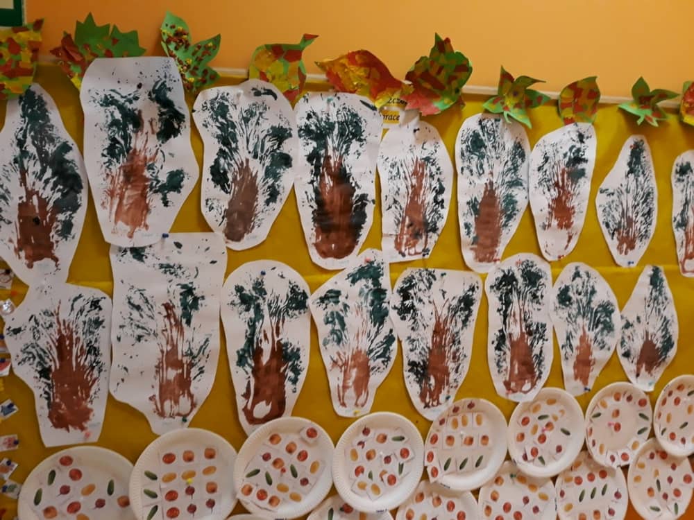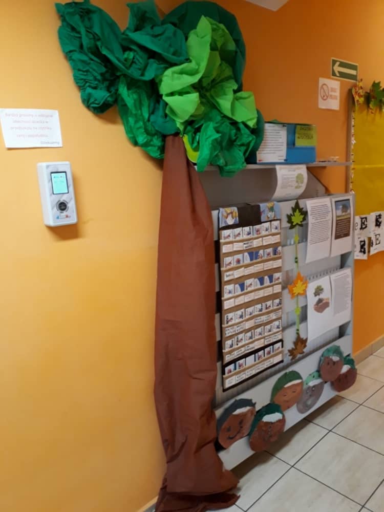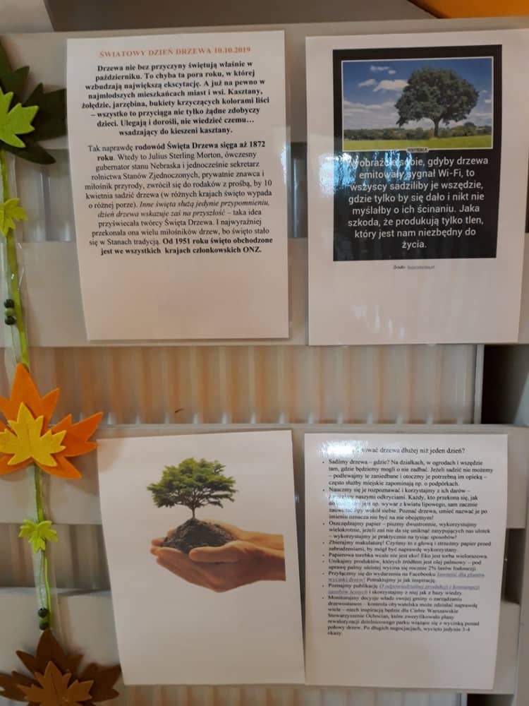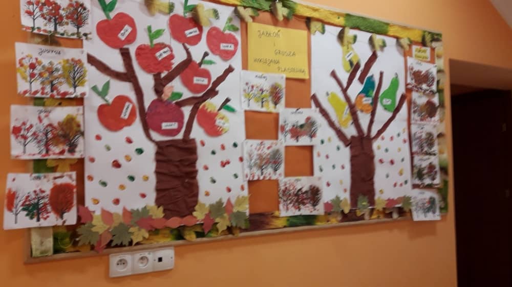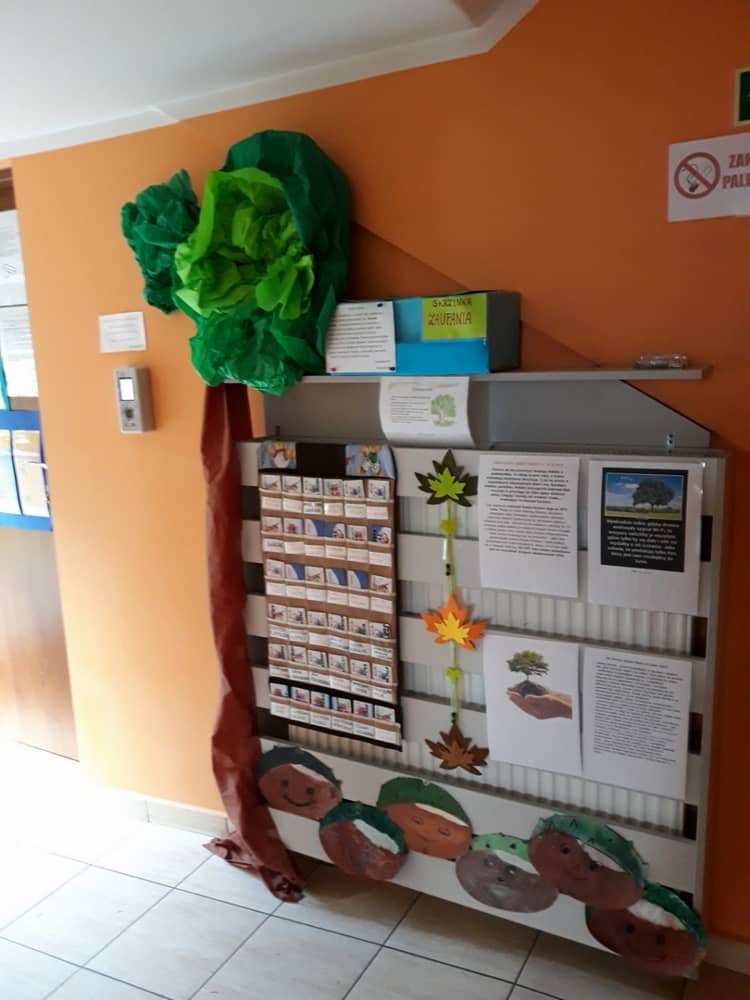 W dniu 10.10.2019 r. obchodziliśmy w przedszkolu Światowy Dzień Drzewa. Wszyscy w tym dniu przyszli ubrani w barwach zielono - brązowych. W korytarzu przedszkolnym przywitało wszystkich wyjątkowe drzewko, a na gazetce zamieszczono ciekawostki i informacje dotyczące Światowego Dnia Drzewa. Rodzice mogli także dowiedzieć się, jaki sposób można troszczyć się o drzewa i jak bardzo są one potrzebne wszystkim ludziom. Na zajęciach dzieci obejrzały film edukacyjny pt. „Las- zielone płuca Ziemi”. Ukazał on dzieciom jak należy dbać o las i jak cennym skarbem są drzewa- dają ludziom tlen, papier, chłód i wiele innych korzyści. Dzieci z grupy młodszej wyklejały plasteliną owoce na jabłoni i gruszy. Oprócz tego malowały paluszkiem kolorowy jesienny las. Dzieci z grupy starszej, malowały farbami i odbijały stemple. W ten sposób powstały piękne drzewa, które zaprezentowano na wystawie.