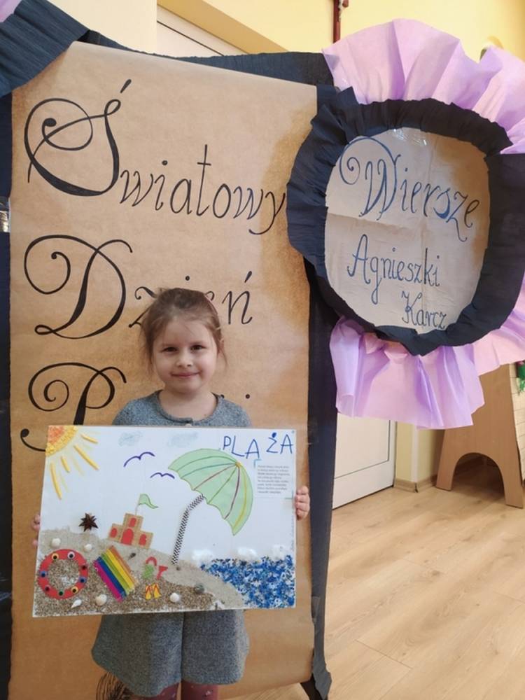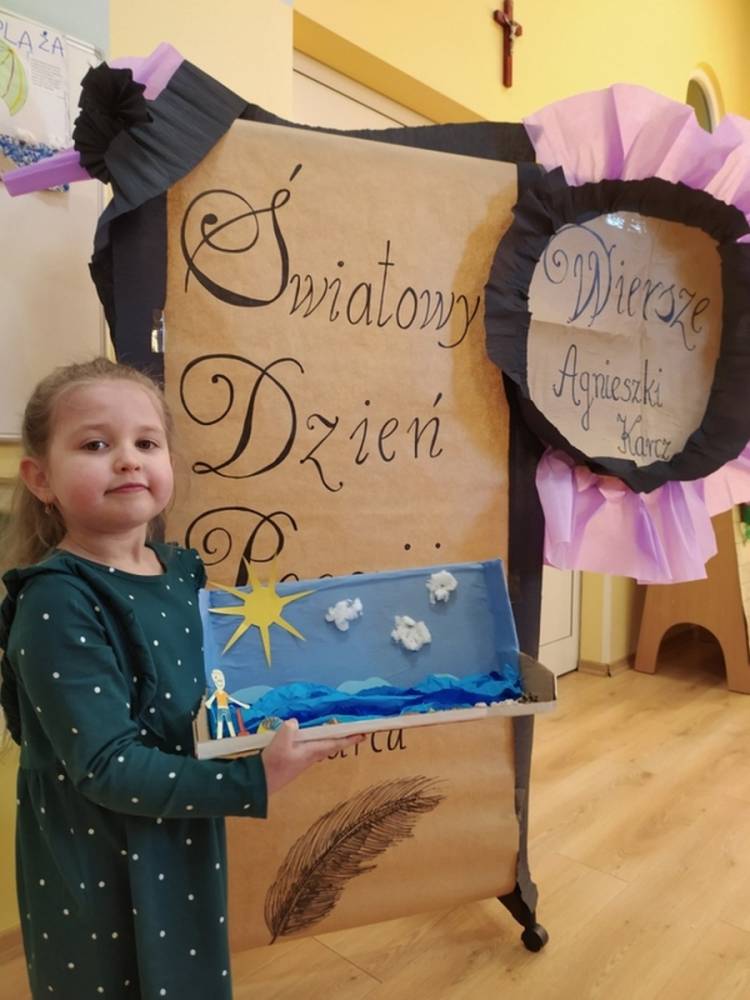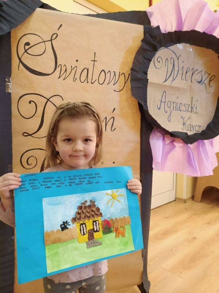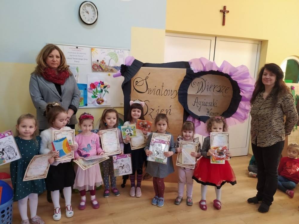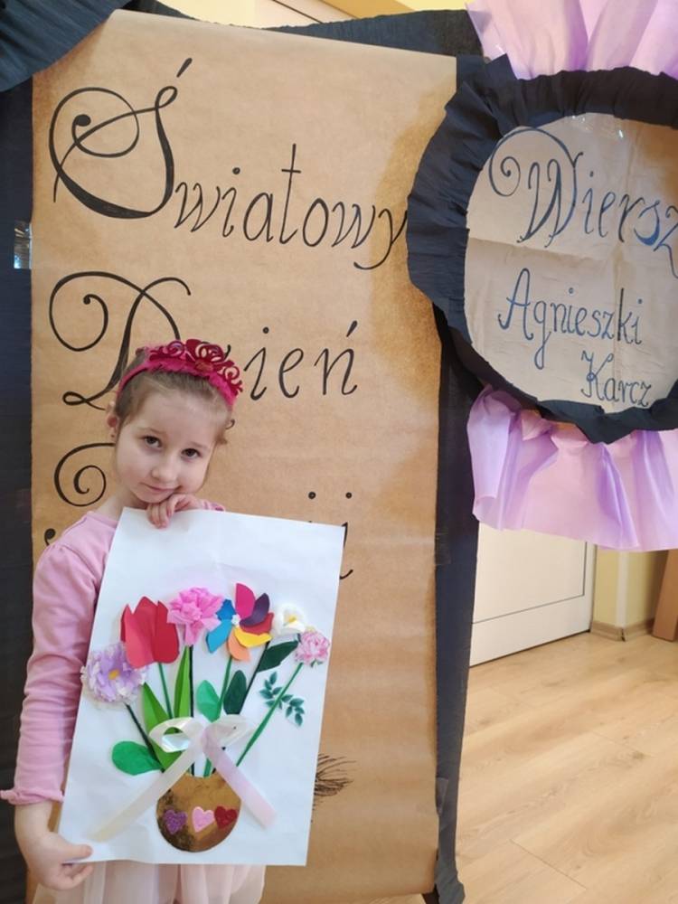 W dniu 22.03.2021 odbyła się uroczysta inauguracja konkursu plastyczno- recytatorskiego zorganizowanego z okazji obchodów Światowego Dnia Poezji. Inicjatorką konkursu była nauczycielka Agnieszka Karcz. To właśnie jej autorskie wiersze, były inspiracją dla twórczości plastycznej dzieci oraz recytatorskim wyzwaniem. W konkursie wzięło udział 26 dzieci. Recytacja wierszy odbyła się w formie stacjonarnej oraz online przy użyciu komunikatora Teams. Prace plastyczne zostały zaprezentowane na wystawach zorganizowanych w szkole i przedszkolu oraz w galerii wirtualnej. Wszyscy uczestnicy konkursu otrzymali pamiątkowe dyplomy i upominki, które uroczyście wręczone zostały przez Panią Dyrektor i autorkę wierszy Agnieszkę Karcz.