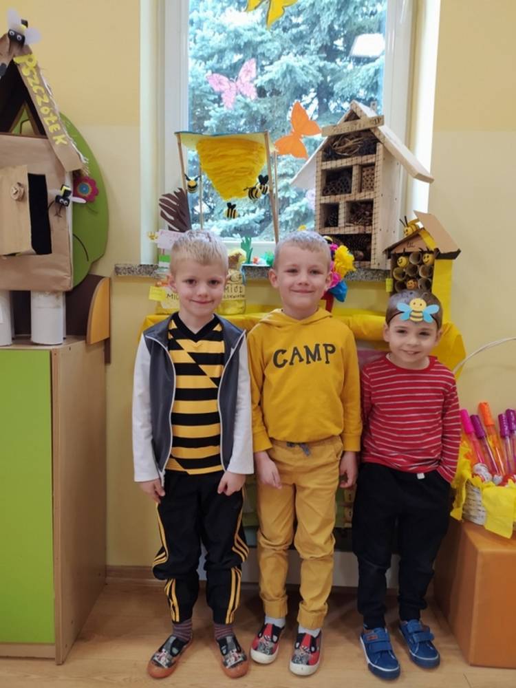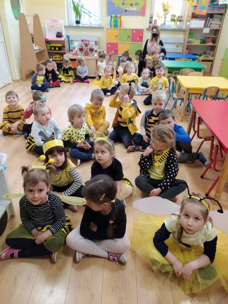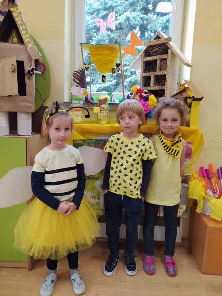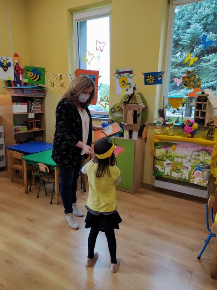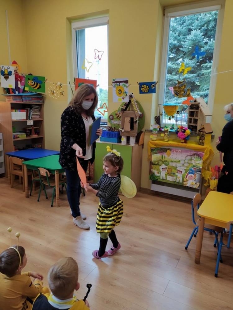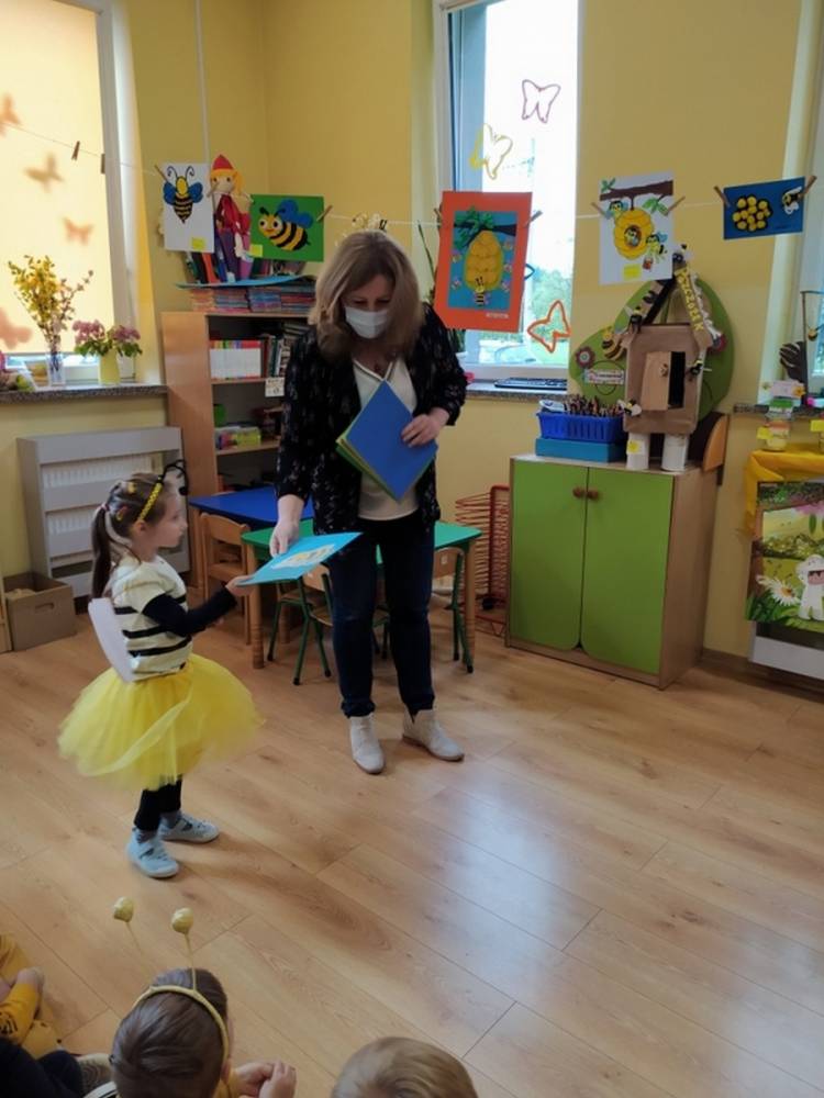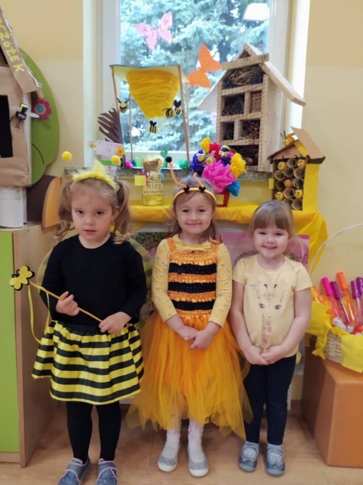 Światowy Dzień Pszczoły to dla naszych przedszkolaków bardzo ważne wydarzenie. W dniu 20.05.2021 przypomnieliśmy sobie o tym, jak ważną rolę odgrywają pszczoły w życiu człowieka oraz o tym, jak powstaje miód, który dostarcza nam walorów smakowych i zdrowotnych. Dzieci wysłuchały wiersza o pszczołach oraz same wczuły się w rolę tych niezwykle pracowitych owadów. Zabawy ruchowe były wspaniałą okazją do zaprezentowania swoich sprawności ruchowych oraz swojego pięknego przebrania. W tym dniu odwiedziła dzieci Pani Dyrektor, by nagrodzić wszystkich uczestników konkursu plastycznego zatytułowanego „Podarunki od pszczółki”. Wręczenie dyplomów i upominków odbyło się przy zorganizowanej wystawie prac konkursowych.