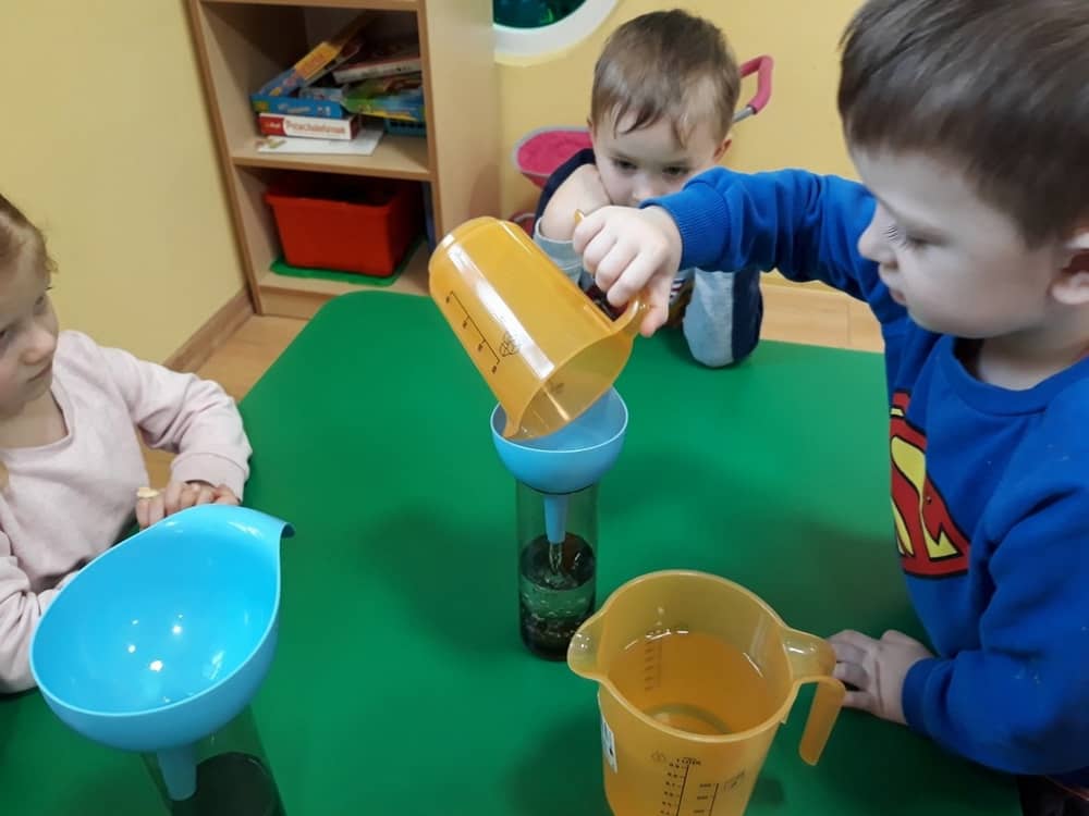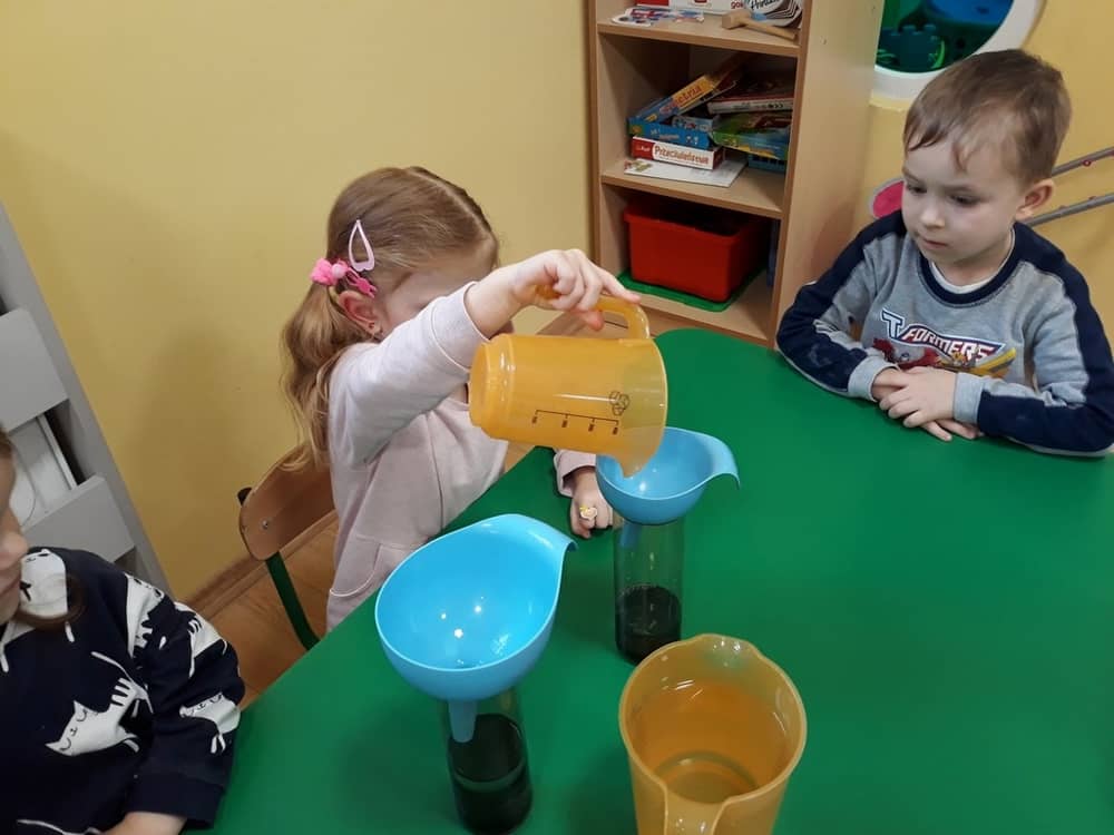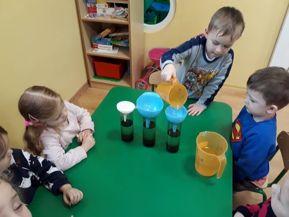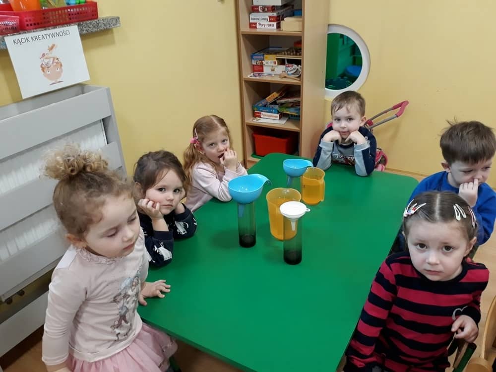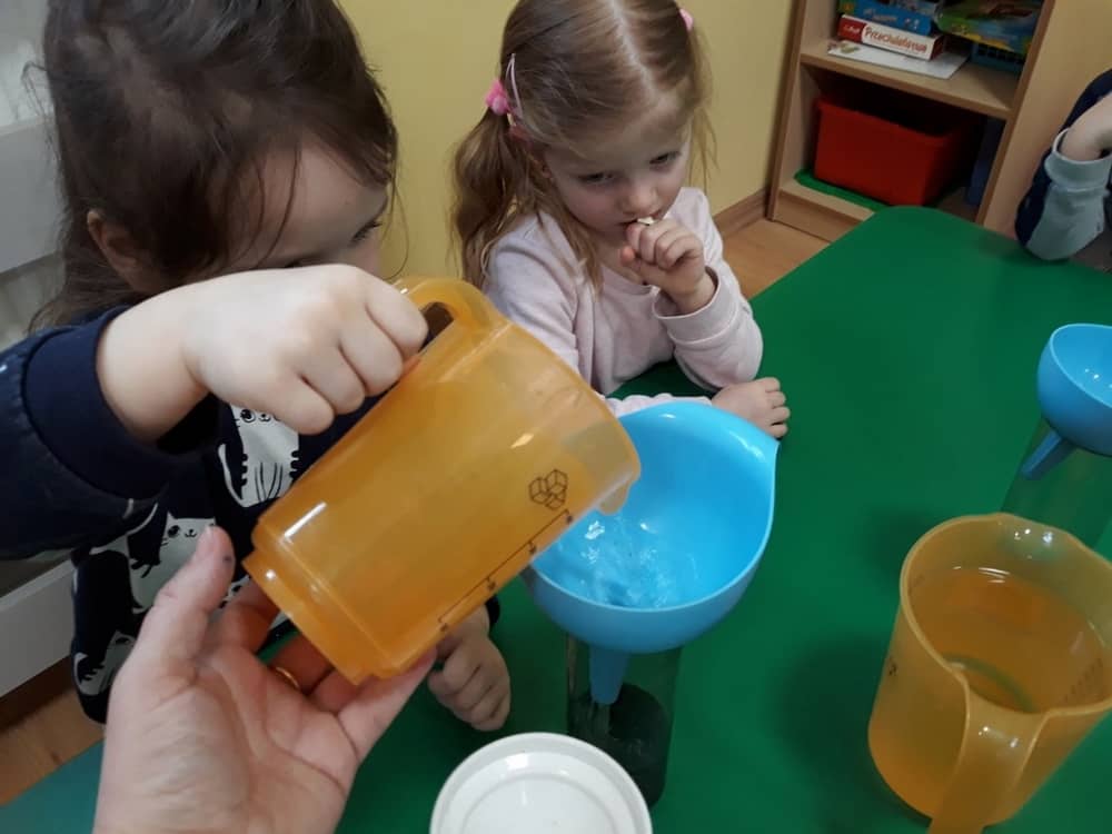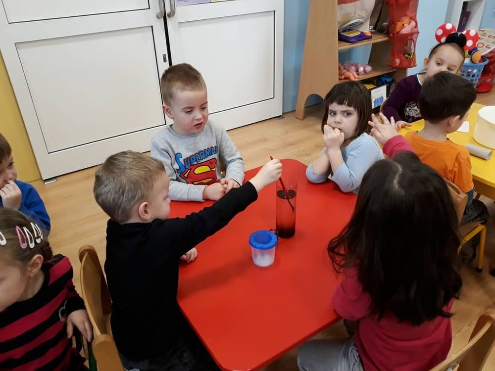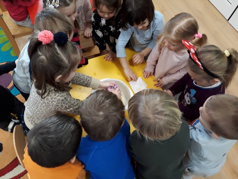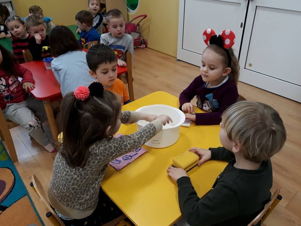 W dniu 11.02.2019 Przedszkolaki z oddziału Tygrysków, odkryły kilka tajemnic Tdotyczących wody. Na początku zajęć dzieci poznały zjawisko skraplania i parowania, a następnie dowiedziały się, co to jest obieg wody w przyrodzie. Wspólnie z nauczycielem próbowały odpowiedzieć na pytania- skąd bierze się woda? Czy kiedyś się skończy? Do czego jest potrzeba i komu? Następnie dzieci brały udział w kilku eksperymentach- badały rozpuszczalność substancji w wodzie; oddziaływanie wody na różne przedmioty; badały dźwięk wody oraz próbowały przelewać wodę do różnych naczyń. Na końcu zajęć dzieci wykonały obrazek ilustrujący obieg wody w przyrodzie, a także posadziły wraz z nauczycielem kilka ziół, które podlały obficie wodą.