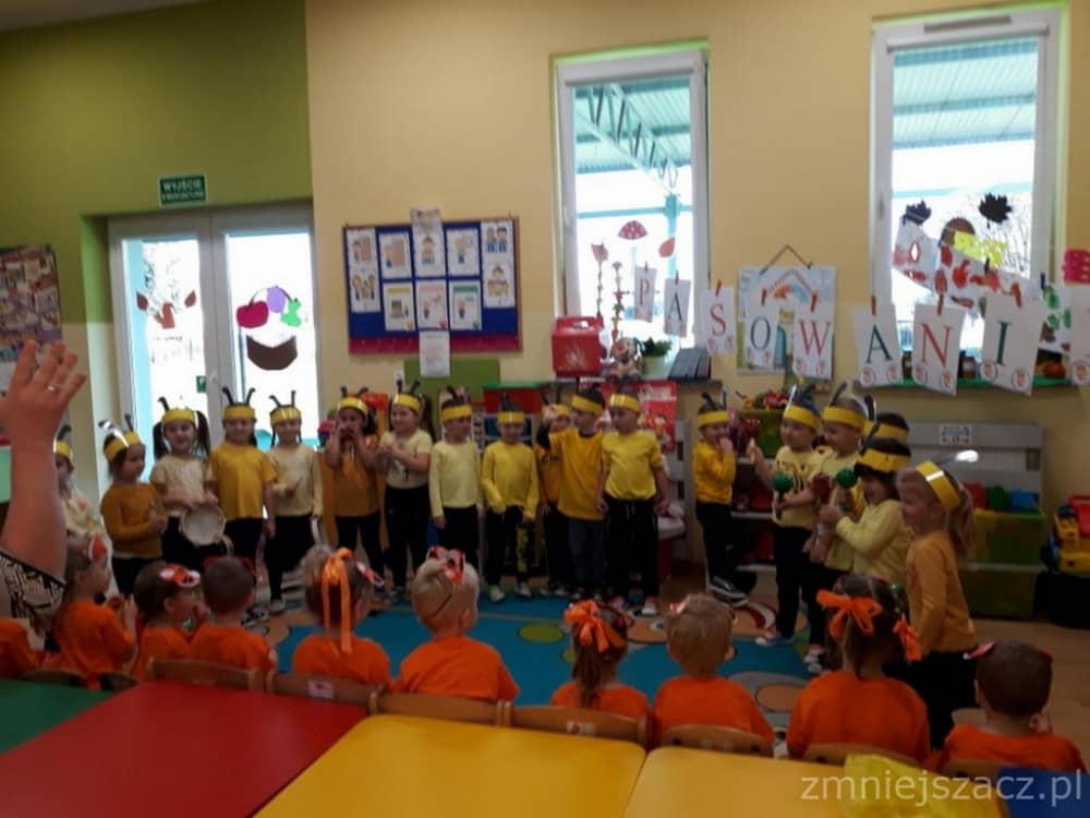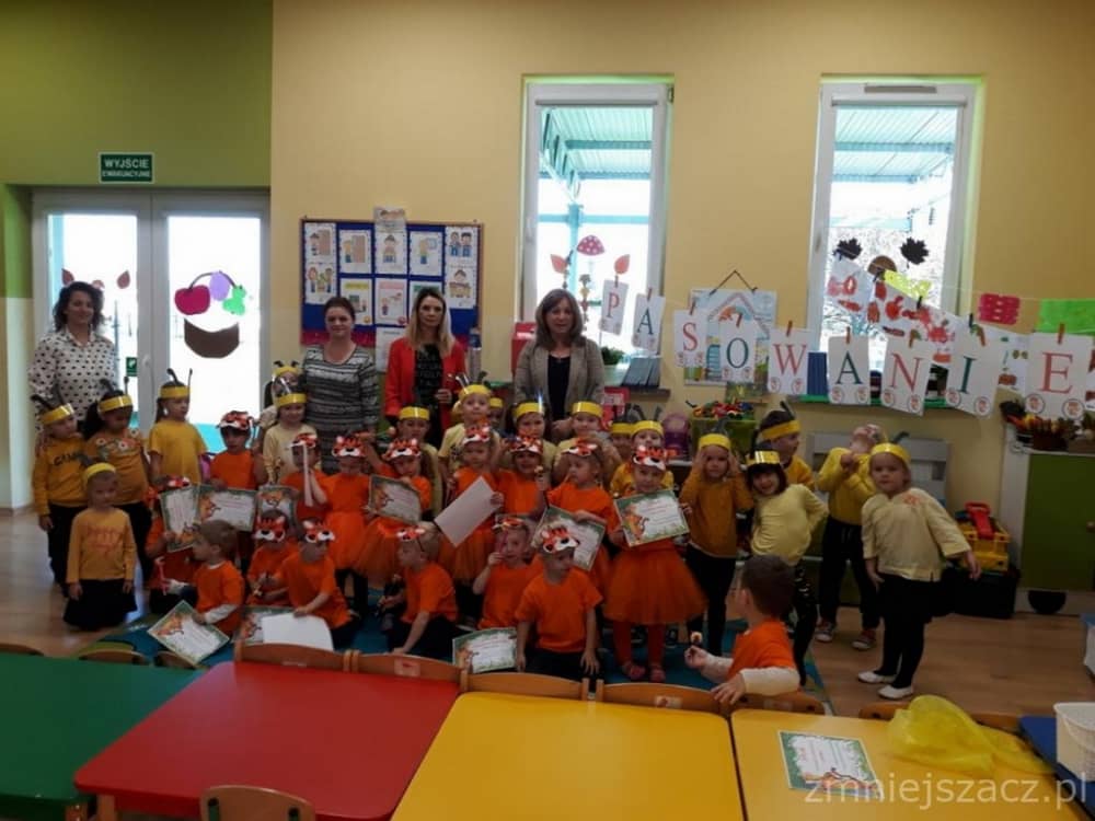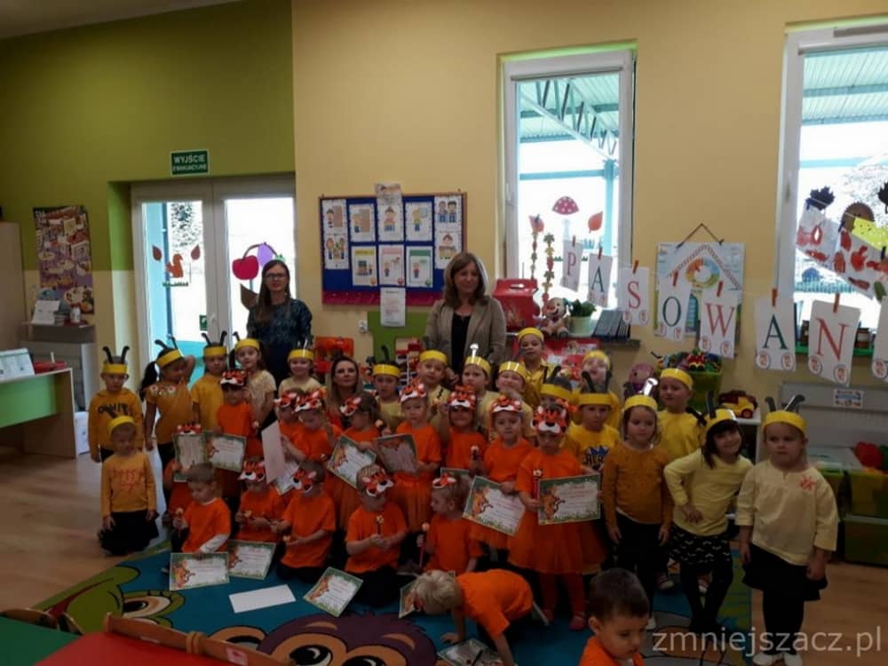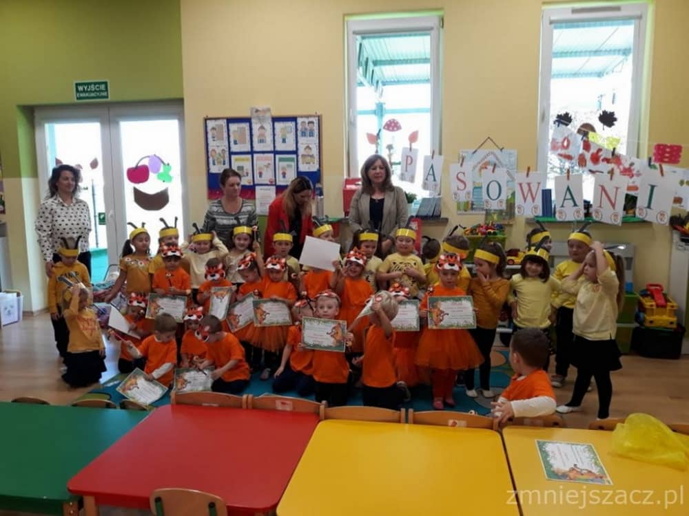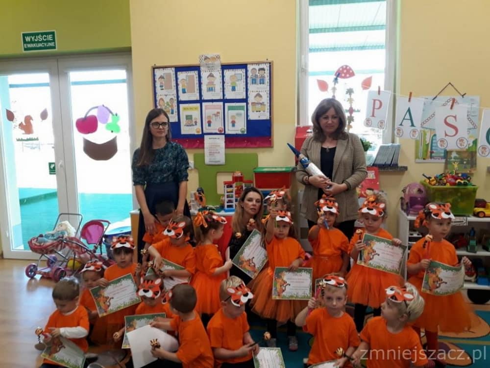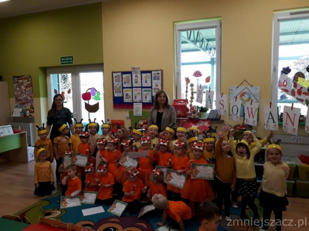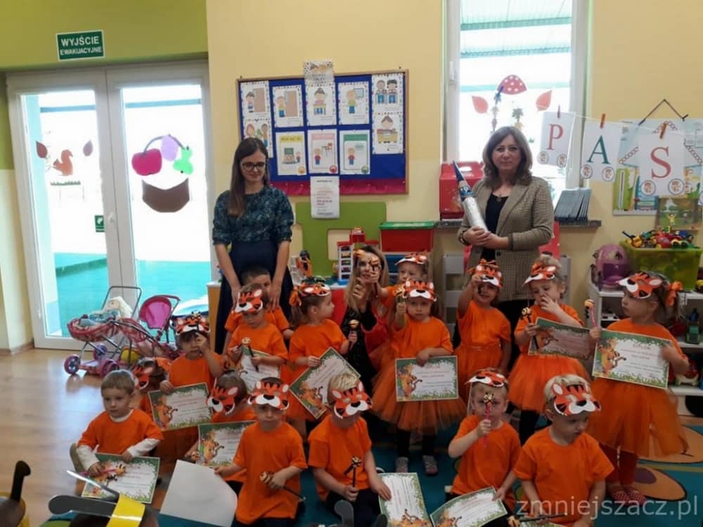 Dnia 11.10. 2019 roku odbyła się uroczystość Pasowania na Przedszkolaka. Nasze maluchy zostały pasowane przez Panią Dyrektor na dzielne "Tygryski" w oddziale przedszkolnym przy Szkole Podstawowej im. J. Długosza w Piekarach. Od początku roku przygotowywały repertuar piosenek "Kto to taki?", "Jestem zuch", Zróbmy duże koło". Zatańczyły dla nas jesienny "Taniec z liściem" oraz "Taniec tygrysków" do mel. J. Straussa "Polka Trisch Trasch". Ogromne podziękowania kieruję w stronę Rodziców obu grup przedszkolnych za ogromne zaangażowanie z okazji tego wydarzenia. Dziękuję za upieczenie ciast, zakup owoców i soków: Pani Marii - mamie Janinki, Pani Agacie - mamie Weroniki, Pani Paulinie - mamie Piotrusia, Pani Annie - mamie Karinki, Pani Weronice - mamie Leny P. oraz Pani Katarzynie - mamie Marcela. Wszystkim Rodzicom z grupy Tygrysków dziękuję za zakup koszulek i masek dla dzieci. Dziękuję mamie Zosi L. za wypożyczenie spódniczek na pasowanie. Dziękuję wszystkim Paniom za pomoc w organizacji, przygotowaniu dzieci z grupy starszej do śpiewu autorskiej piosenki na mel. "Pszczółka Maja", przebranie się za pracowite pszczółki oraz wykonanie upominków dla dzieci.