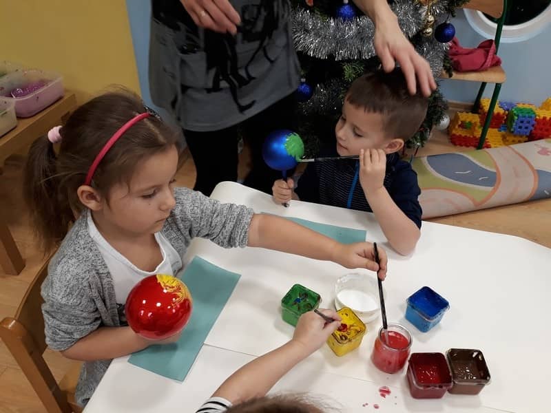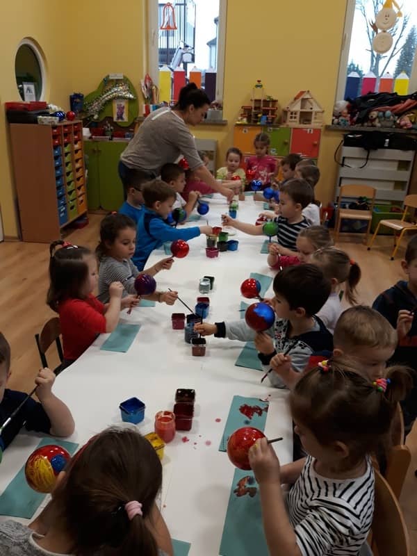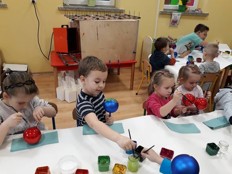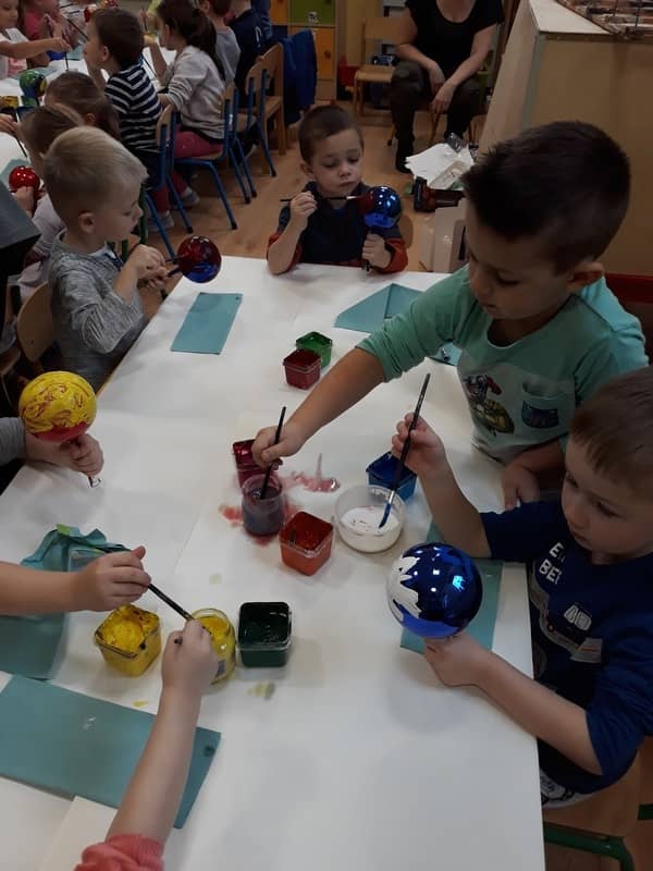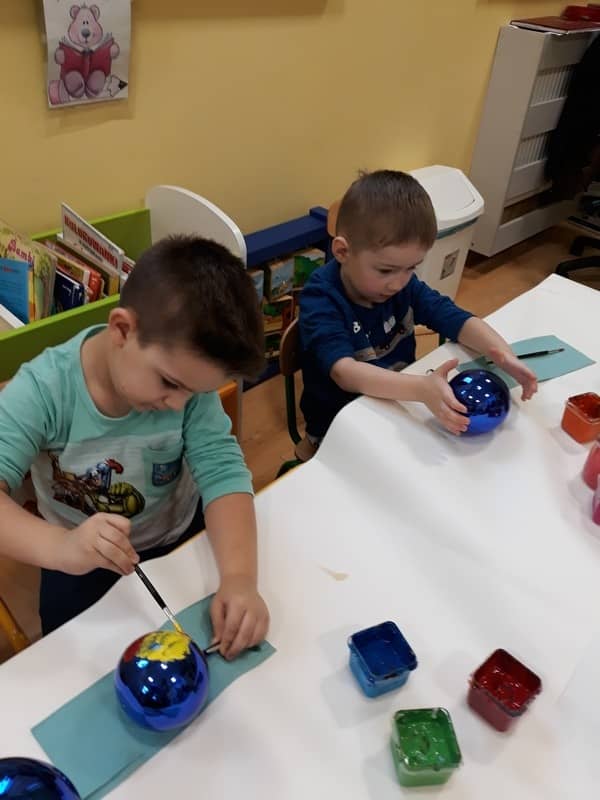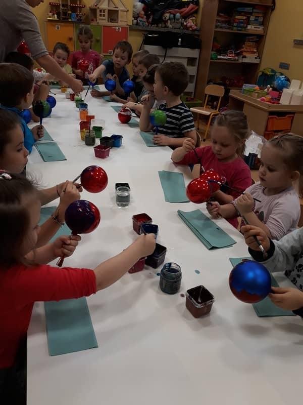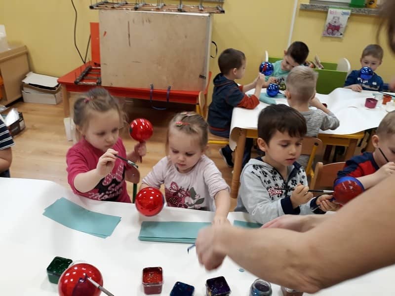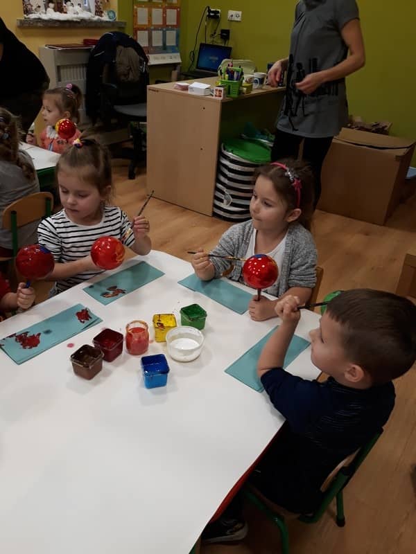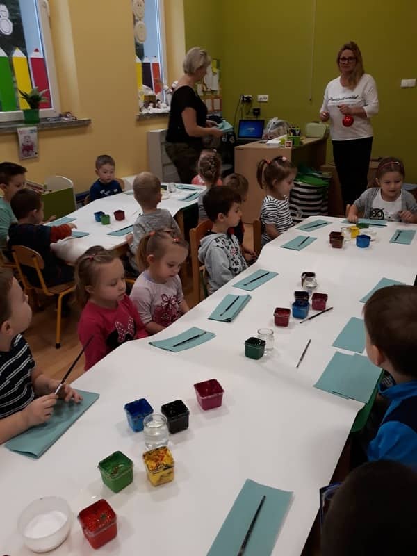 W dniu 14 grudnia 2017 roku w naszym przedszkolu zorganizowane zostały warsztaty Bożonarodzeniowe dla dzieci z grypy „Tygryski” oraz „Pracowite pszczółki”. Celem warsztatów było wykonanie prezentu z okazji Świąt Bożego Narodzenia .Przedszkolaki malowały bombki , wykazując się przy tym pomysłowością i kreatywnością. Był to naprawdę mile spędzony czas, podczas którego dzieci wspólnie pracowały oraz dobrze się przy tym bawiły. Piękne bombki wykonane przez dzieci na pewno ozdobią choinki w ich domach.