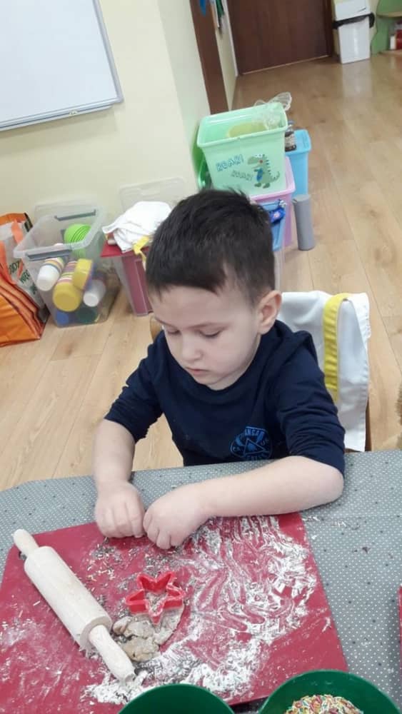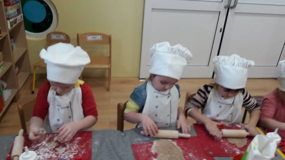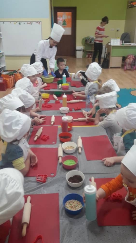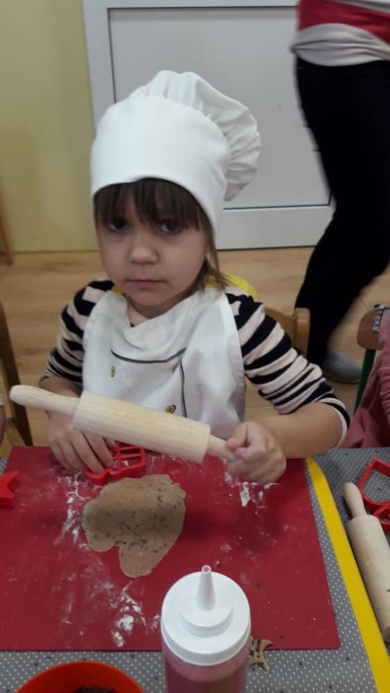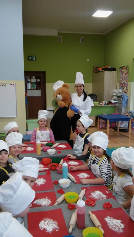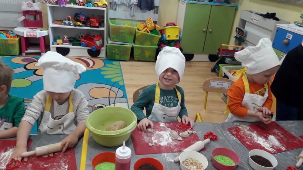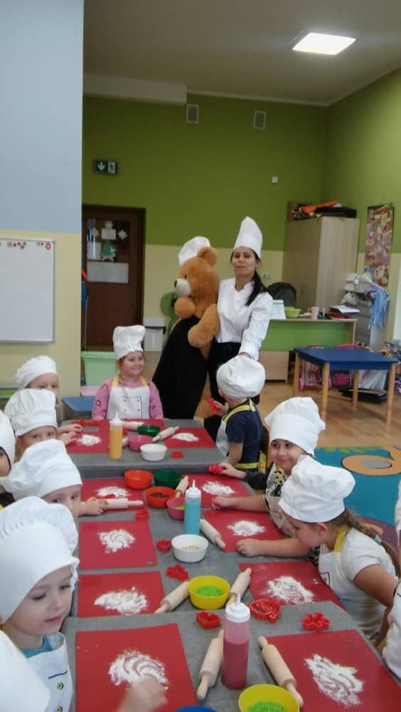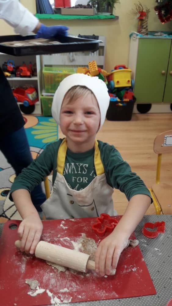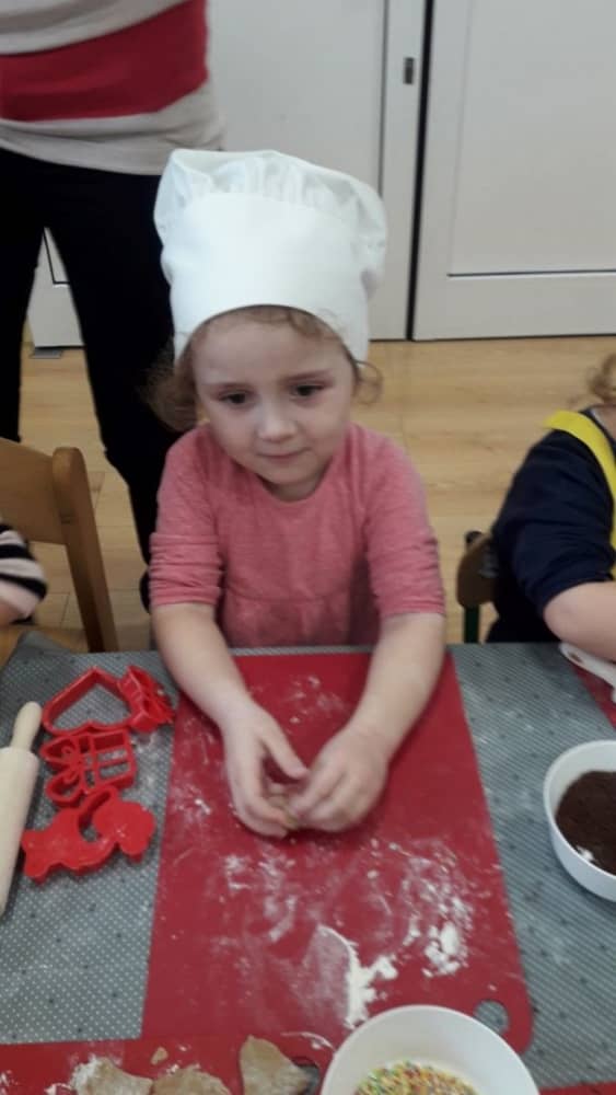 9 grudnia na długo pozostanie w pamięci przedszkolaków. Wszystko za sprawą pani Natalii, cukiernika z firmy Little Cook, która wprowadziła nas w prawdziwie świąteczny nastrój. Pani cukiernik przedstawiając dzieciom swojego pomocnika Misia Kuchcika, zaprosiła przedszkolaków do spróbowania swoich sił w niecodziennym zajęciu. Po założeniu fartuszków i czapeczek kucharza na przedszkolaki padł magiczny świąteczny czar. Za sprawą korzennych zapachów, które zapanowały w całym przedszkolu i zdolności maluchów, spod wałków na tackach zaczęły się pojawiać pierniczki w przepięknych świątecznych kształtach. Upieczone gwiazdeczki, renifery, bałwanki, dzwoneczki itp. zostały przez dzieci polukrowane i ozdobione kolorowymi posypkami. Smakowały wyśmienicie, dlatego dzieci poprosiły o przepisy dla swoich mam i obiecały upiec z nimi takie pyszności na święta. Każdy przedszkolak w nagrodę za swoją pracę otrzymał dyplom i naklejkę super kuchcika.