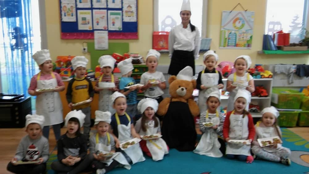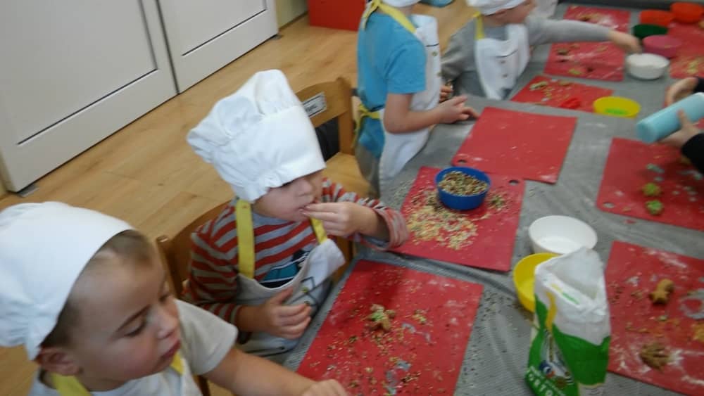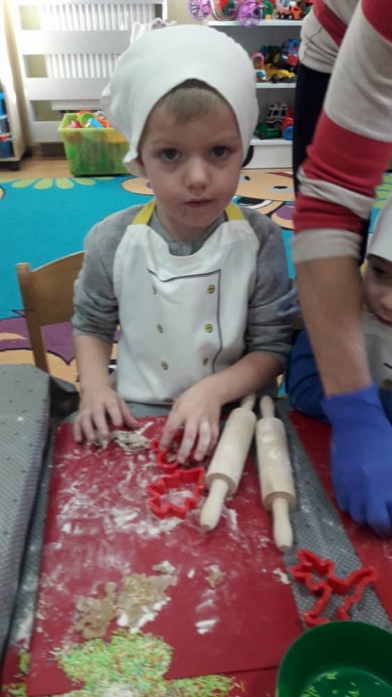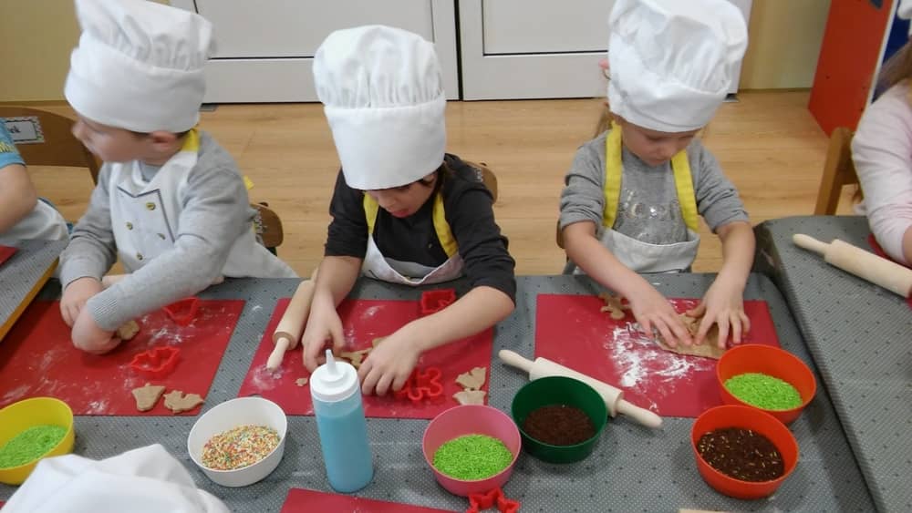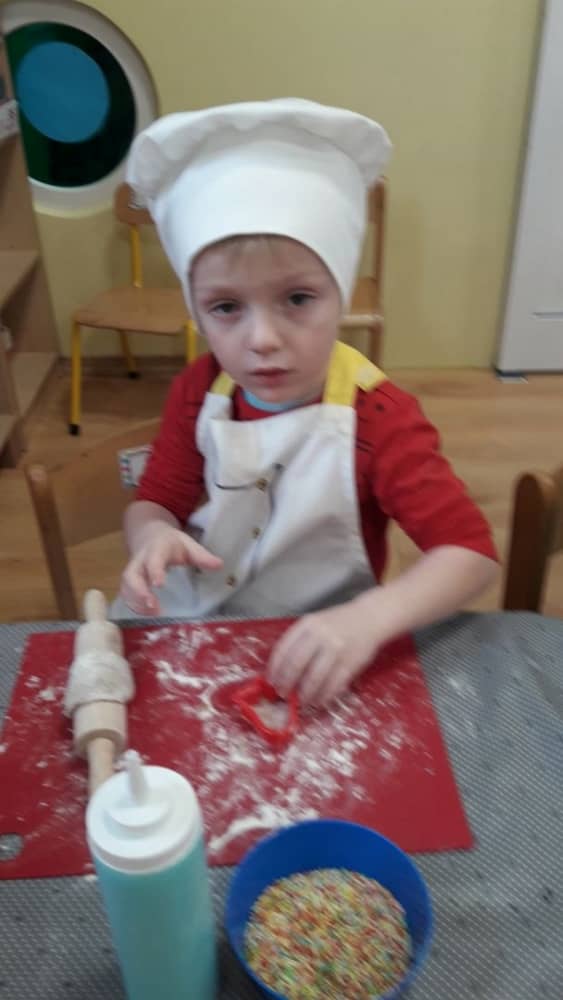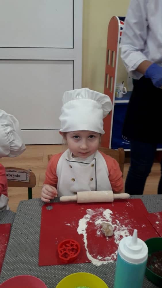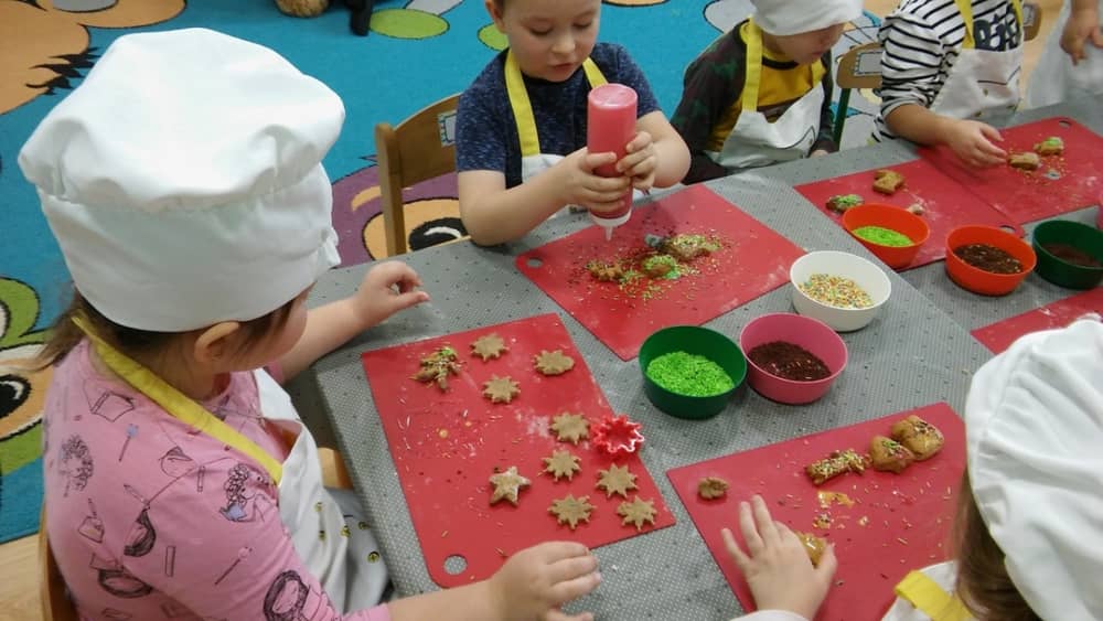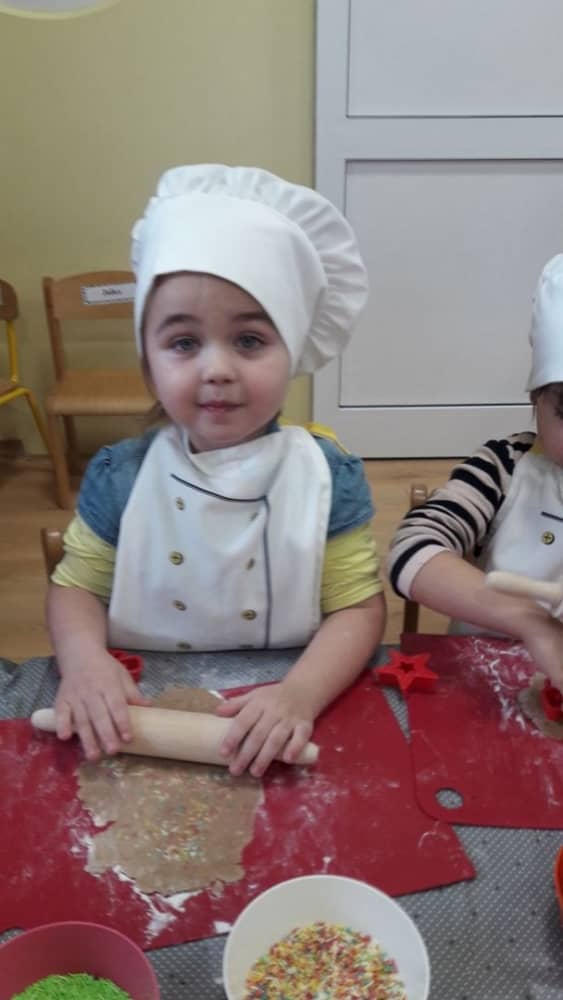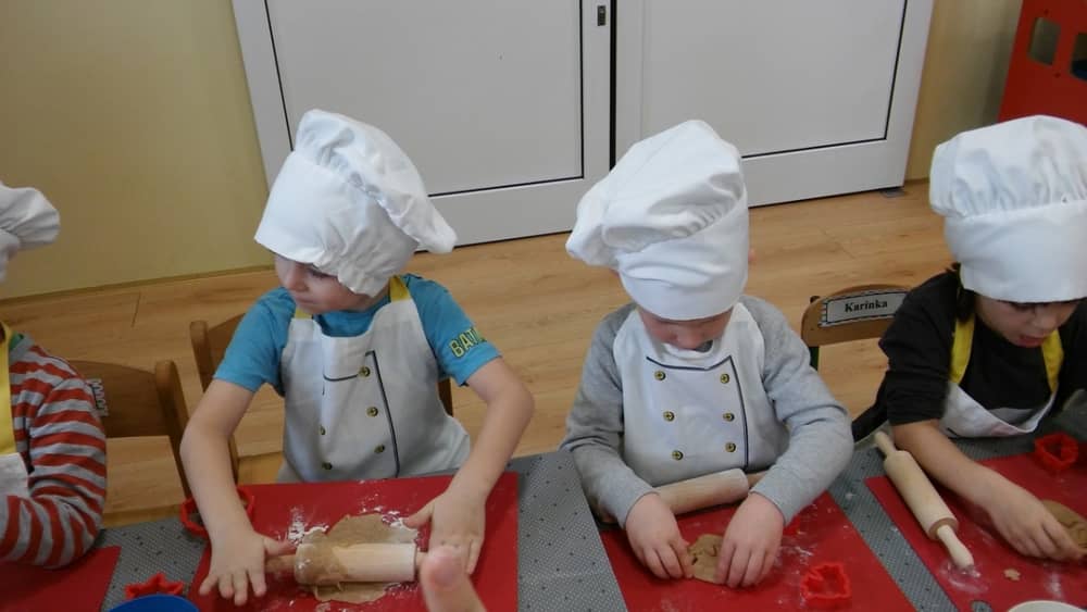 9 grudnia na długo pozostanie w pamięci przedszkolaków. Wszystko za sprawą pani Natalii, cukiernika z firmy Little Cook, która wprowadziła nas w prawdziwie świąteczny nastrój. Pani cukiernik przedstawiając dzieciom swojego pomocnika Misia Kuchcika, zaprosiła przedszkolaków do spróbowania swoich sił w niecodziennym zajęciu. Po założeniu fartuszków i czapeczek kucharza na przedszkolaki padł magiczny świąteczny czar. Za sprawą korzennych zapachów, które zapanowały w całym przedszkolu i zdolności maluchów, spod wałków na tackach zaczęły się pojawiać pierniczki w przepięknych świątecznych kształtach. Upieczone gwiazdeczki, renifery, bałwanki, dzwoneczki itp. zostały przez dzieci polukrowane i ozdobione kolorowymi posypkami. Smakowały wyśmienicie, dlatego dzieci poprosiły o przepisy dla swoich mam i obiecały upiec z nimi takie pyszności na święta. Każdy przedszkolak w nagrodę za swoją pracę otrzymał dyplom i naklejkę super kuchcika.