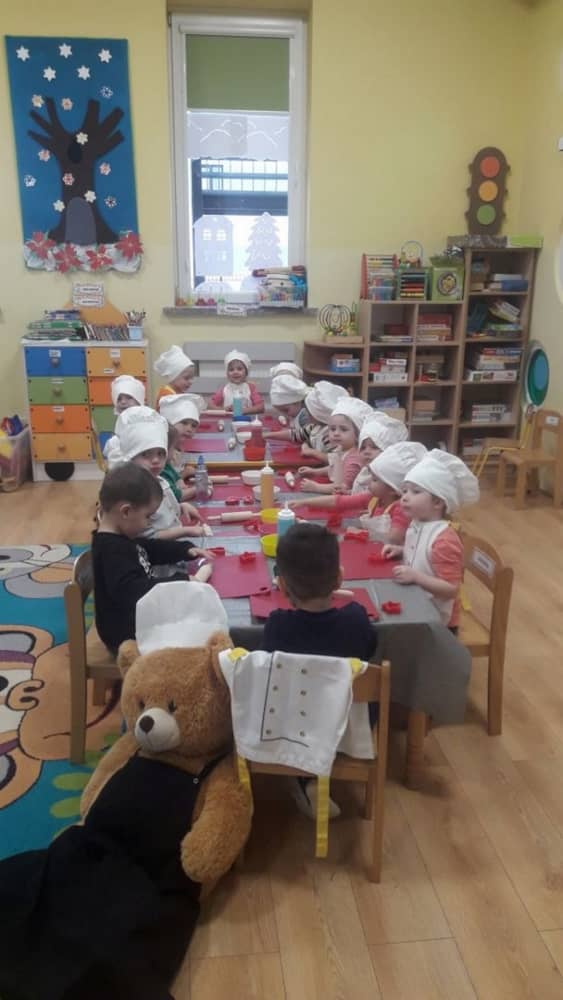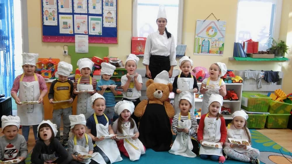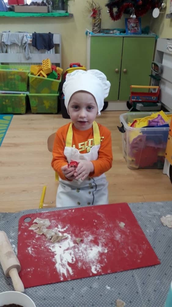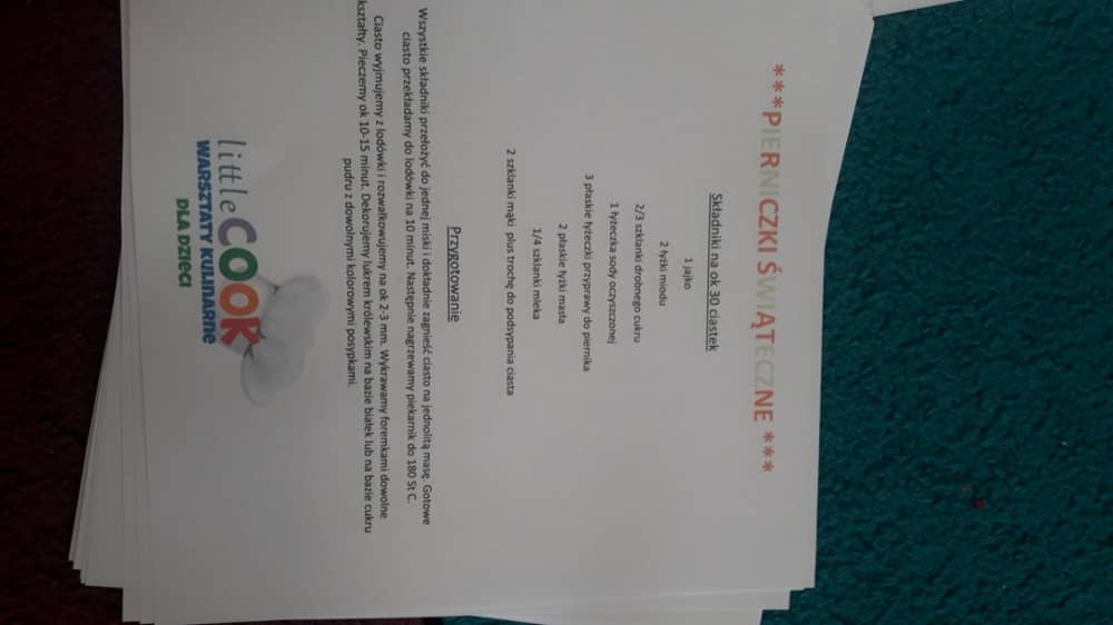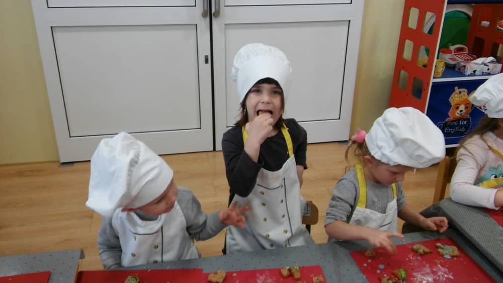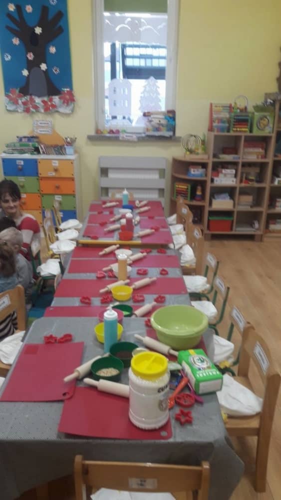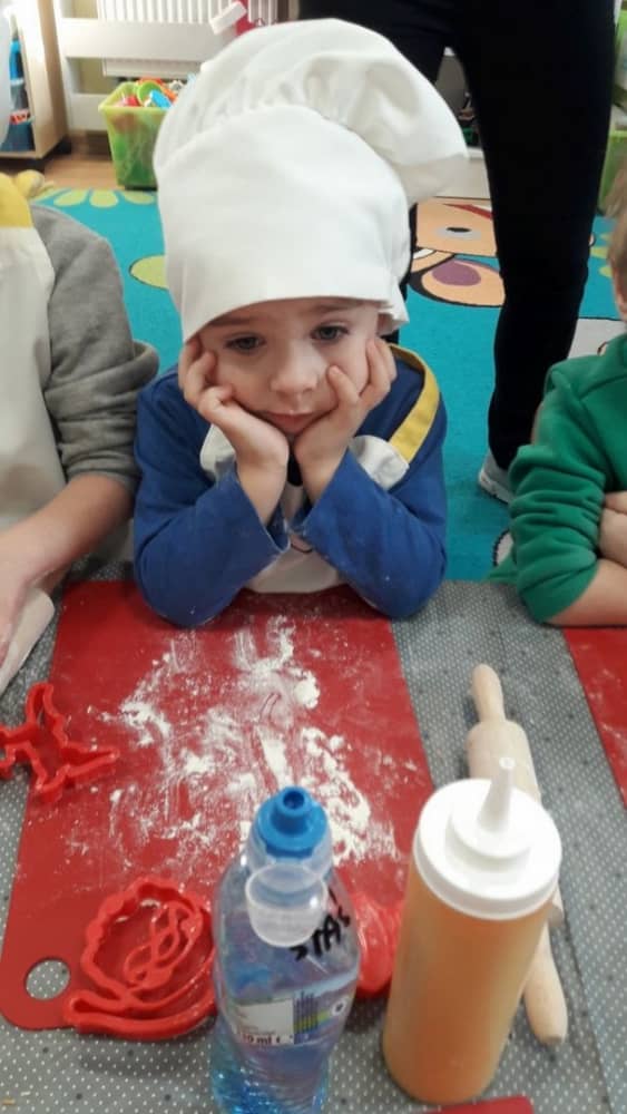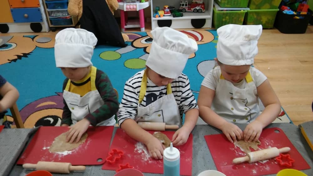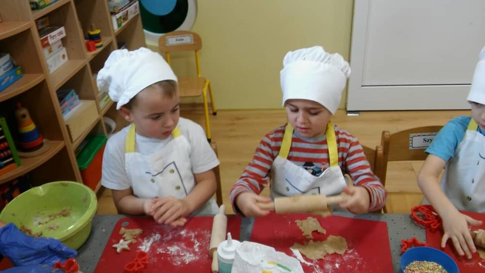 9 grudnia na długo pozostanie w pamięci przedszkolaków. Wszystko za sprawą pani Natalii, cukiernika z firmy Little Cook, która wprowadziła nas w prawdziwie świąteczny nastrój. Pani cukiernik przedstawiając dzieciom swojego pomocnika Misia Kuchcika, zaprosiła przedszkolaków do spróbowania swoich sił w niecodziennym zajęciu. Po założeniu fartuszków i czapeczek kucharza na przedszkolaki padł magiczny świąteczny czar. Za sprawą korzennych zapachów, które zapanowały w całym przedszkolu i zdolności maluchów, spod wałków na tackach zaczęły się pojawiać pierniczki w przepięknych świątecznych kształtach. Upieczone gwiazdeczki, renifery, bałwanki, dzwoneczki itp. zostały przez dzieci polukrowane i ozdobione kolorowymi posypkami. Smakowały wyśmienicie, dlatego dzieci poprosiły o przepisy dla swoich mam i obiecały upiec z nimi takie pyszności na święta. Każdy przedszkolak w nagrodę za swoją pracę otrzymał dyplom i naklejkę super kuchcika.