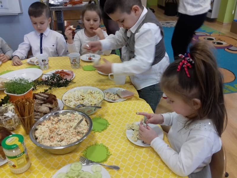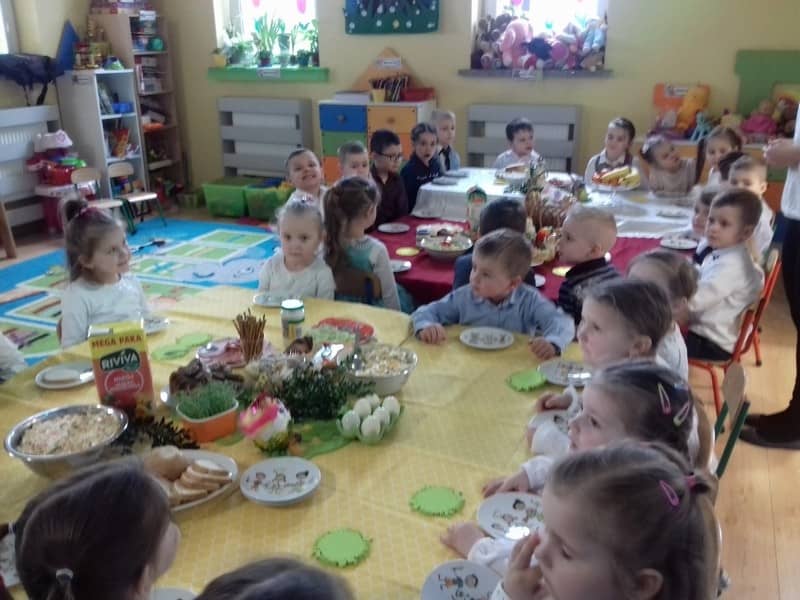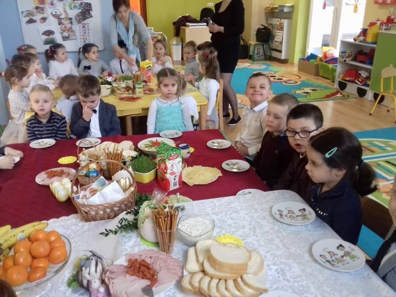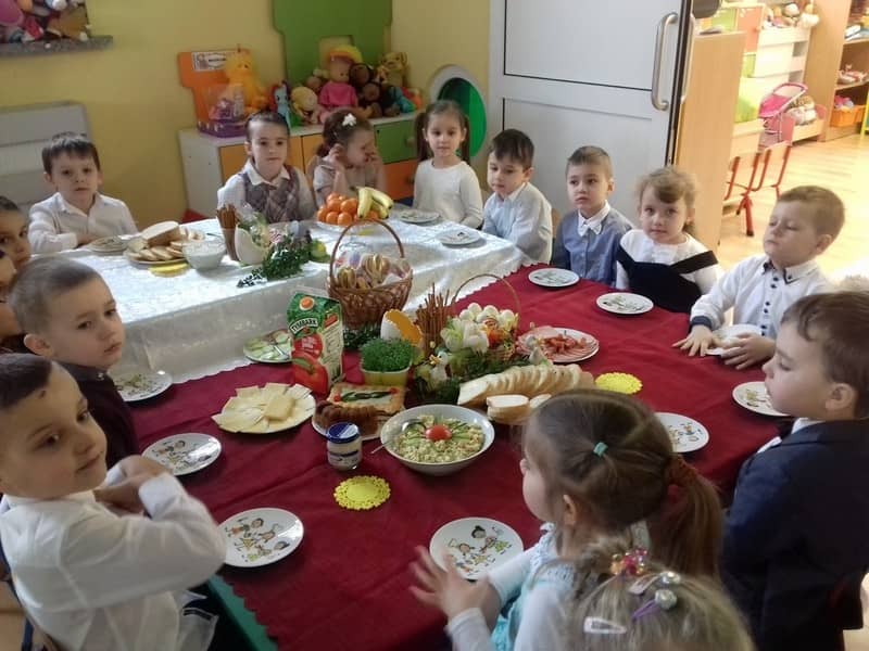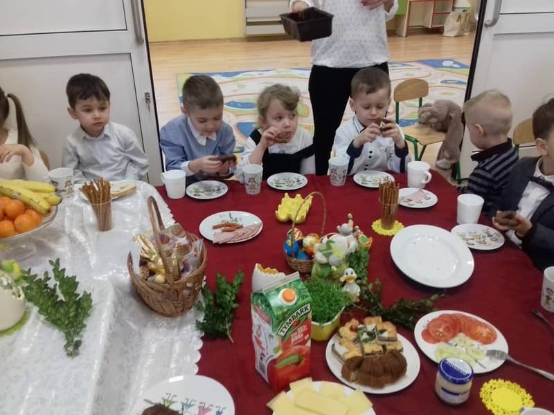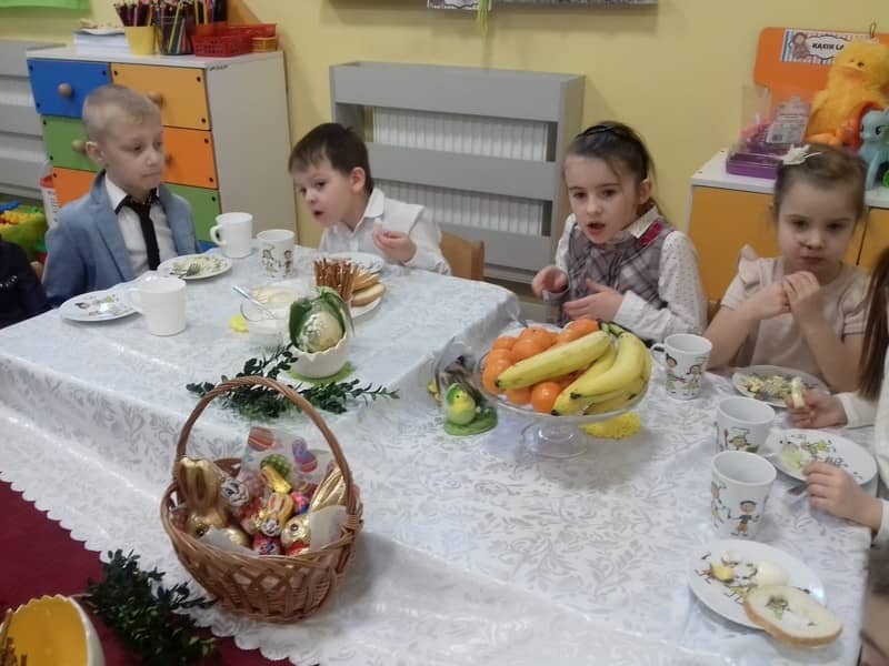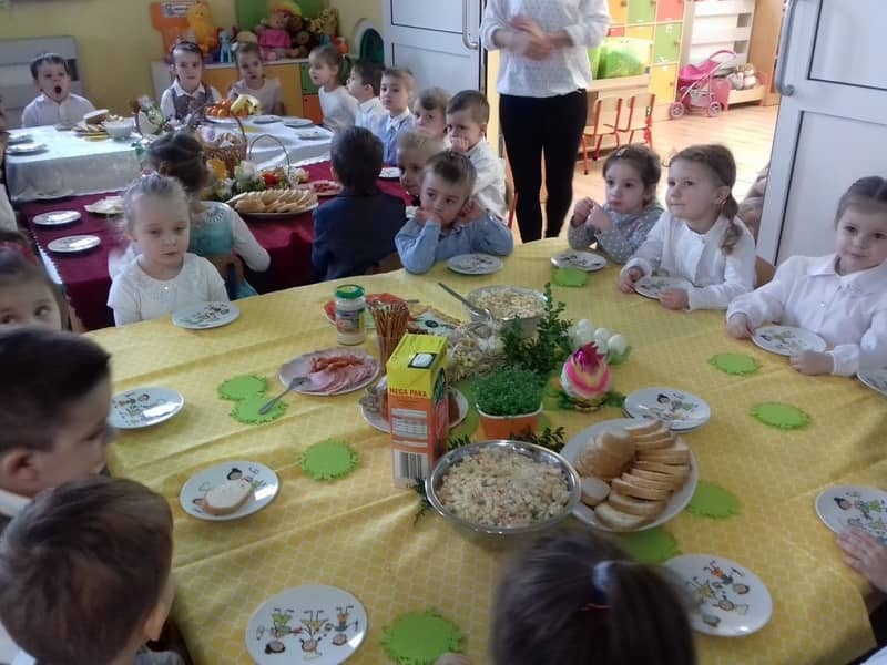 W dniu 28.03.2018 w naszym przedszkolu odbyło się Uroczyste Wielkanocne Śniadanie. Wszystkie dzieci wraz z nauczycielami i opiekunami usiadły przy suto zastawionym stole, pełnym nie tylko smakowitych, ale przede wszystkim tradycyjnych wielkanocnych potraw. Dzięki zaangażowaniu Rodziców w przygotowywanie potraw, dzieci mogły poczuć zbliżające się święta. W tym dniu dzieci również wręczyły swoim rodzicom wykonane przez siebie upominki z okazji Świąt Wielkanocnych.