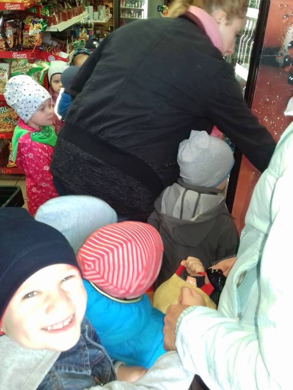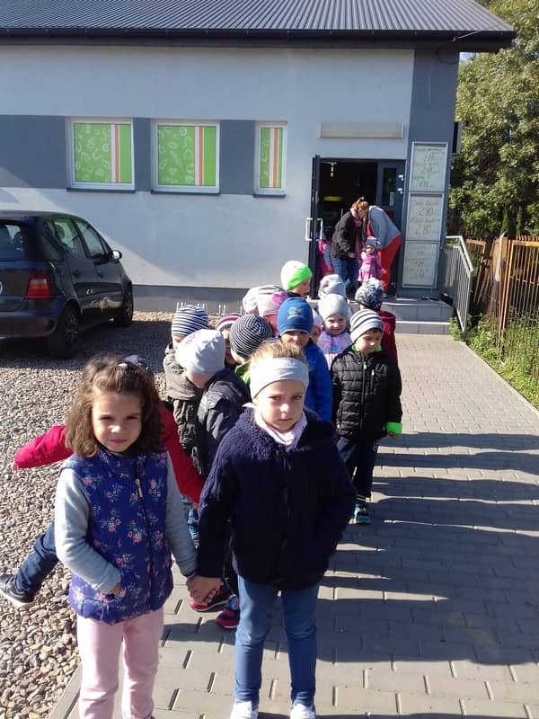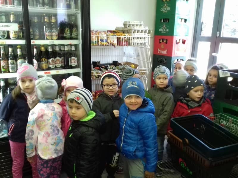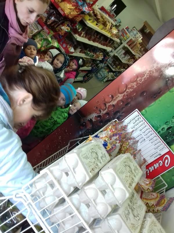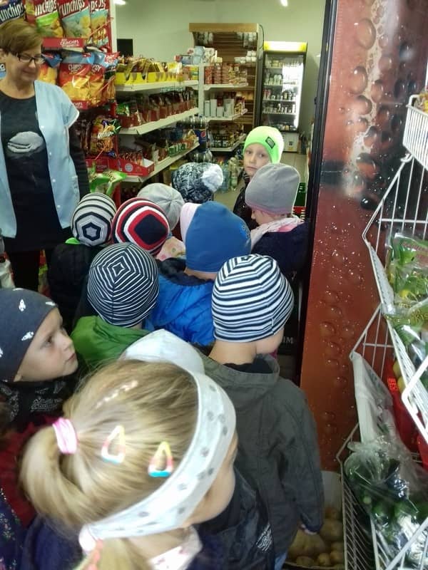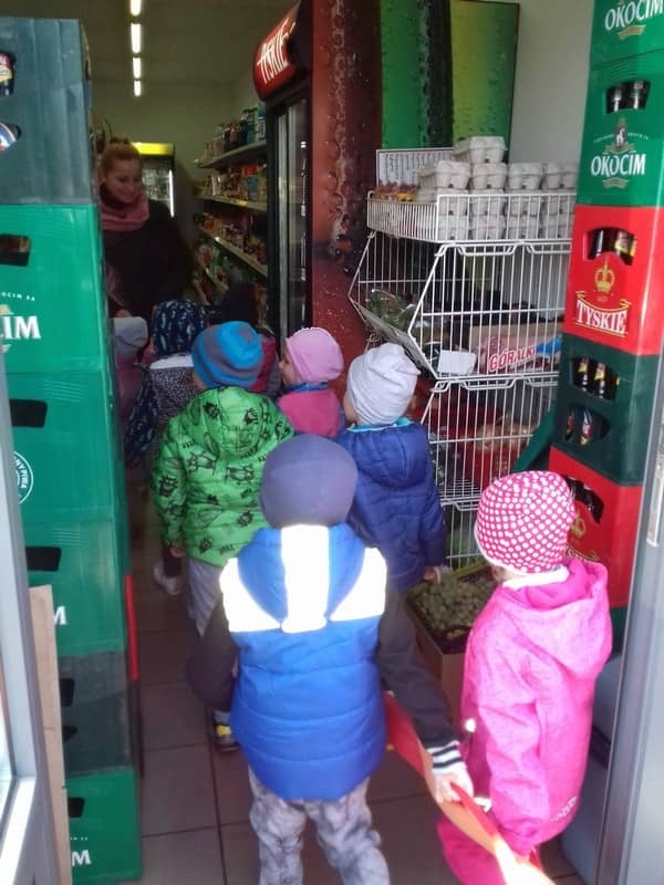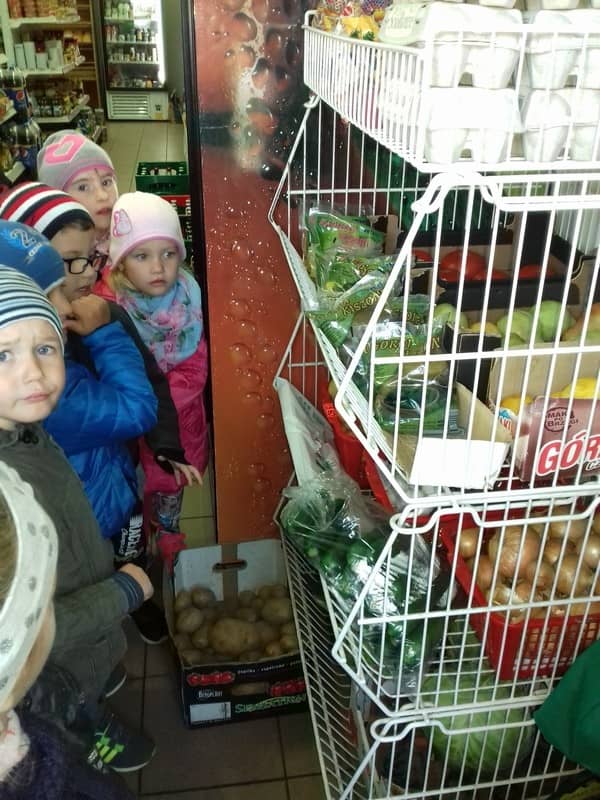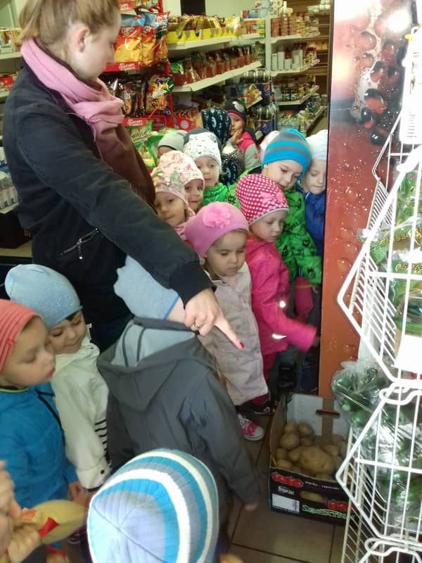 W pierwszym tygodniu października obie grupy przedszkolne - Pszczółki i Tygryski, wybrały się na wycieczkę do pobliskiego sklepu, by zwiedzić dział owocowo - warzywny. Dzieci wskazywały i nazywały owoce. Przy okazji przypomniały sobie o zasadach kulturalnego zachowania się w sklepie i używania zwrotów grzecznościowych w stosunku do pracowników sklepu.