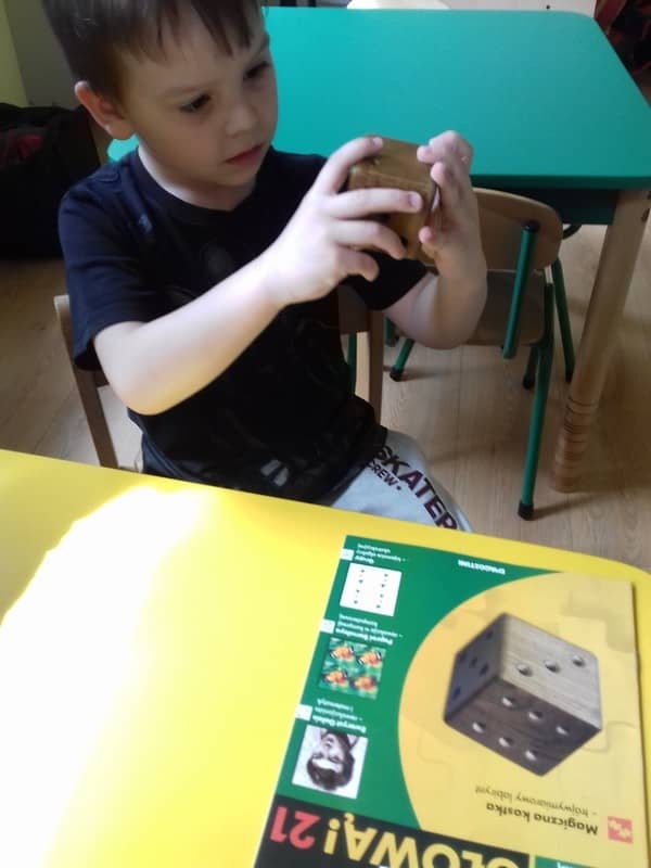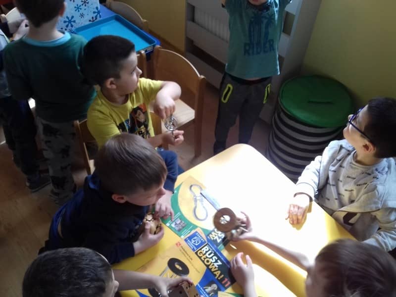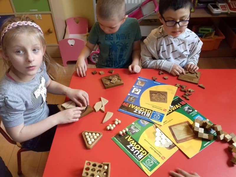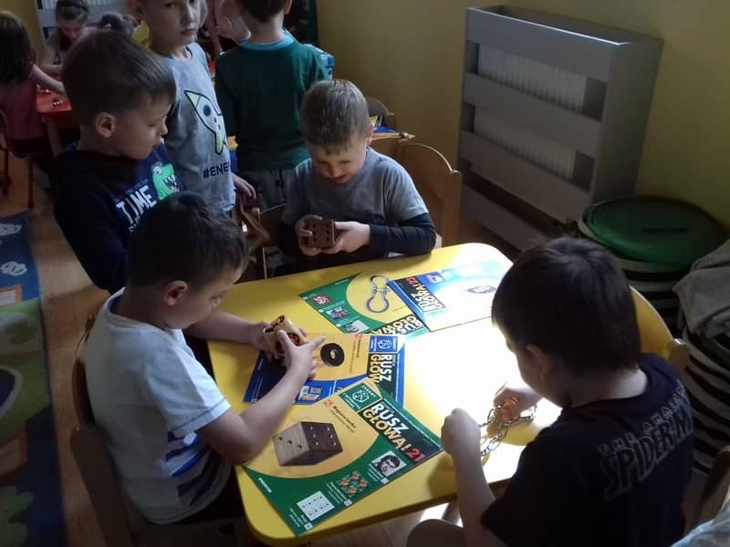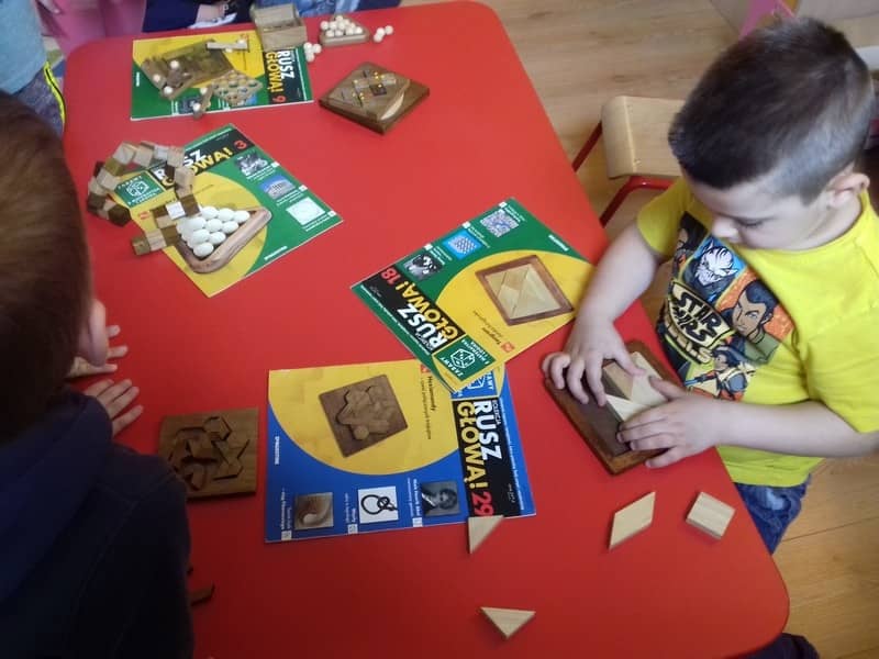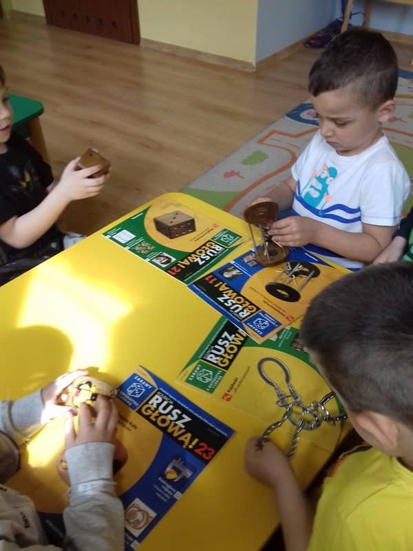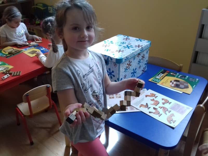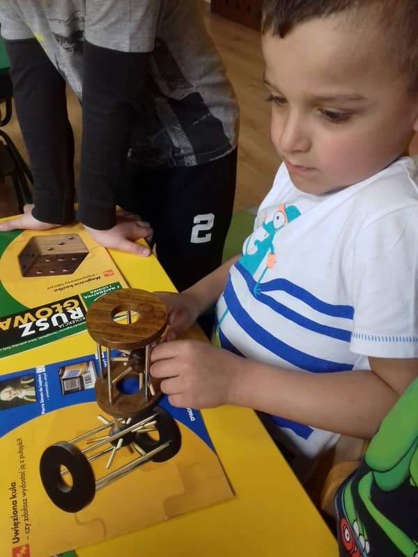 Dzieci swobodnie manipulowały przedmiotami i kierując się wskazówkami nauczyciela próbowały rozwiązać niemożliwe na pierwszy rzut oka zagadki. Kilkoro dzieci odniosło wielki sukces. Największym jednak zaskoczeniem było to, że po godzinie wytężonej pracy, dzieci wciąż podejmowały kolejne wyzwania. Miały do dyspozycji poprzednie łamigłówki. Na zajęciach można było dostrzec postępy wielu dzieci, a przede wszystkim radość, jaką im przynosi ta forma zabawy.