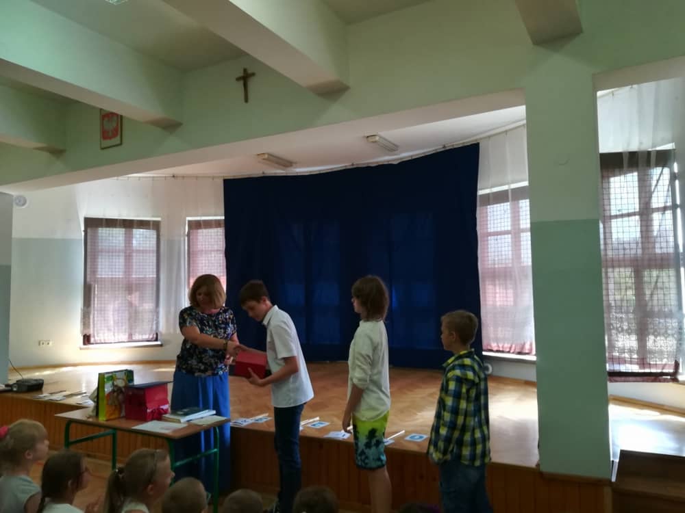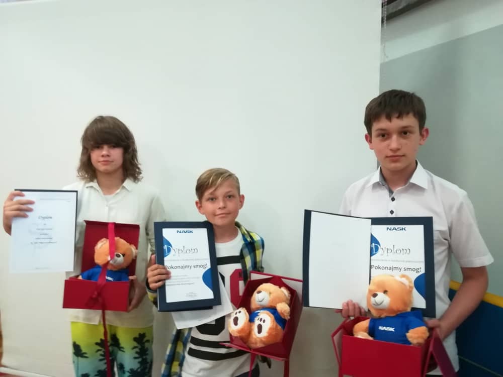 Marcin Szczurek z kl. V, Patrycja Kozioł z kl. VI oraz Paweł Lelek z kl. VII z rąk Pani Dyrektor w czasie apelu podsumowujacego rok szkolny otrzymali nagrody z Warszawy. Uczniowie wykonali piękne prace na konkurs w projekcie pilotażowym Edukacyjna Sieć Antysmogowa organizowanym przez Naukową i Akademicką Sieć Komputerową - Państwowy Instytut Badawczy.