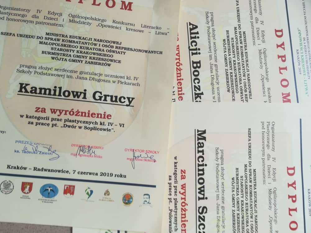 W IV Edycji Ogólnopolskiego Konkursu Literacko - Plastycznego dla dzieci i młodzieży "Opowieści kresowe - Litwa" Kraków 2019 uczniowie ze Szkoły Podstawowej im. Jana Długosza w Piekarach zdobyli wiele nagród w kategorii literackiej i plastycznej.
