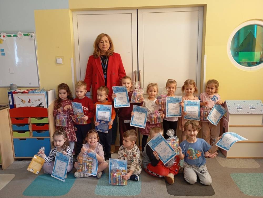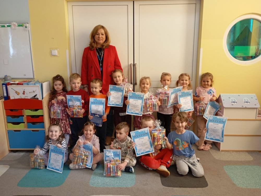Dziś w najmłodszych oddziałach przedszkolnych Pani Dyrektor wręczyła dzieciom uczestniczącym w konkursie plastycznym pamiątkowe dyplomy i upominki przygotowane przez rodziców. Tematem konkursu było Królestwo Pani Zimy. Bardzo cieszymy się i dziękujemy wszystkim zaangażowanym rodzicom i dzieciom.
