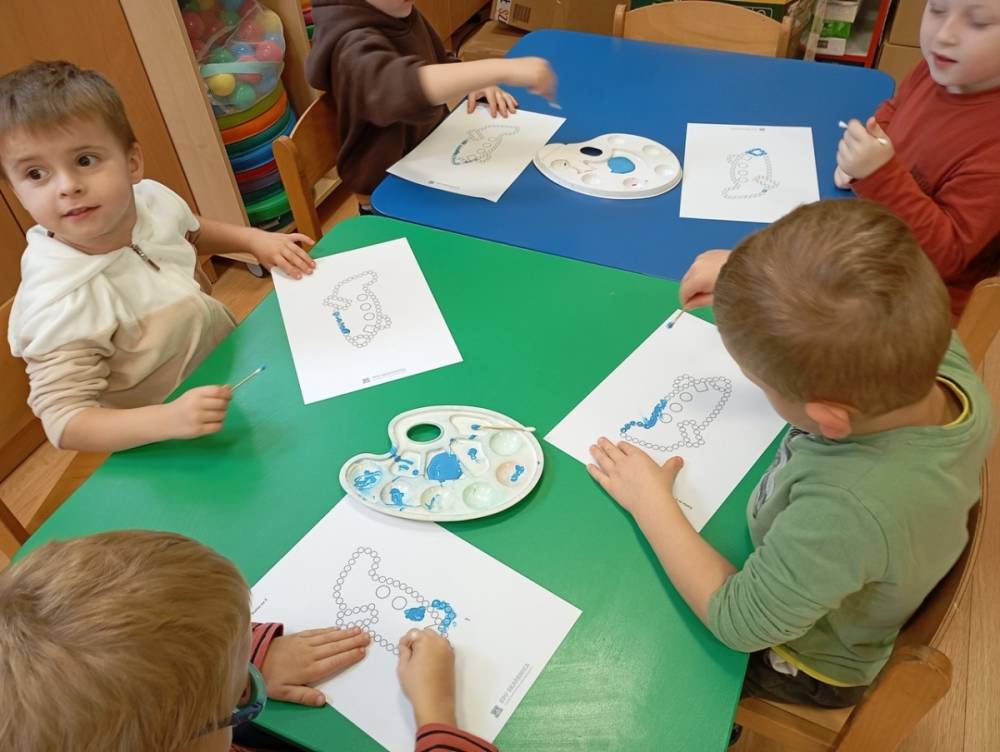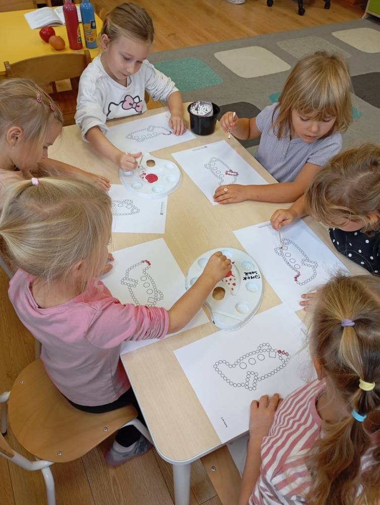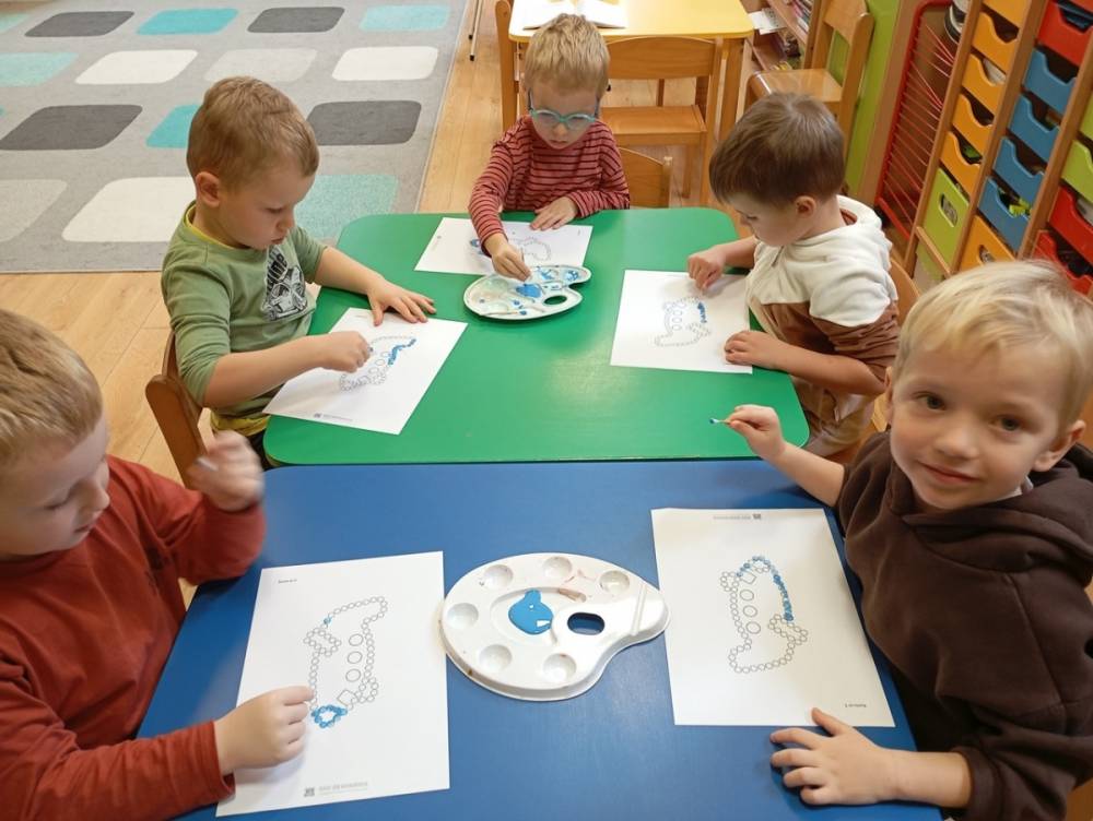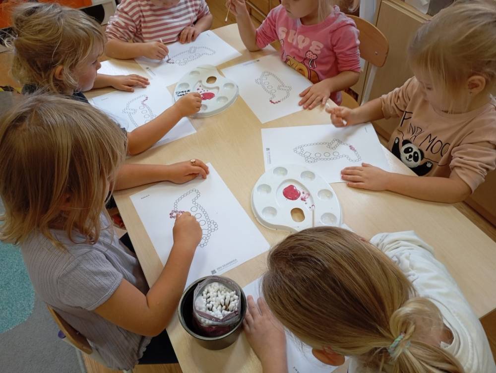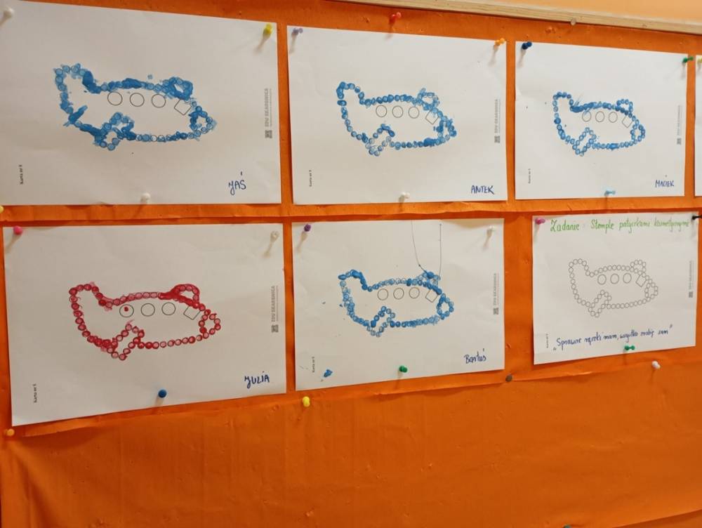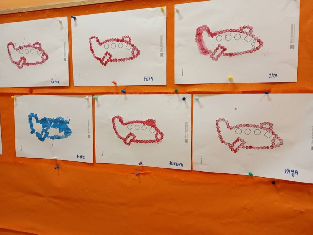 Realizując Innowację Pedagogiczną pt. "Sprawne rączki mam, wszystko zrobię sam", wykonaliśmy zadanie plastyczne z użyciem stempli. Dzieci bardzo chętnie odbijały zamoczone w farbie patyczki w watą i tworzyły kontur samolotu. To zadanie było dla wielu ciekawym wyzwaniem. Widoczne było na twarzach dzieci wielkie skupienie oraz radość tworzenia. Pamiętajmy, że wzmacnianie motoryki małej to jedno z ważniejszych zadań dla przyszłego ucznia szkoły...