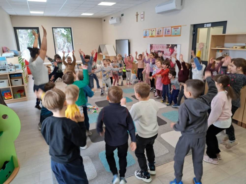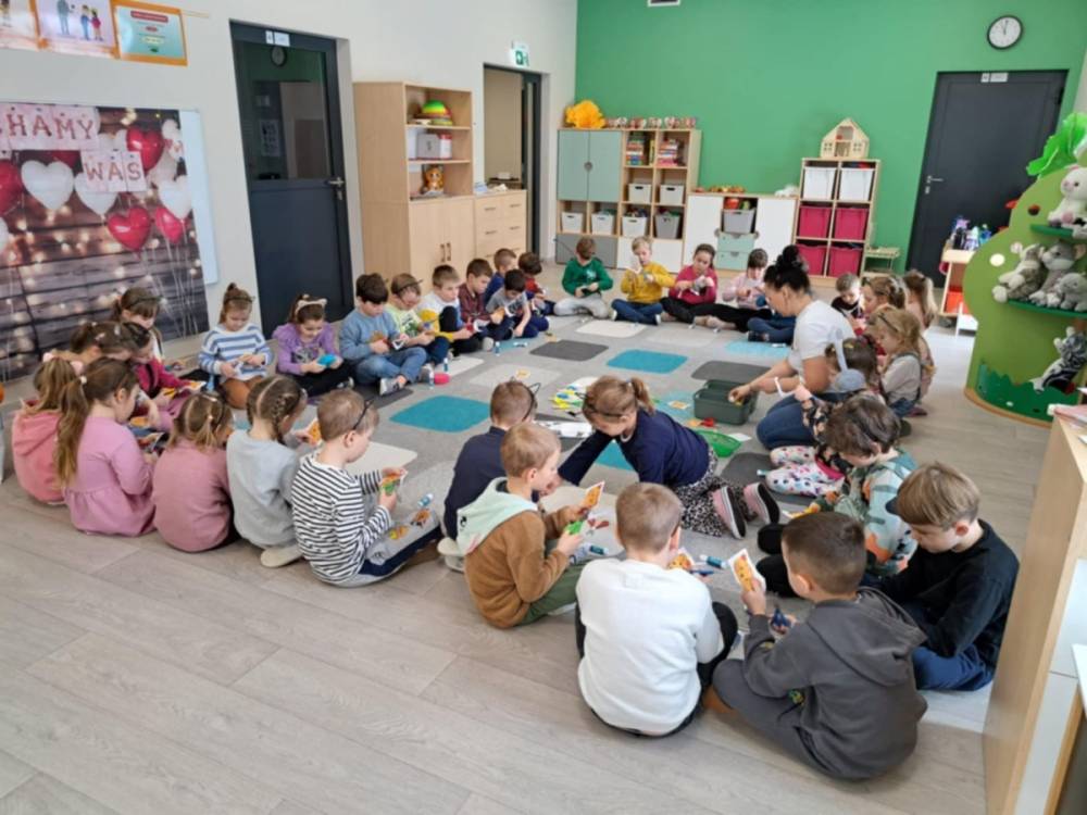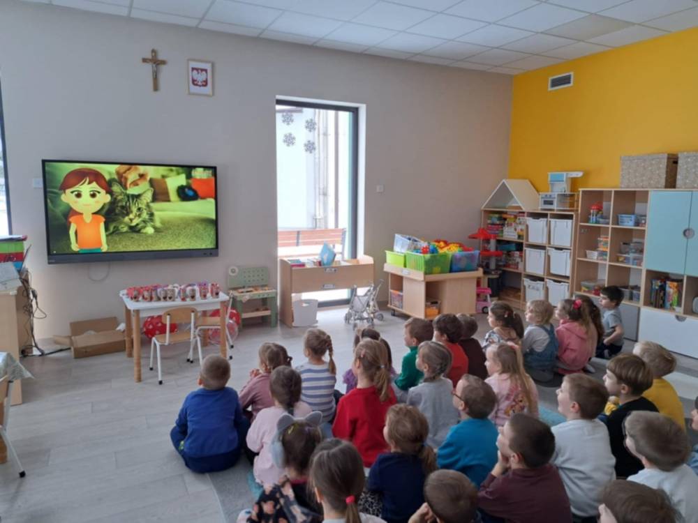 Dzieci poznały wiele interesujących informacji o kotach, rozmawiały o tym, jak dbać o zwierzęta oraz dlaczego warto być wobec nich opiekuńczym i wrażliwym. Nie zabrakło również kocich zabaw ruchowych, kocich rymowanek oraz pięknych prac inspirowanych naszymi mruczącymi przyjaciółmi.