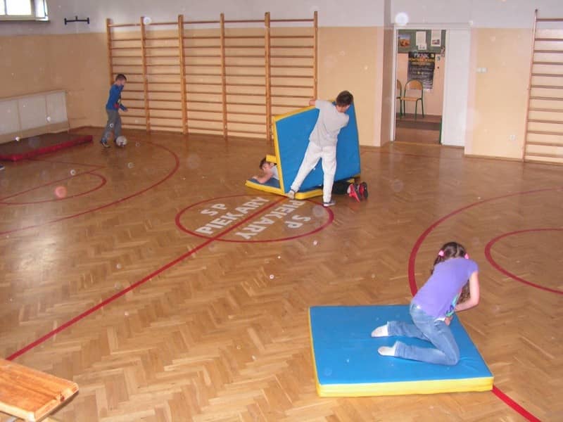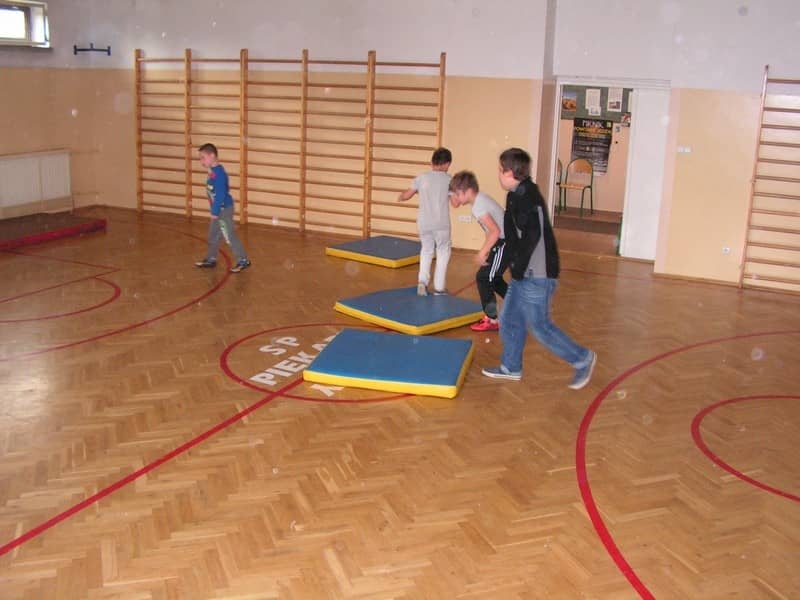 Na sali gimnastycznej ćwiczyliśmy z wykorzystaniem materaców i piłek.